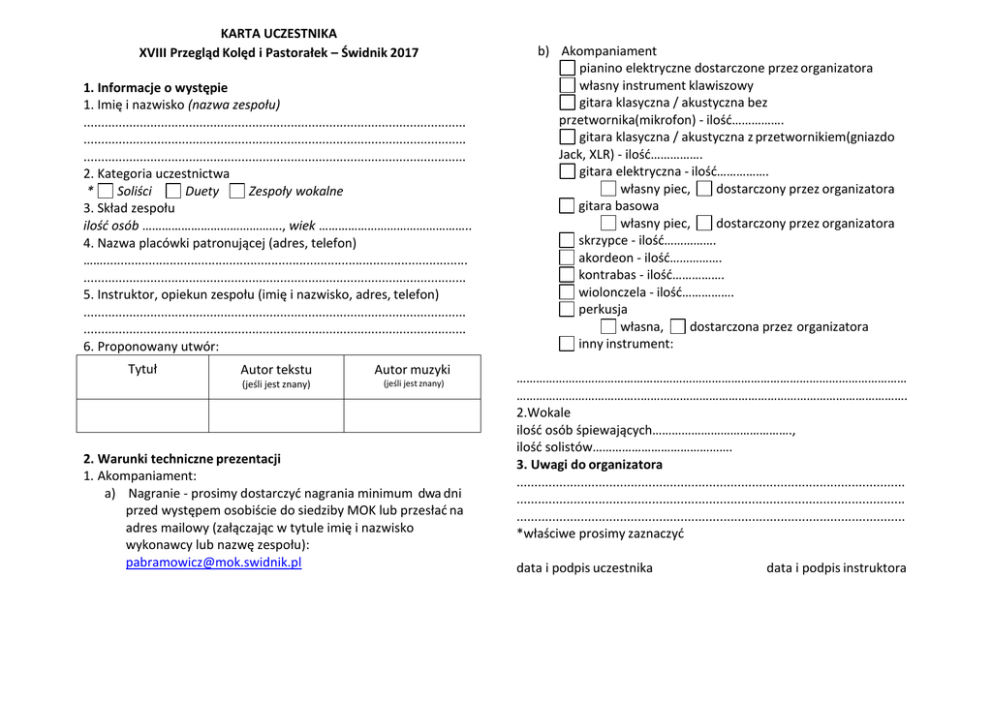 KARTA UCZESTNIKA XVIII Przegląd Kolęd i Pastorałek – Świdnik 2017 1. Informacje o występie 1. Imię i nazwisko (nazwa zespołu) ............................................................................................................. ............................................................................................................. ............................................................................................................. 2. Kategoria uczestnictwa * Soliści Duety Zespoły wokalne 3. Skład zespołu ilość osób ……………………………………., wiek ……………………………………….. 4. Nazwa placówki patronującej (adres, telefon) ……........................................................................................................ ............................................................................................................. 5. Instruktor, opiekun zespołu (imię i nazwisko, adres, telefon) ............................................................................................................. ............................................................................................................. 6. Proponowany utwór: Tytuł Autor tekstu Autor muzyki (jeśli jest znany) (jeśli jest znany) 2. Warunki techniczne prezentacji 1. Akompaniament: a) Nagranie - prosimy dostarczyć nagrania minimum dwa dni przed występem osobiście do siedziby MOK lub przesłać na adres mailowy (załączając w tytule imię i nazwisko wykonawcy lub nazwę zespołu): [email protected] b) Akompaniament pianino elektryczne dostarczone przez organizatora własny instrument klawiszowy gitara klasyczna / akustyczna bez przetwornika(mikrofon) - ilość……………. gitara klasyczna / akustyczna z przetwornikiem(gniazdo Jack, XLR) - ilość……………. gitara elektryczna - ilość……………. własny piec, dostarczony przez organizatora gitara basowa własny piec, dostarczony przez organizatora skrzypce - ilość……………. akordeon - ilość……………. kontrabas - ilość……………. wiolonczela - ilość……………. perkusja własna, dostarczona przez organizatora inny instrument: ………………………………………………………………………………………………………… ………………………………..………………………………………………………………………. 2.Wokale ilość osób śpiewających……………………………………., ilość solistów……………………………………. 3. Uwagi do organizatora ............................................................................................................. ............................................................................................................. ............................................................................................................. *właściwe prosimy zaznaczyć data i podpis uczestnika data i podpis instruktora