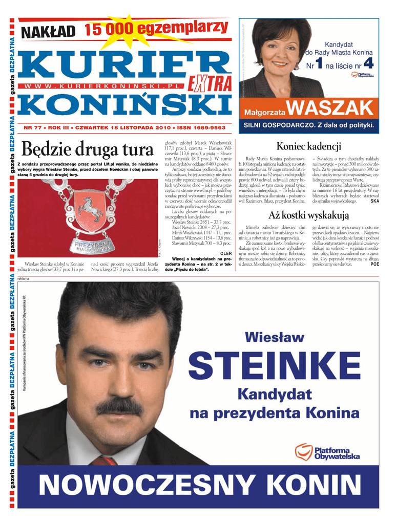 NR 77 ROK III CZWARTEK 18 LISTOPADA 2010 Będzie druga tura Z sondażu przeprowadzonego przez portal LM.pl wynika, że niedzielne wybory wygra Wiesław Steinke, przed Józefem Nowickim i obaj panowie staną 5 grudnia do drugiej tury. Fot. R. Olejnik gazeta BEZPŁATNA gazeta BEZPŁATNA gazeta BEZPŁATNA gazeta BEZPŁATNA gazeta BEZPŁATNA gazeta BEZPŁATNA y rz la p m ze g e 0 0 0 5 1 D ŁA K NA Wiesław Steinke zdobył w Koninie jedną trzecią głosów (33,7 proc.) i o poreklama nad sześć procent wyprzedził Józefa Nowickiego (27,3 proc.). Trzecią liczbę ISSN 1689-9563 głosów zdobył Marek Waszkowiak (17,1 proc.), czwartą – Dariusz Wilczewski (13,6 proc.), a piątą – Sławomir Matysiak (8,3 proc.). W sumie na kandydatów oddano 8460 głosów. Autorzy sondażu podkreślają, że to tylko zabawa, bo jej uczestnicy nie stanowią próby reprezentatywnej dla wszystkich wyborców, choć – jak można przeczytać na stronie www.lm.pl – podobny sondaż przed wyborami prezydenckimi w czerwcu dość wiernie odzwierciedlił rzeczywiste preferencje wyborcze. Liczba głosów oddanych na poszczególnych kandydatów: Wiesław Steinke 2851 – 33,7 proc. Józef Nowicki 2308 – 27,3 proc. Marek Waszkowiak 1447 – 17,1 proc. Dariusz Wilczewski 1154 – 13,6 proc. Sławomir Matysiak 700 – 8,3 proc. OLER Więcej o kandydatach na prezydenta Konina – na str. 2 w tekście „Pięciu do fotela”. Koniec kadencji Rady Miasta Konina podsumowała 10 listopada minioną kadencję na ostatnim posiedzeniu. W ciągu czterech lat rada obradowała na 52 sesjach, radni podjęli prawie 800 uchwał, uchwalili cztery budżety, zgłosili w tym czasie ponad tysiąc wniosków i interpelacji. – To była chyba najlepsza kadencja dla miasta –podsumował Kazimierz Pałasz, prezydent Konina. – Świadczą o tym chociażby nakłady na inwestycje – ponad 300 milionów złotych. Za te pieniądze wykonano 390 zadań, między innymi to najważniejsze, czyli drugą przeprawę przez Wartę. Kazimierzowi Pałaszowi dziękowano za minione 16 lat prezydentury. W najbliższych wyborach będzie startował do sejmiku wojewódzkiego. SKA Aż kostki wyskakują Minęło zaledwie dziesięć dni od otwarcia mostu Toruńskiego w Koninie, a robotnicy już go naprawiają. Źle zamocowane kostki brukowe wyskakują spod kół, a na nowo wybudowanym moście robią się dziury. Robotnicy tłumaczą że odpowiedzialność za to ponosi deszcz. Mieszkańcy ulicy Wojska Polskie- go dziwią się, że wykonawcy mostu nie przewidzieli opadów deszczu. – Najpierw widać jak dana kostka się luzuje i podnosi okilka centymetrów apojakimś czasie wyskakuje na wolność – wyjaśnia mieszkaniec ulicy, który zawiadomił nas o zjawisku. Czy poprawki wystarczą na długo, przekonamy się wkrótce. POE 2 aktualności Co wiemy o kandydatach na prezydenta Konina? Laskówiec otwarty Pięciu do fotela Co wiemy o pięciu kandydatach do prezydenckiego fotela w Koninie? Kim są? Co zamierzają? Co myślą? Pokusiliśmy się o podsumowanie naszej wiedzy na ich temat. Panowie (pań zabrakło) reprezentują cztery różne roczniki oddzielone od siebie równymi niemal dekadami. Najstarszy w tym gronie Józef Nowicki urodził się o 32 lata wcześniej od najmłodszego Dariusza Wilczewskiego. 56-letni Sławomir Matysiak i Marek Waszkowiak są młodsi od niego równo o dziesięć lat, natomiast od 44-letniego Wiesława Steinke dzieli kandydata SLD całe pokolenie. 34-lata Dariusza Wilczewskiego to z kolei wiek w polityce wręcz młodzieżowy. Wszyscy maja wyższe wykształcenie, a dwóch nawet tytuły doktorskie (Steinke i Waszkowiak). O fotel prezydenta Konina ubiega się ekonomista (Nowicki), lekarz (Steinke), absolwent wydziału matematyczno-fizyczno-chemicznego na UAM (Waszkowiak) i dwóch prawników (Matysiak i Wilczewski). Ze wsi do miasta Sławomir Matysiak do prezydenckiego wyścigu przystąpił jako ostatni i w polityce jest debiutantem. Do wyborów wystawiło go Polskie Stronnictwo Ludowe, które również po raz pierwszy zgłosiło kandydata na fotel prezydenta Konina. Jego atutem jest urzędnicze doświadczenie, które zdobywał w urzędzie miejskim oraz kilkanaście lat szefowania konińskiemu szpitalowi, a więc jednostce dużej i z liczną załogą. Ze szpitala został wprawdzie odwołany, ale fakt ten niewiele nam mówi o jakości pracy Sławomira Matysiaka na tym stanowisku, bo jej publicznej i rzetelnej analizy nie przeprowadzono. Jego atutem na pewno nie jest partia, bo PSL w mieście zbyt aktywne do tej pory nie było i miastowym znane jest raczej jako obrońca interesów mieszkańców wsi. Następca Józef Nowicki, którego lewicowa partia namaściła na następcę Kazimie- rza Pałasza, był w drugiej połowie lat dziewięćdziesiątych i na początku tego dziesięciolecia najważniejszym politykiem w Koninie i ówczesnym województwie konińskim. Ominęły nas wówczas gwałtowne zmiany kadrowe i polityczne awantury, a gdy w Polsce rządziła lewica, my mieliśmy solidarnościowych wojewodów. Jest zapewne atrakcyjnym kandydatem dla osób ubolewających, że Kazimierz Pałasz odchodzi, ale wycofując się pięć lat temu z polityki, pozwolił, by o nim zapomniano. Natomiast dla ludzi młodych, którzy lata dziewięćdziesiąte znają tylko z podręczników, jego 66 lat to zbyt wiele. Prymus Wiesław Steinke jako pierwszy ogłosił, że startuje w wyborach na prezydenta Konina. Przez cztery lata był przewodniczącym Rady Miasta Konina i z racji pełnienia tej funkcji jego wizerunek i nazwisko mocno utkwiły w pamięci wyborców. Kieruje przychodnią lekarską, choć trudno uznać to za doświadczenie porównywalne z zarządzaniem dużym miastem. Widać jednak wyraźnie, że do wyborów przygotował się starannie, kończąc nawet studia podyplomowe z organizacji i zarządzania. To typowy prymus i – jak to prymus – budzi mieszane uczucia, tym bardziej, że wydaje się nieco oschły, w przeciwieństwie do swoich największych 
