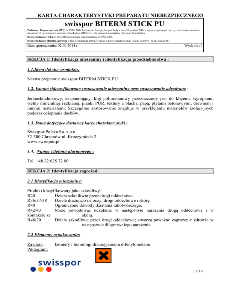 KARTA CHARAKTERYSTYKI PREPARATU NIEBEZPIECZNEGO swisspor BITERM STICK PU Podstawa: Rozporządzenie (WE) nr 1907/ 2006 Parlamentu Europejskiego i Rady z dnia 18 grudnia 2006 w sprawie rejestracji, oceny, udzielania zezwoleń i stosowanych ograniczeń w zakresie chemikaliów (REACH), utworzenia Europejskiej Agencji Chemikaliów Rozporządzenie (WE) nr 453/2010 zmieniające rozporządzenie nr 1907/2006 Rozporządzenie Ministra Zdrowia z dnia 13 listopada 2007r. w sprawie karty charakterystyki ( Dz.U. z 2007r. nr 215 poz.1588) Data sporządzenia: 02.04.2014 r. Wydanie :1 SEKCJA 1: Identyfikacja mieszaniny i identyfikacja przedsiębiorstwa : 1.1.Identyfikator produktu: Nazwa preparatu: swisspor BITERM STICK PU 1.2. Istotne zidentyfikowane zastosowanie mieszaniny oraz zastosowanie odradzane : Jednoskładnikowy, ekspandujący, klej poliuretanowy przeznaczony jest do klejenia styropianu, wełny mineralnej i szklanej, pianki PUR, tektury z blachą, papą, płytami betonowymi, drewnem i innymi materiałami. Szczególne zastosowanie znajduje w przyklejaniu materiałów izolacyjnych podczas ocieplania dachów. 1.3. Dane dotyczące dostawcy karty charakterystyki : Swisspor Polska Sp. z o.o. 32-500 Chrzanów ul. Kroczymiech 2 www.swisspor.pl 1.4. Numer telefonu alarmowego : Tel. +48 32 625 72 00 SEKCJA 2: Identyfikacja zagrożeń: 2.1 Klasyfikacja mieszaniny: Produkt klasyfikowany jako szkodliwy. R20 Działa szkodliwie przez drogi oddechowe. R36/37/38 Działa drażniąco na oczy, drogi oddechowe i skórę. R40 Ograniczone dowody działania rakotwórczego. R42/43 Może powodować uczulenie w następstwie narażenia drogą oddechową i w kontakcie ze skórą. R48/20 Działa szkodliwie przez drogi oddechowe; stwarza poważne zagrożenie zdrowia w następstwie długotrwałego narażenia. 2.2 Elementy oznakowania: Zawiera: Piktogram: Izomery i homologi diizocyjanianu difenylometanu 1 z 16 KARTA CHARAKTERYSTYKI PREPARATU NIEBEZPIECZNEGO swisspor BITERM STICK PU Podstawa: Rozporządzenie (WE) nr 1907/ 2006 Parlamentu Europejskiego i Rady z dnia 18 grudnia 2006 w sprawie rejestracji, oceny, udzielania zezwoleń i stosowanych ograniczeń w zakresie chemikaliów (REACH), utworzenia Europejskiej Agencji Chemikaliów Rozporządzenie (WE) nr 453/2010 zmieniające rozporządzenie nr 1907/2006 Rozporządzenie Ministra Zdrowia z dnia 13 listopada 2007r. w sprawie karty charakterystyki ( Dz.U. z 2007r. nr 215 poz.1588) Data sporządzenia: 02.04.2014 r. Wydanie :1 Xn Szkodliwy Określenie rodzaju zagrożenia : R20 R36/37/38 R40 R42/43 kontakcie ze R48/20 Działa szkodliwie przez drogi oddechowe. Działa drażniąco na oczy, drogi oddechowe i skórę. Ograniczone dowody działania rakotwórczego. Może powodować uczulenie w następstwie narażenia drogą oddechową i w skórą. Działa szkodliwie przez drogi oddechowe; stwarza poważne zagrożenie zdrowia w następstwie długotrwałego narażenia. Określenia dotyczące bezpiecznego stosowania niebezpiecznego preparatu : S2 S23 S36/37/39 Chronić przed dziećmi. Nie wdychać pary/rozpylonej cieczy. Nosić odpowiednią odzież ochronną, odpowiednie rękawice ochronne i okulary lub ochronę twarzy. S38 W przypadku niedostatecznej wentylacji stosować odpowiednie indywidualne środki ochrony dróg oddechowych. S45 W przypadku awarii lub jeżeli źle się poczujesz, niezwłocznie zasięgnij porady lekarza – jeżeli to możliwe, pokaż etykietę. S46 W razie połknięcia niezwłocznie zasięgnij porady lekarza – jeżeli to możliwe, pokaż etykietę. Dodatkowe informacje na opakowaniu: Zawiera izocyjaniany. Zapoznaj się z instrukcją dostarczoną przez producenta. 2.3 Inne zagrożenia: Osoby z nadwrażliwością dróg oddechowych (np. astma, chroniczne zapalenie oskrzeli) powinny unikać kontaktu z produktem. Objawy nadmiernego narażenia dróg oddechowych na produkt mogą utrzymywać się przez kilka godzin. Pył, opary i aerozole tworzą podstawowe niebezpieczeństwo dla dróg oddechowych. 2 z 16 KARTA CHARAKTERYSTYKI PREPARATU NIEBEZPIECZNEGO swisspor BITERM STICK PU Podstawa: Rozporządzenie (WE) nr 1907/ 2006 Parlamentu Europejskiego i Rady z dnia 18 grudnia 2006 w sprawie rejestracji, oceny, udzielania zezwoleń i stosowanych ograniczeń w zakresie chemikaliów (REACH), utworzenia Europejskiej Agencji Chemikaliów Rozporządzenie (WE) nr 453/2010 zmieniające rozporządzenie nr 1907/2006 Rozporządzenie Ministra Zdrowia z dnia 13 listopada 2007r. w sprawie karty charakterystyki ( Dz.U. z 2007r. nr 215 poz.1588) Data sporządzenia: 02.04.2014 r. Wydanie :1 SEKCJA 3: Skład / informacja o składnikach: 3.1. Substancje: Klasyfikacja rozporządzenie WE nr 1272 2008 Kody Klasy znak ostrzegawczy zwrotów zagrożenia symbol wskazującyc i kody zwroty R h rodzaj kategorii zagrożenia Acute Tox. 4 H332 Wziewny Xn; R20 Skin Irrit. 2 H315 Xi; Eye Irrit 2 H319 R36/37/38 Sens. Resp. H334 R42/43 1 Rakotw. Skin Sens. 1 H317 Kat. 3, Carc. 2 H351 R40, STOT SE H335 R48/20 STOT RE 2 H373 Wziewny dyrektywa 67/548/EWG Nazwa substancji (nr rejestracji) Zaw. [%] Numer CAS Numer WE Numer indeksowy Izomery i homologi difenylometyle no diizocyjanianu (-) > 50 9016-879 - - Wykaz pełnych tekstów stosowanych do klasyfikacji: pkt 16. SEKCJA 4: Środki pierwszej pomocy: 4.1 Opis środków pierwszej pomocy: Informacje ogólne: W razie wypadku lub wystąpienia dolegliwości wywołanych przez produkt należy zabezpieczyć poszkodowanego przed dalszym narażeniem i niezwłocznie zapewnić mu pomoc medyczną. Drogi oddechowe Wyprowadzić poszkodowaną osobę na świeże powietrze, zapewnić ciepło i spokój. W przypadku trudności w oddychaniu konieczna pomoc lekarska. Kontakt ze skórą 3 z 16 KARTA CHARAKTERYSTYKI PREPARATU NIEBEZPIECZNEGO swisspor BITERM STICK PU Podstawa: Rozporządzenie (WE) nr 1907/ 2006 Parlamentu Europejskiego i Rady z dnia 18 grudnia 2006 w sprawie rejestracji, oceny, udzielania zezwoleń i stosowanych ograniczeń w zakresie chemikaliów (REACH), utworzenia Europejskie