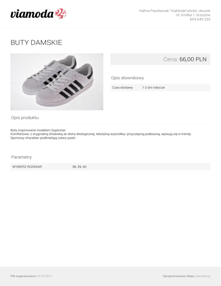 Halina Paszkaniak "ViaModa"odzież, obuwie Ul. Krótka 1, brzozów 604 645 233 BUTY DAMSKIE Cena: 66,00 PLN Opis słownikowy Czas dostawy 1-2 dni robocze Opis produktu Buty inspirowane modelem Superstar. Komfortowe, z oryginalną cholewką ze skóry ekologicznej, tekstylną wyściółką i przyczepną podeszwą, wpisują się w trendy. Sportowy charakter podkreślają cztery paski . Parametry WYBIERZ ROZMIAR Plik wygenerowano: 07-03-2017 38, 39, 40 Oprogramowanie sklepu: AptusShop Halina Paszkaniak "ViaModa"odzież, obuwie Ul. Krótka 1, brzozów 604 645 233 Galeria Plik wygenerowano: 07-03-2017 Powered by TCPDF (www.tcpdf.org) Oprogramowanie sklepu: AptusShop