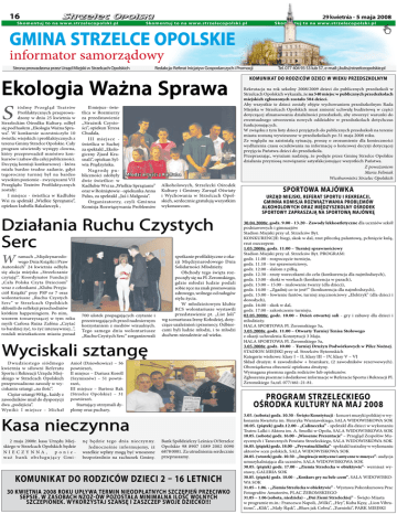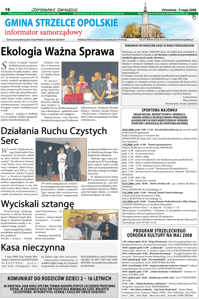 16 29 kwietnia - 5 maja 2008 Skomentuj to na w w w.strzelecopolski.pl Skomentuj to na w w w.strzelecopolski.pl Skomentuj to na w w w.strzelecopolski.pl GMINA STRZELCE OPOLSKIE informator samorządowy Strona prowadzona przez Urząd Miejski w Strzelcach Opolskich Redakcja: Referat Inicjatyw Gospodarczych i Promocji Ekologia Ważna Sprawa S iódmy Przegląd Teatrów Profilaktycznych przeprowadzony w dniu 25 kwietnia w Strzeleckim Ośrodku Kultury, odbył się pod hasłem „Ekologia Ważna Sprawa”. W konkursie uczestniczyło 10 świetlic wiejskich i profilaktycznych z terenu Gminy Strzelce Opolskie. Cały program uświetniły występy clowna, który przeprowadził mnóstwo konkursów i zabaw dla całej publiczności. Decyzją komisji konkursowej - która miała bardzo trudne zadanie, gdyż tegoroczny turniej był na bardzo wysokim poziomie - zwycięzcami VII Przeglądu Teatrów Profilaktycznych zostały: I miejsce - świetlica w Kadłubie Wsi za spektakl „Wielkie Sprzątanie”, opiekun Izabella Bakalarczyk , II miejsce - świetlica w Rozmierzy za przedstawienie „Strażnik Czystości”, opiekun Teresa Chudala, III miejsce świetlica w Suchej za spektakl „Ekologiczny Zjazd Krasnali”, opiekun Sylwia Prądzyńska. Nagro dę publiczności zdobyły Młodzi artyści z Kadłuba dwie świetlice: w Kadłubie Wsi za „Wielkie Sprzątanie” Alkoholowych, Strzelecki Ośrodek oraz w Rożniątowie - opiekunka Anna Kultury i Gminny Zarząd Oświaty i Wychowania w Strzelcach OpolPalus, za spektakl „Jaś i Małgosia”. Organizatorzy, czyli Gminna skich, serdecznie gratulują wszystkim Komisja Rozwiązywania Problemów wykonawcom. Działania Ruchu Czystych Serc W ramach „Międzynarodowego Dnia Książki i Praw Autorskich” 24 kwietnia odbyła się akcja miejska „Strzelczanie czytają!”. Koordynator Fundacji „Cała Polska Czyta Dzieciom” wraz z członkami „Klubu Przyjaciół Książki” przy PSP nr 7 oraz wolontariusze „Ruchu Czystych Serc” w Strzelcach Opolskich skłonili do refleksji przechodniów krótkim happeningiem. Po nim, wzorem towarzyszącej w tym roku myśli Carlosa Ruiza Zafóna „Czytać to bardziej żyć, to żyć intensywniej...”, rozdali mieszkańcom miasta ponad 700 ulotek propagujących czytanie i przestrzegających przed nadmiernym korzystaniem z mediów wizualnych. Tego samego dnia wolontariusze „Ruchu Czystych Serc” zorganizowali spotkanie profilaktyczne z okazji Międzynarodowego Dnia Solidarności Młodzieży. Obchody tego święta rozpoczęły się na Pl. Żeromskiego, gdzie młodzi ludzie podali sobie ręce na znak promowania zdrowego, wolnego od nałogów stylu życia. W młodzieżowym klubie RCS wolontariusze wystawili przedstawienie pt. „List Joli” wg scenariusza Ireny Kołodziej, dotyczące uzależnień i przemocy. Odbiorcami byli ludzie młodzi, i to młodzi duchem niezależnie od wieku. Wyciskali sztangę Dwudziestego siódmego kwietnia w siłowni Referatu Sportu i Rekreacji Urzędu Miejskiego w Strzelcach Opolskich przeprowadzono zawody w wyciskaniu sztangi „na ilość”. Ciężar sztangi 90 kg., każdy z zawodników miał do dyspozycji dwa „podejścia”. Wyniki: I miejsce – Michał Anioł (Dziewkowice) – 56 powtórzeń, II miejsce – Dariusz Koroll (Szymiszów) – 51 powtórzeń, III miejsce – Bartosz Rak (Strzelce Opolskie) – 31 powtórzeń. Kasa nieczynna nę będzie tego dnia nieczynny. Jednocześnie informujemy, iż wszelkie wpłaty mogą być wnoszone bezpośrednio na rachunek Gminy. KOMUNIKAT DO RODZICÓW DZIECI W WIEKU PRZEDSZKOLNYM Rekrutacja na rok szkolny 2008/2009 dzieci do publicznych przedszkoli w Strzelcach Opolskich wykazała, że na 540 miejsc w publicznych przedszkolach miejskich zgłoszonych zostało 584 dzieci. Aby wszystkie te dzieci zostały objęte wychowaniem przedszkolnym Rada Miejska w Strzelcach Opolskich musi zmienić uchwałę budżetową w części dotyczącej sfinansowania działalności przedszkoli, aby stworzyć warunki do ewentualnego utworzenia nowych oddziałów w przedszkolach dotychczas funkcjonujących. W związku z tym listy dzieci przyjętych do publicznych przedszkoli na terenie miasta zostaną wywieszone w przedszkolach po 31 maja 2008 roku. Ze względu na zaistniałą sytuację, proszę o zrozumienie dla konieczności wydłużenia czasu oczekiwania na informację o końcowej decyzji dotyczącej przyjęcia Państwa dzieci do przedszkola. Przepraszając, wyrażam nadzieję, że podjęte przez Gminę Strzelce Opolskie działania przyniosą rozwiązanie satysfakcjonujące wszystkich Państwa. Z poważaniem Maria Feliniak Wiceburmistrz Strzelec Opolskich sportowa majówka Urząd Miejski, Referat Sportu i Rekreacji, Gminna Komisja Rozwiązywania Problemów Alkoholowych oraz Międzyszkolny Ośrodek Sportowy zapraszają na sportową majówkę 30.04.2008r. godz. 9.00 - 13.20 - Zawody lekkoatletyczne dla uczniów szkół podstawowych i gimnazjów Stadion Miejski przy ul. Strzelców Byt. KONKURENCJE: biegi, skok w dal, rzut piłeczką palantową, pchnięcie kulą, rzut oszczepem 1.05.2008r. godz. 11.00 – Turniej sprawnościowy Stadion Miejski przy ul. Strzelców Byt. PROGRAM: godz. 11.00 - rozpoczęcie turnieju, godz. 11.10 - tor sprawnościowy, godz. 12.00 - slalom z piłką, godz. 12.30 - rzuty woreczkami do celu (konkurencja dla najmłodszych), godz. 13.00 - skoki w workach (konkurencja w parach), godz. 13.00 – 15.00 - malowanie twarzy (dla dzieci), godz. 14.00 - „Zgadnij co to jest?” (konkurencja dla najmłodszych), godz. 15.00 - łowienie fantów, turniej zręcznościowy „Elektryk” (dla dzieci i dorosłych), godz. 16.00 - skok w dal, godz. 17.00 - zakończenie turnieju. 02.05.2008r. godz. 10.00 – Dzień otwartej sali - gry i zabawy dla dzieci i młodzieży. HALA SPORTOWA Pl. Żeromskiego 5a, 3.05.2008r. godz. 11.00 – Otwarty Turniej Tenisa Stołowego z okazji uchwalenia Konstytucji 3 Maja. HALA SPORTOWA Pl. Żeromskiego 5a, 3.05.2008r. godz. 10.00 - Turniej Drużyn