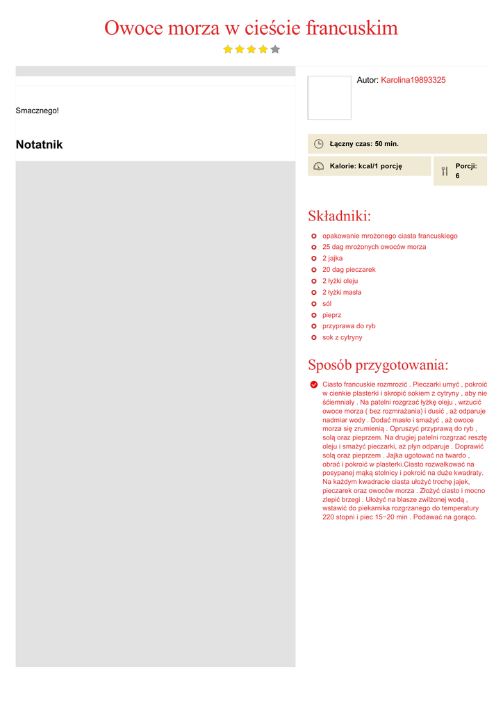 Owoce morza w cieście francuskim Autor: Karolina19893325 Smacznego! Notatnik Łączny czas: 50 min. Kalorie: kcal/1 porcję Porcji: 6 Składniki: opakowanie mrożonego ciasta francuskiego 25 dag mrożonych owoców morza 2 jajka 20 dag pieczarek 2 łyżki oleju 2 łyżki masła sól pieprz przyprawa do ryb sok z cytryny Sposób przygotowania: Ciasto francuskie rozmrozić . Pieczarki umyć , pokroić w cienkie plasterki i skropić sokiem z cytryny , aby nie śćiemnialy . Na patelni rozgrzać łyżkę oleju , wrzucić owoce morza ( bez rozmrażania) i dusić , aż odparuje nadmiar wody . Dodać masło i smażyć , aż owoce morza się zrumienią . Opruszyć przyprawą do ryb , solą oraz pieprzem. Na drugiej patelni rozgrzać resztę oleju i smażyć pieczarki, aż płyn odparuje . Doprawić solą oraz pieprzem . Jajka ugotować na twardo , obrać i pokroić w plasterki.Ciasto rozwałkować na posypanej mąką stolnicy i pokroić na duże kwadraty. Na każdym kwadracie ciasta ułożyć trochę jajek, pieczarek oraz owoców morza . Złożyć ciasto i mocno zlepić brzegi . Ułożyć na blasze zwilżonej wodą , wstawić do piekarnika rozgrzanego do temperatury 220 stopni i piec 15−20 min . Podawać na gorąco.