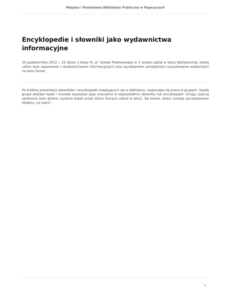 Miejska i Powiatowa Biblioteka Publiczna w Ropczycach Encyklopedie i słowniki jako wydawnictwa informacyjne 25 października 2012 r. 22 dzieci z klasy III „b” Szkoły Podstawowej nr 1 wzięło udział w lekcji bibliotecznej, której celem było zapoznanie z wydawnictwami informacyjnymi oraz wyrabianiem umiejętności wyszukiwania wiadomości na dany temat. Po krótkiej prezentacji słowników i encyklopedii znajdujących się w bibliotece, rozpoczęła się praca w grupach. Każda grupa dostała hasła i musiała wyszukać jego znaczenie w odpowiednim słowniku lub encyklopedii. Drugą częścią spotkania było głośne czytanie bajek przez dzieci biorące udział w lekcji. Na koniec dzieci zostały poczęstowane słodkim „co nieco”. 1