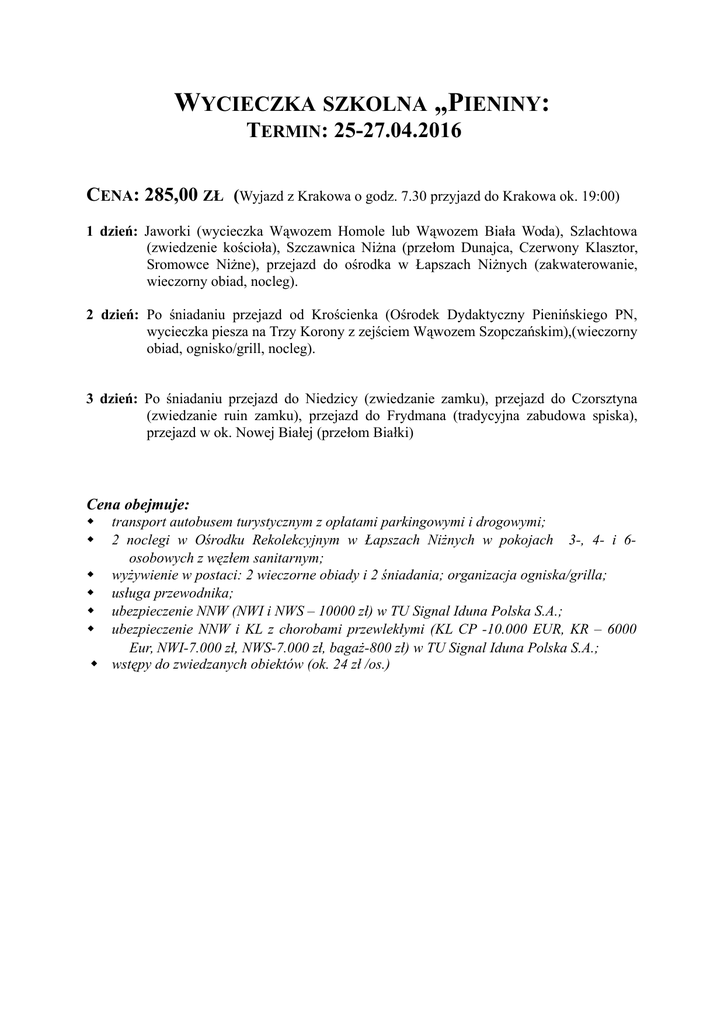 WYCIECZKA SZKOLNA „PIENINY: TERMIN: 25-27.04.2016 CENA: 285,00 ZŁ (Wyjazd z Krakowa o godz. 7.30 przyjazd do Krakowa ok. 19:00) 1 dzień: Jaworki (wycieczka Wąwozem Homole lub Wąwozem Biała Woda), Szlachtowa (zwiedzenie kościoła), Szczawnica Niżna (przełom Dunajca, Czerwony Klasztor, Sromowce Niżne), przejazd do ośrodka w Łapszach Niżnych (zakwaterowanie, wieczorny obiad, nocleg). 2 dzień: Po śniadaniu przejazd od Krościenka (Ośrodek Dydaktyczny Pienińskiego PN, wycieczka piesza na Trzy Korony z zejściem Wąwozem Szopczańskim),(wieczorny obiad, ognisko/grill, nocleg). 3 dzień: Po śniadaniu przejazd do Niedzicy (zwiedzanie zamku), przejazd do Czorsztyna (zwiedzanie ruin zamku), przejazd do Frydmana (tradycyjna zabudowa spiska), przejazd w ok. Nowej Białej (przełom Białki) Cena obejmuje: transport autobusem turystycznym z opłatami parkingowymi i drogowymi; 2 noclegi w Ośrodku Rekolekcyjnym w Łapszach Niżnych w pokojach 3-, 4- i 6osobowych z węzłem sanitarnym; wyżywienie w postaci: 2 wieczorne obiady i 2 śniadania; organizacja ogniska/grilla; usługa przewodnika; ubezpieczenie NNW (NWI i NWS – 10000 zł) w TU Signal Iduna Polska S.A.; ubezpieczenie NNW i KL z chorobami przewlekłymi (KL CP -10.000 EUR, KR – 6000 Eur, NWI-7.000 zł, NWS-7.000 zł, bagaż-800 zł) w TU Signal Iduna Polska S.A.; wstępy do zwiedzanych obiektów (ok. 24 zł /os.)