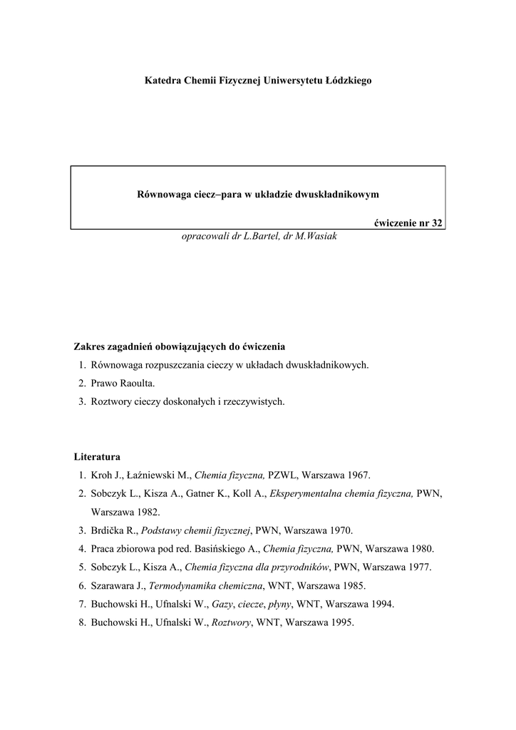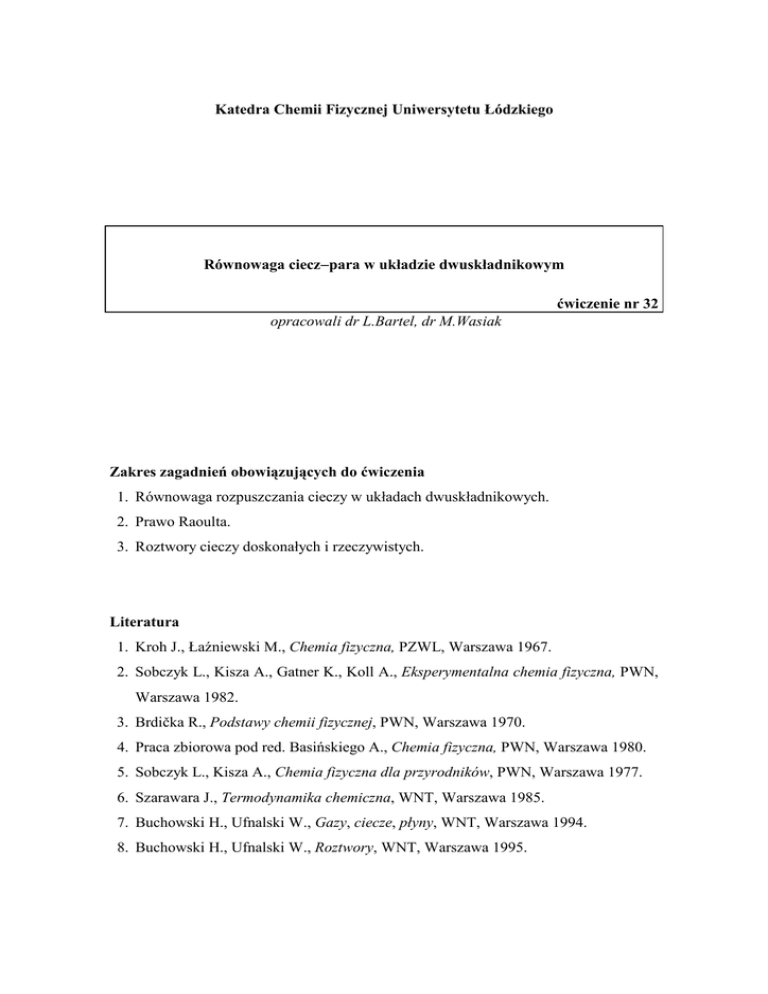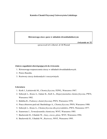 Katedra Chemii Fizycznej Uniwersytetu Łódzkiego Równowaga ciecz− −para w układzie dwuskładnikowym ćwiczenie nr 32 opracowali dr L.Bartel, dr M.Wasiak Zakres zagadnień obowiązujących do ćwiczenia 1. Równowaga rozpuszczania cieczy w układach dwuskładnikowych. 2. Prawo Raoulta. 3. Roztwory cieczy doskonałych i rzeczywistych. Literatura 1. Kroh J., Łaźniewski M., Chemia fizyczna, PZWL, Warszawa 1967. 2. Sobczyk L., Kisza A., Gatner K., Koll A., Eksperymentalna chemia fizyczna, PWN, Warszawa 1982. 3. Brdička R., Podstawy chemii fizycznej, PWN, Warszawa 1970. 4. Praca zbiorowa pod red. Basińskiego A., Chemia fizyczna, PWN, Warszawa 1980. 5. Sobczyk L., Kisza A., Chemia fizyczna dla przyrodników, PWN, Warszawa 1977. 6. Szarawara J., Termodynamika chemiczna, WNT, Warszawa 1985. 7. Buchowski H., Ufnalski W., Gazy, ciecze, płyny, WNT, Warszawa 1994. 8. Buchowski H., Ufnalski W., Roztwory, WNT, Warszawa 1995. Wykonanie ćwiczenia polega na zbadaniu temperatury wrzenia (Twrz) oraz składu cieczy (x2) i pary (y2) będących w stanie równowagi w procesie destylacji. Eksperyment rozpoczynamy dla cieczy bogatej w składnik bardziej lotny – aceton. Kilkukrotne oddestylowanie porcji cieczy (początkowo 22 ml a następnie 15, 10, 8 i 4 ml) powoduje, że skład destylowanej cieczy staje się coraz bardziej bogaty w składnik mniej lotny – toluen. Po każdorazowej zmianie składu, pobierane są do zanalizowanie niewielkie porcje destylowanej cieczy (o składzie x2) z kolby destylacyjnej oraz destylatu (o składzie y2) który powstaje przez skroplenie pary będącej w równowadze z destylowaną cieczą. Zbiór danych (Twrz,, x2, y2) dla pięciu różnych składów mieszaniny aceton(2) – toluen(1) oraz czystych składników (dane tablicowe) umożliwia wykreślenie izobary Twrz,=f( x2 , y2) – co jest celem ćwiczenia. 2 CZĘŚĆ DOŚWIADCZALNA Układ pomiarowy W celu wyznaczenia krzywych równowagi fazowej ciecz−para w warunkach izobarycznych, stosuje się odpowiednio skonstruowany aparat destylacyjny, w którym ustala się równowaga między fazą ciekłą i fazą pary (Rys. 6). Trójszyjna kolba destylacyjna (1) jest umieszczona w płaszczu grzejnym (2) i zaopatrzona w termometr (3) o zakresie 0oC−200oC z podziałką co 0,5oC. W dolnej części chłodnicy (4) umieszczone są: kran trójdrożny (5) (zasada działania przedstawiona na Rys. 7, jedna końcówka pokrętła kranu oznaczona w celu odróżnienia), służący do odprowadzania destylatu oraz syfon (6). Destylat zbiera się w cylindrze (C), a następnie przelewa do kolbki (A). W szyjce kolby destylacyjnej znajduje się kapilara (7) służąca do pobierania cieczy z kolby do kolbki (B) poprzez kranik (8). Rys. 6. Aparat destylacyjny do wyznaczania izobarycznej równowagi fazowej ciecz−para. 3 Rys. 7. Zasada działania kranu trójdrożnego. Doświadczalne wyznaczenie izobary wrzenia i kondensacji wymaga oznaczenia w warunkach izobarycznych temperatury wrzenia kilku roztworów o różnym składzie, po osiągnięciu przez układ stanu równowagi. Skład fazy ciekłej (ciecz w kolbie destylacyjnej) oraz fazy pary (destylat) określa się przez oznaczenie współczynników załamania światła za pomocą refraktometru Abbego i wykorzystanie tzw. krzywej wzorcowej, która przedstawia współczynnik załamania światła nD w funkcji ułamka molowego jednego ze składników badanego układu xi. Zasada działania refraktometru Abbego oparta jest na pomiarze kąta granicznego. Ogólny schemat przyrządu przedstawiono na rysunku 8. 4 Rys. 8. Refraktometr Abbego. Cienką warstwę badanej cieczy umieszcza się pomiędzy dwoma pryzmatami wykonanymi ze szkła charakteryzującego się dużym współczynnikiem załamania światła. Odbite od zwierciadła promienie pochodzące od lampy sodowej padają na pierwszy pryzmat, załamują się w nim i pod różnymi kątami padają na badaną substancję. Pryzmat ten pełni rolę pryzmatu oświetlającego. Do drugiego pryzmatu – załamującego, przechodzi tylko część promieniowania. Jest on częściowo oświetlony promieniami padającymi pod kątem mniejszym lub równym kątowi granicznemu. Wszystkie promienie, które padają pod kątem większym niż graniczny zostają całkowicie odbite i nie przedostają się do drugiego pryzmatu. Promień zaznaczony na rysunku 7 linią ciągłą jest promieniem granicznym. Po opuszczeniu pryzmatu załamującego, promienie trafiają do lunetki. W okularze lunetki umieszczone są skrzyżowane pod kątem prostym nici pajęcze. Położenie zespołu pryzmatów względem lunetki zmienia się w taki sposób, aby pole widoczne w okularze było podzielone na część jasną i ciemną. Granicę obu pól ustawia się dokładnie na skrzyżowaniu nici pajęczych. Obrót pryzmatów jest zsynchronizowany ze skalą przyrządu, na której odczytuje się wprost wartości współczynnika załamania światła badanej cieczy. Refraktometr zaopatrzony jest w lupę, co pozwala na odczyt nD z dokładnością ±2·10-4. Podczas pomiaru wskazane jest utrzymywanie stałej temperatury cieczy wprowadzonej między płaszczyzny pryzmatów. 5 Odczynniki chemiczne i sprzęt laboratoryjny: 2 kolbki (30ml) ze szlifem, kolba (250 ml) z korkiem, pompka do pipet, pipetka szklana, lejek, lupa. Wykonanie ćwiczenia i przedstawienie wyników Uwaga! Wykorzystywane w ćwiczeniu substancje są wysoce łatwopalne, oraz szkodliwe – działają drażniąco na skórę, oczy oraz drogi oddechowe (patrz karty charakterystyk). Zachować szczególną ostrożność. Trzymać z dala od źródeł ognia. Używać środków ochrony osobistej – okularów ochronnych oraz rękawic ochronnych. Odbieralnik i kolby w których znajdują się roztwory niezwłocznie zamykać korkiem. Unikać rozlania oraz wdychania par. Wszelkie wypadki zgłaszać prowadzącemu zajęcia. 1. Włączyć ogrzewanie kolby destylacyjnej poprzez autotransformator, którego napięcie powinno wynosić ≈100V i doprowadzić ciecz do w