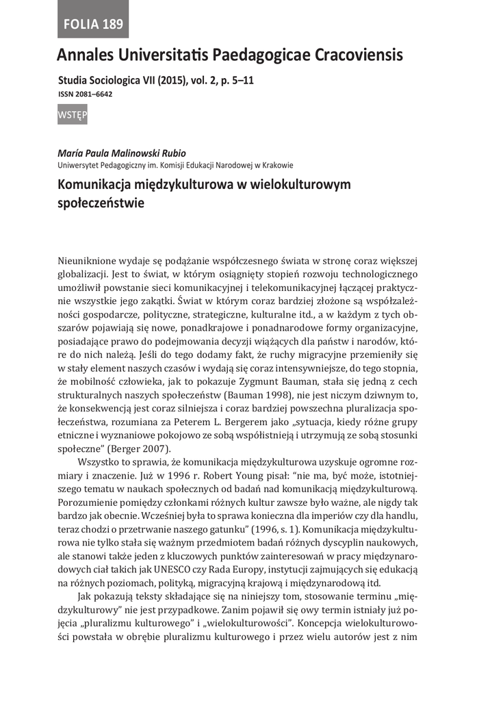 Folia 189 Annales Universitatis Paedagogicae Cracoviensis Studia Sociologica VII (2015), vol. 2, p. 5–11 ISSN 2081–6642 Wstęp María Paula Malinowski Rubio Uniwersytet Pedagogiczny im. Komisji Edukacji Narodowej w Krakowie Komunikacja międzykulturowa w wielokulturowym społeczeństwie Nieuniknione wydaje sę podążanie współczesnego świata w stronę coraz większej globalizacji. Jest to świat, w którym osiągnięty stopień rozwoju technologicznego umożliwił powstanie sieci komunikacyjnej i telekomunikacyjnej łączącej praktycznie wszystkie jego zakątki. Świat w którym coraz bardziej złożone są współzależności gospodarcze, polityczne, strategiczne, kulturalne itd., a w każdym z tych obszarów pojawiają się nowe, ponadkrajowe i ponadnarodowe formy organizacyjne, posiadające prawo do podejmowania decyzji wiążących dla państw i narodów, które do nich należą. Jeśli do tego dodamy fakt, że ruchy migracyjne przemieniły się w stały element naszych czasów i wydają się coraz intensywniejsze, do tego stopnia, że mobilność człowieka, jak to pokazuje Zygmunt Bauman, stała się jedną z cech strukturalnych naszych społeczeństw (Bauman 1998), nie jest niczym dziwnym to, że konsekwencją jest coraz silniejsza i coraz bardziej powszechna pluralizacja społeczeństwa, rozumiana za Peterem L. Bergerem jako „sytuacja, kiedy różne grupy etniczne i wyznaniowe pokojowo ze sobą współistnieją i utrzymują ze sobą stosunki społeczne” (Berger 2007). Wszystko to sprawia, że komunikacja międzykulturowa uzyskuje ogromne rozmiary i znaczenie. Już w 1996 r. Robert Young pisał: “nie ma, być może, istotniejszego tematu w naukach społecznych od badań nad komunikacją międzykulturową. Porozumienie pomiędzy członkami różnych kultur zawsze było ważne, ale nigdy tak bardzo jak obecnie. Wcześniej była to sprawa konieczna dla imperiów czy dla handlu, teraz chodzi o przetrwanie naszego gatunku” (1996, s. 1). Komunikacja międzykulturowa nie tylko stała się ważnym przedmiotem badań różnych dyscyplin naukowych, ale stanowi także jeden z kluczowych punktów zainteresowań w pracy międzynarodowych ciał takich jak UNESCO czy Rada Europy, instytucji zajmujących się edukacją na różnych poziomach, polityką, migracyjną krajową i międzynarodową itd. Jak pokazują teksty składające się na niniejszy tom, stosowanie terminu „międzykulturowy” nie jest przypadkowe. Zanim pojawił się owy termin istniały już pojęcia „pluralizmu kulturowego” i „wielokulturowości”. Koncepcja wielokulturowości powstała w obrębie pluralizmu kulturowego i przez wielu autorów jest z nim [6] María Paula Malinowski Rubio utożsamiana. Pluralizm kulturowy odnosi się do współistnienia na jednym terytorium grup o różnych kulturach, podkreślając pozytywność tej koegzystencji, broniąc prawa każdej z grup lub społeczności kulturowych do zachowania swojej kultury i tożsamości, oraz kładąc nacisk na równość i prawo do różnorodności, w opozycji do modeli asymilacyjnych czy koncepcji melting pot. Wielokulturowość, tak samo zwraca uwagę na szczególne właściwości każdej kultury, kładzie nacisk na różnice pomiędzy nimi, ale w małym stopniu zajmuje się interakcjami między nimi. Jak pisze Carlos Giménez Romero, „wielokulturowość wydaje się zadawalać współistnieniem, a w każdym razie oczekuje, że współżycie społeczne będzie wynikało z szacunku i akceptacji innego” (2003). Z kolei z perspektywy międzykulturowej, która wywodzi się z obszaru edukacji, ważne jest nie tylko poszanowanie dla różnorodności, ale przede wszystkim interakcja pomiędzy różnymi kulturami, z naciskiem na współpracę i wymianę, współżycie w różnorodności. Kiedy mówi się o wielokulturowości, stwierdza się tylko stan rzeczy, obecność więcej niż jednej kultury na jednym terytorium lub wewnątrz jednego społeczeństwa. Kiedy mówi się o międzykulturowości, mówi się o procesie dynamicznym, aktywnym, o interakcjach pomiędzy przedstawicielami różnych kultur. W związku z tym, termin „komunikacja międzykulturowa” oznacza aktywną postawę w obrębie wielokulturowości, wolę porozumienia, a w tym wolę rozwiązania ewentualnych konfliktów, które mogą pojawić się w wyniku istniejących różnic. Komunikacja międzykulturowa obejmuje tyle obszarów interakcji, że niemożliwe byłoby zajęcie się nimi wszystkimi w jednej publikacji. Artykuły zebrane w tym tomie rzucają światło jedynie na niektóre z jej aspektów, a czynią to z bardzo odmiennych perspektyw. Ich heterogeniczność z jednej strony służy do zilustrowania jej złożoności, ale z drugiej może sprawić, że Czytelnik nie poczuje się usatysfakcjonowany. Trzeba jednak gdzieś zacząć, zwłaszcza jeśli weźmie się pod uwagę, że obecnie w obliczu wydarzeń związanych z masowym przybywaniem do Unii Europejskiej uchodźców z Syrii, a tym bardziej po zamachach terrorystycznych w Paryżu 13 listopada 2015 r., wszystkie problemy relacji międzykulturowych nabierają w Polsce coraz większego znaczenia, jeszcze przed dotarciem imigrantów, a postawa wobec tej imigracji staje się kwestią sporną na wielu poziomach interakcji społecznej, od kręgów politycznych po rodzinne. Pierwsze pięć artykułów zajmuje się bardziej ogólnymi aspektami komunikacji międzykulturowej, ale z pięciu różnych perspektyw: praw kulturowych, dydaktyki kompetencji komunikacyjnych w świecie coraz intensywniejszej komunikacji wirtualnej, mediacji w konfliktach międzykulturowych, komunikacji międzykulturowej w sytuacjach kryzysowych oraz komunikacji międzykulturowej i religii. Kolejne siedem artykułów prezentuje komunikację międzykulturową w pewnych bardziej określonych kontekstach, którymi są komunikacja międzykulturowa w szczególnych obszarach interakcji pomiędzy imigrantami a autochtonami, jej rolą w tworzeniu tożsamości