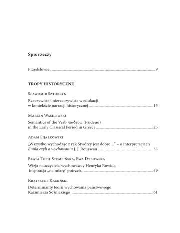 Spis rzeczy Przedsłowie.............................................................................................................................. 9 TROPY HISTORYCZNE Sławomir Sztobryn Rzeczywiste i nierzeczywiste w edukacji w kontekście narracji historycznej..............................................................................15 Marcin Wasilewski Semantics of the Verb παιδεύω (Paideuo) in the Early Classical Period in Greece.....................................................................25 Adam Fijałkowski „Wszystko wychodząc z rąk Stwórcy jest dobre…” – o interpretacjach Emila czyli o wychowaniu J. J. Rousseau...................................................................33 Beata Topij-Stempińska, Ewa Dybowska Wizja nauczyciela-wychowawcy Henryka Rowida – inspiracja „na miarę” potrzeb.......................................................................................49 Krzysztof Kamiński Determinanty teorii wychowania państwowego Kazimierza Sośnickiego ..................................................................................................61 6 Spis rzeczy Sebastian Taboł Zarys refleksji nad filozofią wychowania Františka Drtiny.............................71 Magdalena Lidia Boczoń Wychowanie i samowychowanie do twórczego współuczestnictwa w kulturze. Z dorobku pedagogiki kultury okresu II Rzeczypospolitej.....85 Agnieszka Małek Edukacja zdrowotna w poradnikach dla rodziców z okresu II Rzeczypospolitej i Polskiej Rzeczpospolitej Ludowej (do roku 1969). Analiza porównawcza.....................................................................95 Bibliografia.......................................................................................................................... 111 TROPY FILOZOFII WYCHOWANIA Wiesław Andrukowicz Tradycja i wyzwania epistemologii komplementarnej.................................... 125 Mikołaj Smetański Istota wychowania w edukacji alternatywnej ..................................................... 149 Blanka Kudláčová Personalist Philosophy as Justification of Inclusive Education................... 163 Andrej Rajský Challenges of Postmodern Individualism to Education................................ 173 Michał Głażewski Wychowanie heurystyczne – szczególne możliwości aplikacji teorii gier w pedagogice.............................................................................. 187 Spis rzeczy 7 Anna Walczak Odsłanianie pedagogicznego ethosu........................................................................ 215 Anna Szudra-Barszcz O potrzebie wychowania do refleksji...................................................................... 231 Grzegorz Barth Edukacja jako sztuka rozumienia i kształtowania osoby............................... 247 Bibliografia.......................................................................................................................... 259 WYBRANE WĄTKI INTERPRETACYJNE Usha Pokharel Nepal on Way to Exploring the True Meaning of Education: “Educational Reality, History, Presence and Future of Nepal’s Education”...................................................................................................... 277 Wojciech Błaszczyk “Edukacja dekolonizująca” jako emanacja tożsamości rewolucyjnej w Boliwii.......................................................................... 291 Adam Trawiński Uniwersytet klasy światowej w Polsce? Perspektywa w świetle ujęcia J. Salmiego.............................................................. 309 Piotr Sieradzki Między kształceniem intelektualnym a przygotowaniem zawodowym. Współczesne dylematy szkolnictwa wyższego................................................... 321 8 Spis rzeczy Beata Glinkowska Proces umiędzynarodowienia i ekspansji międzykulturowości a zarządzanie uczelniami wyższymi – rozważania teoretyczne.................. 335 Paweł Kijo Zdrowie i kryteria zdrowia w ocenie studentów pedagogiki....................... 347 Milena Kaczmarczyk Mężczyźni w zawodzie sfeminizowanym: rozważania na temat nauczycieli wczesnej edukacji........................................ 365 Celina Witkowska Problematyka zjawiska fluktuacji szkolnej wśród młodzieży zagrożonej wykluczeniem społecznym. Raport z badań przeprowadzonych w Ośrodku Szkolno-Wychowawczym w Mysłakowicach.............................. 379 Paweł Ciołkiewicz Superbohater – przemysł kulturalny – przemoc. Wstępna charakterystyka pola badawczego........................................................ 391 Bibliografia.......................................................................................................................... 415 Posłowie................................................................................................................................ 427 Abstracts............................................................................................................................... 431 Noty o autorach................................................................................................................. 447 Indeks nazwisk.................................................................................................................. 457