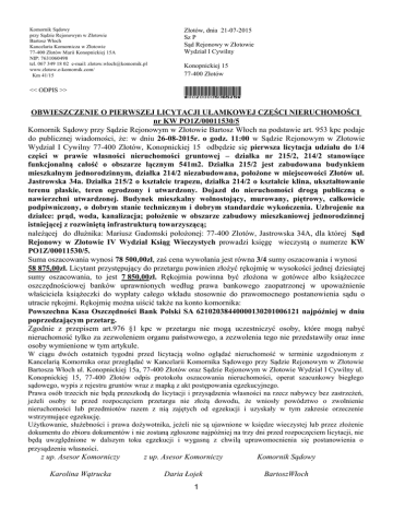 Komornik Sądowy przy Sądzie Rejonowym w Złotowie Bartosz Włoch Kancelaria Komornicza w Złotowie 77-400 Złotów Marii Konopnickiej 15A NIP: 7631060498 tel. 067 349 18 02 e-mail: [email protected] www.zlotow.e-komornik.com/ Km 41/15 Złotów, dnia 21-07-2015 Sz P Sąd Rejonowy w Złotowie Wydział I Cywilny << ODPIS >> *0020000506525* Konopnickiej 15 77-400 Złotów OBWIESZCZENIE O PIERWSZEJ LICYTACJI UŁAMKOWEJ CZĘŚCI NIERUCHOMOŚCI nr KW PO1Z/00011530/5 Komornik Sądowy przy Sądzie Rejonowym w Złotowie Bartosz Włoch na podstawie art. 953 kpc podaje do publicznej wiadomości, że: w dniu 26-08-2015r. o godz. 11:00 w Sądzie Rejonowym w Złotowie Wydział I Cywilny 77-400 Złotów, Konopnickiej 15 odbędzie się pierwsza licytacja udziału do 1/4 części w prawie własności nieruchomości gruntowej – działka nr 215/2, 214/2 stanowiące funkcjonalną całość o obszarze łącznym 541m2. Działka 215/2 jest zabudowana budynkiem mieszkalnym jednorodzinnym, działka 214/2 niezabudowana, położone w miejscowości Złotów ul. Jastrowska 34a. Działka 215/2 o kształcie trapezu, działka 214/2 o kształcie klina, ukształtowanie terenu płaskie, teren ogrodzony i utwardzony. Dojazd do nieruchomości drogą publiczną o nawierzchni utwardzonej. Budynek mieszkalny wolnostojący, murowany, piętrowy, całkowicie podpiwniczony, o dobrym stanie technicznym i dobrym standardzie wykończenia. Uzbrojenie na działce: prąd, woda, kanalizacja; położenie w obszarze zabudowy mieszkaniowej jednorodzinnej istniejącej z rozwiniętą infrastrukturą towarzyszącą; należącej do dłużnika: Mariusz Gadomski położonej: 77-400 Złotów, Jastrowska 34A, dla której Sąd Rejonowy w Złotowie IV Wydział Ksiąg Wieczystych prowadzi księgę wieczystą o numerze KW PO1Z/00011530/5. Suma oszacowania wynosi 78 500,00zł, zaś cena wywołania jest równa 3/4 sumy oszacowania i wynosi 58 875,00zł. Licytant przystępujący do przetargu powinien złożyć rękojmię w wysokości jednej dziesiątej sumy oszacowania, to jest 7 850,00zł. Rękojmia powinna być złożona w gotówce albo książeczce oszczędnościowej banków uprawnionych według prawa bankowego zaopatrzonej w upoważnienie właściciela książeczki do wypłaty całego wkładu stosownie do prawomocnego postanowienia sądu o utracie rękojmi. Rękojmię można uiścić także na konto komornika: Powszechna Kasa Oszczędności Bank Polski SA 62102038440000130201006121 najpóźniej w dniu poprzedzającym przetarg. Zgodnie z przepisem art.976 §1 kpc w przetargu nie mogą uczestniczyć osoby, które mogą nabyć nieruchomość tylko za zezwoleniem organu państwowego, a zezwolenia tego nie przedstawiły oraz inne osoby wymienione w tym artykule. W ciągu dwóch ostatnich tygodni przed licytacją wolno oglądać nieruchomość w terminie uzgodnionym z Kancelarią Komornika oraz przeglądać w Kancelarii Komornika Sądowego przy Sądzie Rejonowym w Złotowie Bartosza Włoch ul. Konopnickiej 15a, 77-400 Złotów oraz Sądzie Rejonowym w Złotowie Wydział I Cywilny ul. Konopnickiej 15, 77-400 Złotów odpis protokołu oszacowania nieruchomości, operat szacunkowy biegłego sądowego, wypis z rejestru gruntów wraz z mapką z akt postępowania egzekucyjnego. Prawa osób trzecich nie będą przeszkodą do licytacji i przysądzenia własności na rzecz nabywcy bez zastrzeżeń, jeżeli osoby te przed rozpoczęciem przetargu nie złożą dowodu, że wniosły powództwo o zwolnienie nieruchomości lub przedmiotów razem z nią zajętych od egzekucji i uzyskały w tym zakresie orzeczenie wstrzymujące egzekucję. Użytkowanie, służebności i prawa dożywotnika, jeżeli nie są ujawnione w księdze wieczystej lub przez złożenie dokumentu do zbioru dokumentów i nie zostaną zgłoszone najpóźniej na trzy dni przed rozpoczęciem licytacji, nie będą uwzględnione w dalszym toku egzekucji i wygasną z chwilą uprawomocnienia się postanowienia o przysądzeniu własności. z up. Asesor Komorniczy z up. Asesor Komorniczy Komornik Sądowy Karolina Wątrucka Daria Łojek BartoszWłoch 1 2