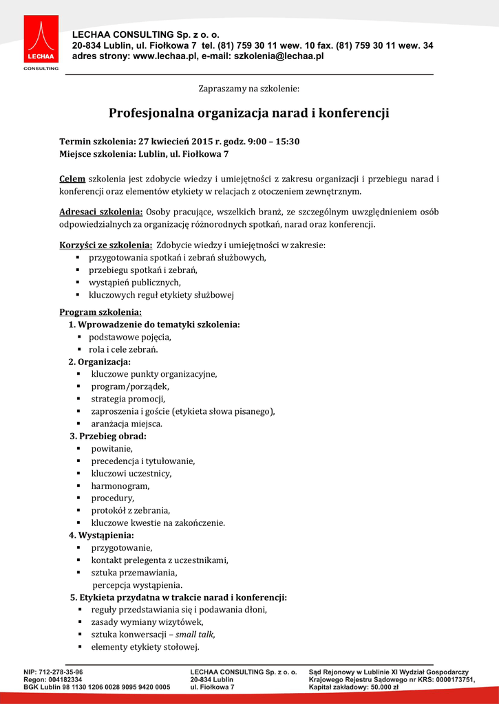 LECHAA CONSULTING Sp. z o. o. 20-834 Lublin, ul. Fiołkowa 7 tel. (81) 759 30 11 wew. 10 fax. (81) 759 30 11 wew. 34 adres strony: www.lechaa.pl, e-mail: [email protected] Zapraszamy na szkolenie: Profesjonalna organizacja narad i konferencji Termin szkolenia: 27 kwiecień 2015 r. godz. 9:00 – 15:30 Miejsce szkolenia: Lublin, ul. Fiołkowa 7 Celem szkolenia jest zdobycie wiedzy i umiejętności z zakresu organizacji i przebiegu narad i konferencji oraz elementów etykiety w relacjach z otoczeniem zewnętrznym. Adresaci szkolenia: Osoby pracujące, wszelkich branż, ze szczególnym uwzględnieniem osób odpowiedzialnych za organizację różnorodnych spotkań, narad oraz konferencji. Korzyści ze szkolenia: Zdobycie wiedzy i umiejętności w zakresie: przygotowania spotkań i zebrań służbowych, przebiegu spotkań i zebrań, wystąpień publicznych, kluczowych reguł etykiety służbowej Program szkolenia: 1. Wprowadzenie do tematyki szkolenia: podstawowe pojęcia, rola i cele zebrań. 2. Organizacja: kluczowe punkty organizacyjne, program/porządek, strategia promocji, zaproszenia i goście (etykieta słowa pisanego), aranżacja miejsca. 3. Przebieg obrad: powitanie, precedencja i tytułowanie, kluczowi uczestnicy, harmonogram, procedury, protokół z zebrania, kluczowe kwestie na zakończenie. 4. Wystąpienia: przygotowanie, kontakt prelegenta z uczestnikami, sztuka przemawiania, percepcja wystąpienia. 5. Etykieta przydatna w trakcie narad i konferencji: reguły przedstawiania się i podawania dłoni, zasady wymiany wizytówek, sztuka konwersacji – small talk, elementy etykiety stołowej. LECHAA CONSULTING Sp. z o. o. 20-834 Lublin, ul. Fiołkowa 7 tel. (81) 759 30 11 wew. 10 fax. (81) 759 30 11 wew. 34 adres strony: www.lechaa.pl, e-mail: [email protected] Prowadząca zajęcia: Karolina Grochowicz-Stec – Doradca z zakresu etykiety i savoir-vivre, certyfikowany trener. Z wykształcenia internacjolog (UMCS). Absolwentka Public Relations (WSPA) oraz Akademii Młodych Dyplomatów (Europejska Akademia Dyplomacji). Wiedzę i umiejętności zdobywała m.in. w trakcie współpracy z Posłem do Parlamentu Europejskiego, administracją publiczną, przedsiębiorcami i organizacjami pozarządowymi. Posiada doświadczenie z zakresu organizacji spotkań i konferencji, kontaktów z mediami. Prowadzi szkolenia grupowe (otwarte i „szyte na miarę” klienta) oraz konsultacje indywidualne z zakresu etykiety i dress code. Pasjonatka dobrych obyczajów i tajników klasycznego wizerunku. Autorka bloga poświęconego dobrym manierom – GOODMANNERS.PL. Koszt szkolenia: 250 zł brutto/osoba Cena obejmuje: obsługa organizacyjna szkolenia, materiały szkoleniowe, serwis kawowy, lunch, zaświadczenie ukończenia szkolenia. Termin zgłoszenia: 20.04.2015 r. Osoby, które zostaną zgłoszone na szkolenie, otrzymają potwierdzenie udziału w szkoleniu. Organizator zastrzega sobie prawo do odwołania szkolenia w przypadku otrzymania zbyt małej liczby zgłoszeń. O ewentualnym odwołaniu szkolenia zostaną Państwo poinformowani telefonicznie. Ilość miejsc ograniczona. Decyduje kolejność zgłoszeń. Informacje pod nr tel. 81/759-30-11 wew. 5, e-mail: [email protected]