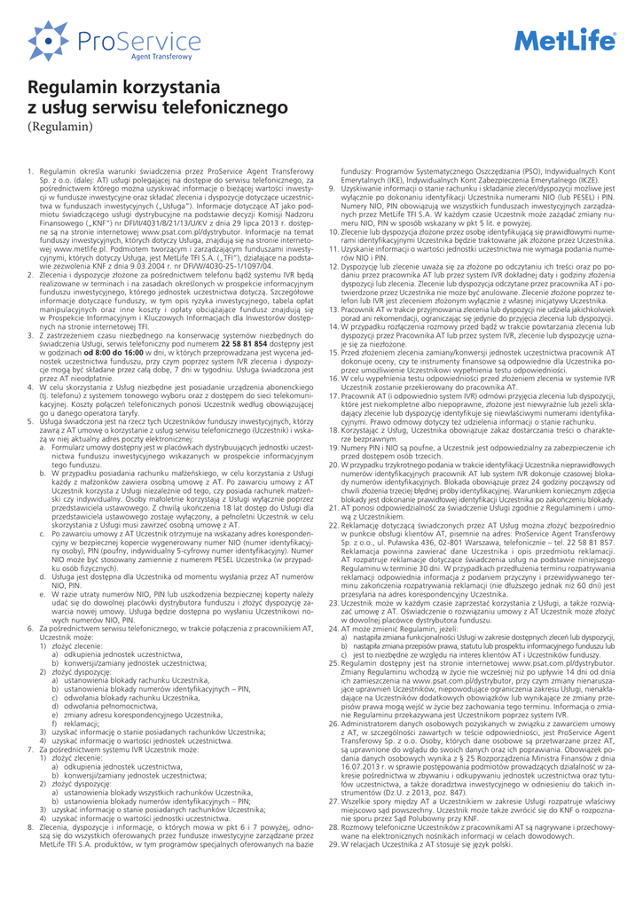 Regulamin korzystania z usług serwisu telefonicznego (Regulamin) 1. Regulamin określa warunki świadczenia przez ProService Agent Transferowy Sp. z o.o. (dalej: AT) usługi polegającej na dostępie do serwisu telefonicznego, za pośrednictwem którego można uzyskiwać informacje o bieżącej wartości inwestycji w fundusze inwestycyjne oraz składać zlecenia i dyspozycje dotyczące uczestnictwa w funduszach inwestycyjnych („Usługa”). Informacje dotyczące AT jako podmiotu świadczącego usługi dystrybucyjne na podstawie decyzji Komisji Nadzoru Finansowego („KNF”) nr DFI/II/4031/8/21/13/U/KV z dnia 29 lipca 2013 r. dostępne są na stronie internetowej www.psat.com.pl/dystrybutor. Informacje na temat funduszy inwestycyjnych, których dotyczy Usługa, znajdują się na stronie internetowej www.metlife.pl. Podmiotem tworzącym i zarządzającym funduszami inwestycyjnymi, których dotyczy Usługa, jest MetLife TFI S.A. („TFI”), działające na podstawie zezwolenia KNF z dnia 9.03.2004 r. nr DFI/W/4030-25-1/1097/04. 2. Zlecenia i dyspozycje złożone za pośrednictwem telefonu bądź systemu IVR będą realizowane w terminach i na zasadach określonych w prospekcie informacyjnym funduszu inwestycyjnego, którego jednostek uczestnictwa dotyczą. Szczegółowe informacje dotyczące funduszy, w tym opis ryzyka inwestycyjnego, tabela opłat manipulacyjnych oraz inne koszty i opłaty obciążające fundusz znajdują się w Prospekcie Informacyjnym i Kluczowych Informacjach dla Inwestorów dostępnych na stronie internetowej TFI. 3. Z zastrzeżeniem czasu niezbędnego na konserwację systemów niezbędnych do świadczenia Usługi, serwis telefoniczny pod numerem 22 58 81 854 dostępny jest w godzinach od 8:00 do 16:00 w dni, w których przeprowadzana jest wycena jednostek uczestnictwa funduszu, przy czym poprzez system IVR zlecenia i dyspozycje mogą być składane przez całą dobę, 7 dni w tygodniu. Usługa świadczona jest przez AT nieodpłatnie. 4. W celu skorzystania z Usług niezbędne jest posiadanie urządzenia abonenckiego (tj. telefonu) z systemem tonowego wyboru oraz z dostępem do sieci telekomunikacyjnej. Koszty połączeń telefonicznych ponosi Uczestnik według obowiązującej go u danego operatora taryfy. 5. Usługa świadczona jest na rzecz tych Uczestników funduszy inwestycyjnych, którzy zawrą z AT umowę o korzystanie z usług serwisu telefonicznego (Uczestnik) i wskażą w niej aktualny adres poczty elektronicznej: a. Formularz umowy dostępny jest w placówkach dystrybuujących jednostki uczestnictwa funduszu inwestycyjnego wskazanych w prospekcie informacyjnym tego funduszu. b. W przypadku posiadania rachunku małżeńskiego, w celu korzystania z Usługi każdy z małżonków zawiera osobną umowę z AT. Po zawarciu umowy z AT Uczestnik korzysta z Usługi niezależnie od tego, czy posiada rachunek małżeński czy indywidualny. Osoby małoletnie korzystają z Usługi wyłącznie poprzez przedstawiciela ustawowego. Z chwilą ukończenia 18 lat dostęp do Usługi dla przedstawiciela ustawowego zostaje wyłączony, a pełnoletni Uczestnik w celu skorzystania z Usługi musi zawrzeć osobną umowę z AT. c. Po zawarciu umowy z AT Uczestnik otrzymuje na wskazany adres korespondencyjny w bezpiecznej kopercie wygenerowany numer NIO (numer identyfikacyjny osoby), PIN (poufny, indywidualny 5-cyfrowy numer identyfikacyjny). Numer NIO może być stosowany zamiennie z numerem PESEL Uczestnika (w przypadku osób fizycznych). d. Usługa jest dostępna dla Uczestnika od momentu wysłania przez AT numerów NIO, PIN. e. W razie utraty numerów NIO, PIN lub uszkodzenia bezpiecznej koperty należy udać się do dowolnej placówki dystrybutora funduszu i złożyć dyspozycję zawarcia nowej umowy. Usługa będzie dostępna po wysłaniu Uczestnikowi nowych numerów NIO, PIN. 6. Za pośrednictwem serwisu telefonicznego, w trakcie połączenia z pracownikiem AT, Uczestnik może: 1) złożyć zlecenie: a) odkupienia jednostek uczestnictwa, b) konwersji/zamiany jednostek uczestnictwa; 2) złożyć dyspozycję: a) ustanowienia blokady rachunku Uczestnika, b) ustanowienia blokady numerów identyfikacyjnych – PIN, c) odwołania blokady rachunku Uczestnika, d) odwołania pełnomocnictwa, e) zmiany adresu korespondencyjnego Uczestnika, f) reklamacji; 3) uzyskać informację o stanie posiadanych rachunków Uczestnika; 4) uzyskać informację o wartości jednostek uczestnictwa. 7. Za pośrednictwem systemu IVR Uczestnik może: 1) złożyć zlecenie: a) odkupienia jednostek uczestnictwa, b) konwersji/zamiany jednostek uczestnictwa; 2) złożyć dyspozycję: a) ustanowienia blokady wszystkich rachunków Uczestnika, b) ustanowienia blokady numerów identyfikacyjnych – PIN; 3) uzyskać informację o stanie posiadanych rachunków Uczestnika; 4) uzyskać informację o wartości jednostki uczestnictwa. 8. Zlecenia, dyspozycje i informacje, o których mowa w pkt 6 i 7 powyżej, odnoszą się do wszystkich oferowanych przez fundusze inwestycyjne zarządzane przez MetLife TFI S.A. produktów, w tym programów specjalnych oferowanych na bazie funduszy: Programów Systematycznego Oszczędzania (PSO), Indywidualnych Kont Emerytalnych (IKE), Indywidualnych Kont Zabezpieczenia Emerytalnego (IKZE). 9. Uzyskiwanie informacji o stanie rachunku i składanie zleceń/dyspozycji możliwe jest wyłącznie po dokonaniu identyfikacji Uczestnika numerami NIO (lub PESEL) i PIN. Numery NIO, PIN obowiązują we wszystkich funduszach inwestycyjnych zarządzanych przez MetLife TFI S.A. W każdym czasie Uczestnik może zażądać zmiany numeru NIO, PIN w sposób wskazany w pkt 5 lit. e powyżej. 10.Zlecenie lub dyspozycja złożone przez osobę identyfikującą się prawidłowymi numerami identyfikacyjnymi Uczestnika będzie traktowane jak złożone przez Uczestnika. 11.Uzyskanie informacji o wartości jednostki uczestnictwa nie wymaga podania numerów NIO i PIN. 12.Dyspozycję lub zlecenie uważa się za złożon