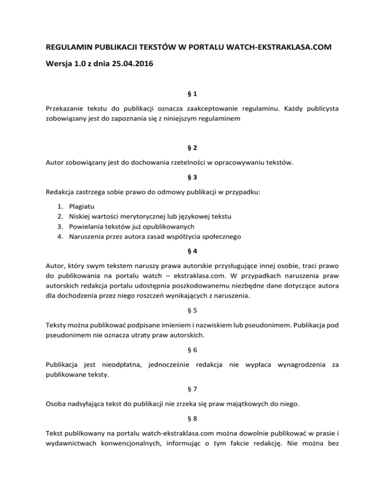 REGULAMIN PUBLIKACJI TEKSTÓW W PORTALU WATCH-EKSTRAKLASA.COM Wersja 1.0 z dnia 25.04.2016 §1 Przekazanie tekstu do publikacji oznacza zaakceptowanie regulaminu. Każdy publicysta zobowiązany jest do zapoznania się z niniejszym regulaminem §2 Autor zobowiązany jest do dochowania rzetelności w opracowywaniu tekstów. §3 Redakcja zastrzega sobie prawo do odmowy publikacji w przypadku: 1. 2. 3. 4. Plagiatu Niskiej wartości merytorycznej lub językowej tekstu Powielania tekstów już opublikowanych Naruszenia przez autora zasad współżycia społecznego §4 Autor, który swym tekstem naruszy prawa autorskie przysługujące innej osobie, traci prawo do publikowania na portalu watch – ekstraklasa.com. W przypadkach naruszenia praw autorskich redakcja portalu udostępnia poszkodowanemu niezbędne dane dotyczące autora dla dochodzenia przez niego roszczeń wynikających z naruszenia. §5 Teksty można publikować podpisane imieniem i nazwiskiem lub pseudonimem. Publikacja pod pseudonimem nie oznacza utraty praw autorskich. §6 Publikacja jest nieodpłatna, jednocześnie redakcja nie wypłaca wynagrodzenia za publikowane teksty. §7 Osoba nadsyłająca tekst do publikacji nie zrzeka się praw majątkowych do niego. §8 Tekst publikowany na portalu watch-ekstraklasa.com można dowolnie publikować w prasie i wydawnictwach konwencjonalnych, informując o tym fakcie redakcję. Nie można bez wcześniejszego porozumienia z redakcją portalu publikować takiego tekstu na innej witrynie internetowej (nie dotyczy to blogów autorów). Autor zgadza się więc na internetową wyłączność watch – ekstraklasa.com do publikacji swojego tekstu. Publikacja na innej witrynie powoduje usunięcie tekstu z watch – ekstraklasa.com, a autor może utracić prawo do publikowania w przyszłości na naszym portalu. §9 Nadesłanie do nas podpisanego materiału oznacza wyrażenie zgody na jego publikację nie ograniczoną terminem. Wycofanie tekstu lub tekstów z portalu watch – ekstraklasa.com na żądanie autora możliwe jest tylko w wyjątkowych sytuacjach, z ważnych przyczyn oraz po pokryciu kosztów pracy redaktorskiej związanej z korektą i przygotowaniem tekstu do internetowej publikacji. § 10 Autor tekstu przekazując go do publikacji zezwala redakcji na wykorzystanie jego fragmentów do promocji samego tekstu oraz portalu w mediach, w tym mediach społecznościowych. § 11 Autor może zasugerować redakcji w jakim dziale chciałby widzieć swoją publikację, niemniej decyzja o klasyfikacji tekstu należy do redakcji. § 12 Redakcja watch – ekstraklasa posiada prawo do redagowania tekstów, nadawania tytułów oraz skracania tekstów zbyt obszernych. Nie dokonujemy merytorycznej ingerencji w nadesłany tekst, chyba że w tekście znajduje się oczywisty błąd. Ewentualne propozycje zmian tego typu są uzgadniane z autorem tekstu. § 13 Zastrzegamy sobie możliwość usunięcia z portalu tekstu bez podania przyczyn, w szczególności jeżeli okaże się on nierzetelny lub nieprawdziwy.