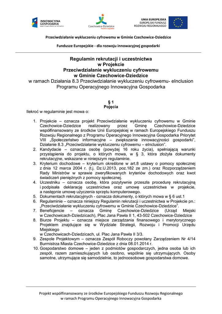Przeciwdziałanie wykluczeniu cyfrowemu w Gminie Czechowice-Dziedzice Fundusze Europejskie - dla rozwoju innowacyjnej gospodarki Regulamin rekrutacji i uczestnictwa w Projekcie Przeciwdziałanie wykluczeniu cyfrowemu w Gminie Czechowice-Dziedzice w ramach Działania 8.3 Przeciwdziałanie wykluczeniu cyfrowemu- eInclusion Programu Operacyjnego Innowacyjna Gospodarka §1 Pojęcia Ilekroć w regulaminie jest mowa o: 1. Projekcie – oznacza projekt Przeciwdziałanie wykluczeniu cyfrowemu w Gminie Czechowice-Dziedzice realizowany przez Gminę Czechowice-Dziedzice współfinansowany ze środków Unii Europejskiej w ramach Europejskiego Funduszu Rozwoju Regionalnego z Programu Operacyjnego Innowacyjna Gospodarka Priorytet VIII „Społeczeństwo informacyjne – zwiększanie innowacyjności gospodarki”, Działanie 8.3 „Przeciwdziałanie wykluczeniu cyfrowemu – eInclusion”. 2. Kandydacie – oznacza osobę (powyżej 16 roku życia), spełniającą warunki przystąpienia do projektu, o których mowa, w § 3, która złożyła dokumenty rekrutacyjne, wskazane w niniejszym regulaminie. 3. Kryterium dochodowe – kryterium określone w art.8 ustawy o pomocy społecznej z dnia 12 marca 2004 r. (t.j. Dz.U.2013, poz.182 ze zm.) oraz Rozporządzeniem Rady Ministrów w sprawie zweryfikowanych kryteriów dochodowych oraz kwot świadczeń pieniężnych z pomocy społecznej. 4. Uczestniku – oznacza osobę, która pozytywnie przeszła procedurę rekrutacyjną i podpisała deklarację uczestnictwa oraz umowę uczestnictwa w projekcie, a następnie umowę użyczenia sprzętu komputerowego. 5. Dokumentach rekrutacyjnych - oznacza dokumenty, o których mowa w § 6 ust.1 6. Regulaminie – oznacza niniejszy Regulamin rekrutacji i uczestnictwa w Projekcie pn.: „Przeciwdziałanie wykluczeniu cyfrowemu w Gminie Czechowice-Dziedzice”. 7. Beneficjencie – oznacza Gminę Czechowice-Dziedzice (Urząd Miejski w Czechowicach-Dziedzicach), Plac Jana Pawła II 1, 43-502 Czechowice-Dziedzice 8. Biurze Projektu – oznacza miejsce zarządzania finansowego i merytorycznego Projektem znajdujące się w Wydziale Strategii, Rozwoju i Promocji Urzędu Miejskiego w Czechowicach-Dziedzicach, ul. Plac Jana Pawła II 3/3. 9. Zespole Projektowym – oznacza Zespół Roboczy powołany Zarządzeniem Nr 4/14 Burmistrza Miasta Czechowice-Dziedzice z dnia 08.01.2014 r. 10. Gospodarstwo domowe – jeden z podmiotów gospodarczych, jedna osoba lub ich zespół, razem zamieszkujących lub osobno, wspólnie się utrzymujących. Osoby samotne, utrzymujące się samodzielnie, to jednoosobowe gospodarstwa domowe. Projekt współfinansowany ze środków Europejskiego Funduszu Rozwoju Regionalnego w ramach Programu Operacyjnego Innowacyjna Gospodarka Przeciwdziałanie wykluczeniu cyfrowemu w Gminie Czechowice-Dziedzice Fundusze Europejskie - dla rozwoju innowacyjnej gospodarki §2 Zasady ogólne 1. Celem Regulaminu jest sprecyzowanie zasad naboru Kandydatów do Projektu, które zapewniają bezstronność i przejrzystość procesu rekrutacji. 2. Głównym celem projektu jest zapewnienie dostępu do Szerokopasmowego Internetu 40 gospodarstwom domowym zagrożonym wykluczeniem cyfrowym z powodu trudnej sytuacji ekonomiczno-finansowej i/lub gospodarstwom z osobą z orzeczonym stopniem niepełnosprawności (lub orzeczeniem równoważnym) z terenu gminy Czechowice-Dziedzice. Dostęp zapewniony będzie przez okres 12 miesięcy realizacji projektu oraz przez 5 lat od momentu zakończenia jego realizacji. 3. Realizacja Projektu odbywa się bez udziału finansowego Uczestnika. §3 Uczestnicy Projektu Kandydaci chcący przystąpić do Projektu muszą łącznie spełniać następujące warunki: 1. posiadają zameldowanie na pobyt stały w Czechowicach-Dziedzicach i mieszkają na terenie gminy Czechowice-Dziedzice, 2. nie posiadają dostępu do Internetu w miejscu zamieszkania, 3. posiadają ukończony 16 rok życia, 4. nie korzystali w ostatnich trzech latach z dofinansowania do zakupu komputera ze środków Państwowego Funduszu Rehabilitacji Osób Niepełnosprawnych, 5. posiadają (bądź członek rodziny posiada) uprawnienia do korzystania ze wsparcia w ramach systemu pomocy społecznej (w tym świadczeń rodzinnych) oraz/lub mają orzeczony stopień niepełnosprawności (lub orzeczenie równoważne), a dochód na osobę w rodzinie nie przekracza 200% kryterium dochodowego, o którym mowa w § 1. §4 Etapy Projektu W ramach realizowanego przez Beneficjenta Projektu zaplanowane są następujące działania: 1. promocja Projektu, 2. rekrutacja do Projektu, 3. przeszkolenie z obsługi komputera i Internetu dla 60 członków gospodarstw domowych, 4. zakup sprzętu komputerowego wraz z oprogramowaniem dla 40 uczestników, 5. zapewnienie dostępu do Internetu dla Uczestników w okresie realizacji Projektu oraz 5 lat po jego zakończeniu, 6. zapewnienie pomocy technicznej dla Uczestników, związanej z dostarczonym sprzętem i dostępem do Internetu, 7. przeprowadzenie corocznych przeglądów sprzętu komputerowego u Uczestników, 8. kontrole sprzętu komputerowego u Uczestników. Projekt współfinansowany ze środków Europejskiego Funduszu Rozwoju Regionalnego w ramach Programu Operacyjnego Innowacyjna Gospodarka Przeciwdziałanie wykluczeniu cyfrowemu w Gminie Czechowice-Dziedzice Fundusze Europejskie - dla rozwoju innowacyjnej gospodarki §5 Rekrutacja do Projektu 1. Rekrutacja do Projektu zostanie przeprowadzona w trybie naboru dokumentacji rekrutacyjnej w lutym 2014 r. i będzie składała się z następujących etapów: a) przyjmowanie formularzy rekrutacyjnych; b) ocena formalna formularzy rekrutacyjnych; c) ocena merytoryczna formularzy rekrutacyjnych. 2. Dopuszczalne jest przedłożenie w ramach rekrutacji do Projektu tylko jednego formularza rekrutacyjnego przez jednego Kandydata. Złożenie kolejnego formularza rekrutacyjnego jest równoznaczne z jego odrzuceniem. 3. Uczestnikiem Projektu może być tylko jedna osoba z jednego gospodarst