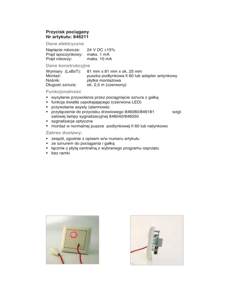 Przycisk poci gany Nr artykułu: 846211 Dane elektryczne Napi cie robocze: Pr d spoczynkowy: Pr d roboczy: 24 V DC ±15% maks. 1 mA maks. 10 mA Dane konstrukcyjne Wymiary (LxBxT): Monta : No nik: Długo sznura: 81 mm x 81 mm x ok. 25 mm puszka podtynkowa fi 60 lub adapter antynkowy płytka monta owa ok. 2,5 m (czerwony) Funkcjonalno wysyłanie przywołania przez poci gni cie sznura z gałk funkcja wiatła uspokajaj cego (czerwona LED) przywołanie asysty (alarmowe) przył czenie do przycisku drzwiowego 846080/846181 salowej lampy sygnalizacyjnej 846040/846050 sygnalizacja optyczna monta w normalnej puszce podtynkowej fi 60 lub natynkowo Zakres dostawy: zespół, zgodnie z opisem w/w numeru artykułu ze sznurem do poci gania i gałk ł cznie z płyt centraln z wybranego programu osprz tu bez ramki wzgl.