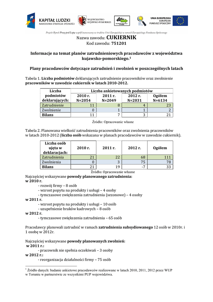 Nazwa zawodu: CUKIERNIK Kod zawodu: 751201 Informacje na temat planów zatrudnieniowych pracodawców z województwa kujawsko-pomorskiego.1 Plany pracodawców dotyczące zatrudnień i zwolnień w poszczególnych latach Tabela 1. Liczba podmiotów deklarujących zatrudnienie pracowników oraz zwolnienie pracowników w zawodzie cukiernik w latach 2010-2012. Liczba podmiotów deklarujących: Zatrudnienie Zwolnienie Bilans Liczba ankietowanych podmiotów 2010 r. 2011 r. 2012 r. Ogółem N=2054 N=2049 N=2031 N=6134 11 8 4 23 0 1 1 2 11 7 3 21 Źródło: Opracowanie własne Tabela 2. Planowana wielkość zatrudnienia pracowników oraz zwolnienia pracowników w latach 2010-2012 (liczba osób wskazana w planach pracodawców w zawodzie cukiernik). Liczba osób ujęta w deklaracjach: Zatrudnienia Zwolnienia Bilans 2010 r. 2011 r. 21 0 21 2012 r. 22 3 19 Ogółem 68 75 -7 111 78 33 Źródło: Opracowanie własne Najczęściej wskazywane powody planowanego zatrudnienia: w 2010 r. - rozwój firmy – 8 osób - wzrost popytu na produkty i usługi – 4 osoby - tymczasowe zwiększenia zatrudnienia (sezonowe) – 4 osoby w 2011 r. - wzrost popytu na produkty i usługi – 10 osób - uzupełnienie braków kadrowych – 8 osób w 2012 r. - tymczasowe zwiększenia zatrudnienia – 65 osób Pracodawcy planowali zatrudnić w ramach zatrudnienia subsydiowanego 12 osób w 2010r. i 1 osobę w 2012r. Najczęściej wskazywane powody planowanych zwolnień: w 2011 r.: - pracownik nie spełnia oczekiwań – 3 osoby w 2012 r.: - reorganizacja działalności firmy – 75 osób 1 Źródło danych: badanie ankietowe pracodawców realizowane w latach 2010, 2011, 2012 przez WUP w Toruniu w partnerstwie ze wszystkimi PUP województwa. DANE OGÓŁEM Z TRZECH EDYCJI BADANIA – 2010, 2011, 2012; N=111 (liczba osób planowanych do zatrudnienia) Profil pracodawcy: 1. 81 osób w zawodzie cukiernik poszukiwanych było przez podmioty duże. 2. 110 ofert pochodziło od pracodawców z sektora prywatnego. 3. Najwięcej wolnych miejsc (107) z sekcji: Przetwórstwo przemysłowe Potrzeby pracodawców: Oczekiwania wobec kandydatów na stanowiska pracy w zawodzie cukiernik: 1. Znajomość obsługi programów komputerowych Nie była wymagana w przypadku 108 ofert pracy. 2. Znajomość języka obcego Pracodawcy nie oczekiwali od kandydatów znajomości języka obcego na żadnym z oferowanych stanowisk. 3. Ogólne doświadczenie zawodowe W większości przypadków (50 ofert) pracodawcy oczekiwali doświadczenia zawodowego, ale nie sprecyzowali swoich wymagań, 20 ofert wiązało się z minimum rocznym doświadczeniem, na 24 stanowiskach pracodawcy nie wymagali żadnego doświadczenia. 4. Doświadczenie na podobnym stanowisku Podobnie jak wyżej, pracodawcy nie określili wymaganego doświadczenia w przypadku 50 oferowanych miejsc pracy. Najczęściej poszukiwani byli kandydaci z minimum rocznym doświadczeniem na podobnym stanowisku (27 osób). W przypadku 20 ofert doświadczenie nie było oczekiwane. 5. Cechy indywidualne Cechy indywidualne były oczekiwane przez pracodawców i miały dla nich duże znaczenie. Wszystkie cechy zaproponowane w katalogu badania zostały wskazane jako wymagane na stanowisku cukiernika. Poniżej prezentujemy cechy w kolejności od najczęściej oczekiwanej (na jednym stanowisku można było wskazać kilka cech jednocześnie): • Staranność wykonywania pracy – 105 stanowisk2 • Umiejętność pracy zespołowej – 100 stanowisk • Obowiązkowość – 97 stanowisk • Szybkość uczenia się – 94 stanowiska • Samodzielność – 77 stanowisk • Dobra organizacja pracy własnej – 66 stanowisk • Komunikatywność – 66 stanowisk • Gotowość do podnoszenia kwalifikacji – 63 stanowiska • Ambicja – 61 stanowisk • Radzenie sobie ze stresującymi sytuacjami – 4 stanowiska 2 Oznacza to, że w przypadku 105 oferowanych miejsc pracy, pracodawca będzie oczekiwał od kandydata staranności wykonywania pracy. 6. Wiedza specjalistyczna, ukończone dodatkowe specjalistyczne kursy, szkolenia W przypadku 99 ofert dodatkowe kwalifikacje nie były wymagane, 10 stanowisk wiązało się z oczekiwaniem znajomości technologii produkcji. 7. Prawo jazdy Prawo jazdy nie było wymagane w 103 przypadkach, 6 stanowisk dotyczyło posiadania prawa jazdy kategorii B. 8. Inne: W przypadku 50 miejsc pracy jako inne wymagania pracodawcy wskazali posiadanie orzeczenia o stopniu niepełnosprawności, część ofert związana jest także z oczekiwaniem posiadania pracowniczej książeczki zdrowia do celów sanitarnoepidemiologicznych (15 stanowisk).