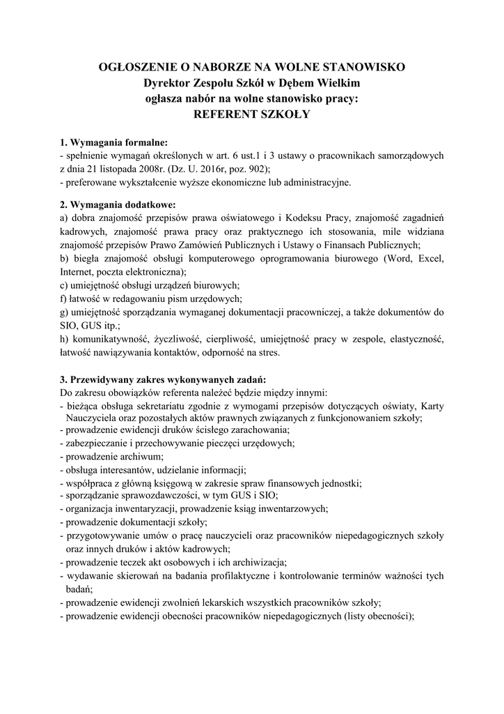 OGŁOSZENIE O NABORZE NA WOLNE STANOWISKO Dyrektor Zespołu Szkół w Dębem Wielkim ogłasza nabór na wolne stanowisko pracy: REFERENT SZKOŁY 1. Wymagania formalne: - spełnienie wymagań określonych w art. 6 ust.1 i 3 ustawy o pracownikach samorządowych z dnia 21 listopada 2008r. (Dz. U. 2016r, poz. 902); - preferowane wykształcenie wyższe ekonomiczne lub administracyjne. 2. Wymagania dodatkowe: a) dobra znajomość przepisów prawa oświatowego i Kodeksu Pracy, znajomość zagadnień kadrowych, znajomość prawa pracy oraz praktycznego ich stosowania, mile widziana znajomość przepisów Prawo Zamówień Publicznych i Ustawy o Finansach Publicznych; b) biegła znajomość obsługi komputerowego oprogramowania biurowego (Word, Excel, Internet, poczta elektroniczna); c) umiejętność obsługi urządzeń biurowych; f) łatwość w redagowaniu pism urzędowych; g) umiejętność sporządzania wymaganej dokumentacji pracowniczej, a także dokumentów do SIO, GUS itp.; h) komunikatywność, życzliwość, cierpliwość, umiejętność pracy w zespole, elastyczność, łatwość nawiązywania kontaktów, odporność na stres. 3. Przewidywany zakres wykonywanych zadań: Do zakresu obowiązków referenta należeć będzie między innymi: - bieżąca obsługa sekretariatu zgodnie z wymogami przepisów dotyczących oświaty, Karty Nauczyciela oraz pozostałych aktów prawnych związanych z funkcjonowaniem szkoły; - prowadzenie ewidencji druków ścisłego zarachowania; - zabezpieczanie i przechowywanie pieczęci urzędowych; - prowadzenie archiwum; - obsługa interesantów, udzielanie informacji; - współpraca z główną księgową w zakresie spraw finansowych jednostki; - sporządzanie sprawozdawczości, w tym GUS i SIO; - organizacja inwentaryzacji, prowadzenie ksiąg inwentarzowych; - prowadzenie dokumentacji szkoły; - przygotowywanie umów o pracę nauczycieli oraz pracowników niepedagogicznych szkoły oraz innych druków i aktów kadrowych; - prowadzenie teczek akt osobowych i ich archiwizacja; - wydawanie skierowań na badania profilaktyczne i kontrolowanie terminów ważności tych badań; - prowadzenie ewidencji zwolnień lekarskich wszystkich pracowników szkoły; - prowadzenie ewidencji obecności pracowników niepedagogicznych (listy obecności); - prowadzenie ewidencji urlopów pracowników administracyjno-obsługowych, przygotowywanie projektu planu urlopów, konsultowanie go z zainteresowanymi pracownikami i przedstawianie planu urlopów dyrektorowi do zatwierdzenia; - prowadzenie ewidencji delegacji służbowych; - wykonywanie prac związanych z prowadzeniem intendentury w Zespole Szkół; - prowadzenie korespondencji z placówkami i urzędami dotyczącej zagadnień z zakresu prowadzonych spraw; - koordynowanie wydarzeń na terenie szkoły; - terminowe wykonywanie doraźnie zleconych przez Dyrektora zadań wynikających z potrzeby zapewnienia prawidłowego funkcjonowania Zespołu Szkół. 4. Warunki pracy i płacy: Zatrudnienie na pełny etat w oparciu o umowę o pracę. Wynagrodzenie zgodne z Regulaminem Wynagradzania Pracowników Niepedagogicznych Zespołu Szkół w Dębem Wielkim. 5. Wymagane dokumenty: - list motywacyjny; - życiorys – CV; - kopie dokumentów potwierdzających wykształcenie, staż pracy; - inne dodatkowe dokumenty o posiadanych kwalifikacjach i umiejętnościach; - oświadczenie o niekaralności. Określenie miejsca i terminu składania wymaganych dokumentów: Wymagane dokumenty należy złożyć w terminie do 9 lutego 2017r. (czwartek) do godz. 1530 do sekretariatu Zespołu Szkół w Dębem Wielkim ul. Warszawska 78a w zamkniętej kopercie z dopiskiem: „Nabór na stanowisko referenta". Aplikacje, które wpłyną po określonym terminie nie będą rozpatrywane (UWAGA- decyduje fizyczny wpływ oferty do sekretariatu Zespołu Szkół w Dębem Wielkim). Lista kandydatów, którzy spełniają wymagania formalne umieszczona będzie na stronie internetowej Zespołu Szkół w Dębem Wielkim. Dyrektor Zespołu Szkół telefonicznie zaprosi kandydatów wybranych spośród ofert na rozmowy kwalifikacyjne. Informacja o wyniku naboru umieszczona będzie na stronie internetowej Zespołu Szkół w Dębem Wielkim. Dokumenty: list motywacyjny i CV powinny być podpisane i opatrzone klauzulą: „Wyrażam zgodę na przetwarzanie moich danych osobowych zawartych w ofercie pracy dla potrzeb niezbędnych do realizacji procesu rekrutacji zgodnie z ustawą z dnia 29 sierpnia 1997r. o ochronie danych osobowych ( Dz. U. z 2014r. poz. 1182, z późn. zm.)”.