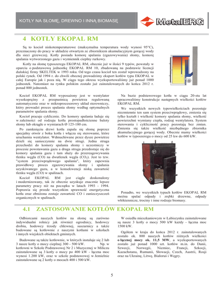 KOTŁY NA SŁOMĉ, DREWNO I INNĄ BIOMASĉ 4 KOTŁY EKOPAL RM Są to kocioł niskotemperaturowe (maksymalna temperatura wody wynosi 95°C), przeznaczony do pracy w układzie otwartym ze zbiornikiem akumulacyjnym gorącej wody dla sieci grzewczej. Kotły posiada komorĊ spalania (zgazowywania) słomy, komorĊ spalania wytworzonego gazu i wymiennik cieplny rurkowy. Kotły na słomĊ typoszeregu EKOPAL RM, obecnie juĪ w iloĞci 9 typów, powstały w oparciu o podstawową jednostkĊ EKOPAL RM 10, zbudowaną na podstawie licencji duĔskiej firmy SKELTEK w 1993 roku. Od tego czasu kocioł ten został wprowadzony na polski rynek. Od 1994 r. do chwili obecnej prowadzimy eksport kotłów typu EKOPAL w całej Europie jak i poza nią. W ciągu tego okresu wyeksportowaliĞmy juĪ ponad 1000 jednostek. Natomiast na rynku polskim zostało juĪ zainstalowanych do koĔca 2012 r. ponad 800 jednostek. Na bazie podstawowego kotła w ciągu 20-stu lat opracowaliĞmy konstrukcje nastĊpnych wielkoĞci kotłów EKOPAL RM. We wszystkich nowych typowielkoĞciach pozostaje niezmiennie ten sam system przeciwprądowy, zmienia siĊ tylko kształt i wielkoĞü komory spalania słomy, wielkoĞü powierzchni wymiany ciepła, rodzaj wentylatora. System sterowania i cyklicznoĞü pracy pozostają bez zmian. Zmienia siĊ takĪe wielkoĞü niezbĊdnego zbiornika akumulacyjnego gorącej wody. Obecnie mamy wielkoĞci kotłów w typoszeregu o mocy od 25 kw do 600 kW. Kocioł EKOPAL RM wyposaĪony jest w wentylator wysokoprĊĪny z przepustnicą powietrza regulowaną automatycznie oraz w mikroprocesorowy układ sterowniczy, który prowadzi proces spalania słomy według optymalnych parametrów spalania słomy. Kocioł pracuje cyklicznie. Do komory spalania ładuje siĊ w zaleĪnoĞci od rodzaju kotła prostopadłoĞcienne baloty słomy lub okrągłe o wymiarach Ø 125-180 cm. Po zamkniĊciu drzwi kotła zapala siĊ słomĊ poprzez specjalny otwór z boku kotła i włącza siĊ sterowanie, które uruchamia wentylator. Wdmuchiwane przez dysze powietrze dzieli siĊ samoczynnie na dwie strugi. Jedna struga przechodzi do komory spalania słomy i uczestniczy w procesie powstawania gazu a druga struga przedostaje siĊ do komory spalania gazu i tam słuĪy do przereagowywania tlenku wĊgla (CO) na dwutlenek wĊgla (CO2). Jest to tzw. "system przeciwprądowego spalania", który zapewnia prawidłowy proces zgazowywania słomy i spalania uzyskiwanego gazu, a w konsekwencji niską zawartoĞü tlenku wĊgla (CO) w spalinach. Kocioł EKOPAL RM jest ciągle doskonalony i modernizowany, tak Īe obecnie uzyskuje znacznie lepsze parametry pracy niĪ na początku w latach 1993 - 1994. Poprawia siĊ przede wszystkim sprawnoĞü energetyczna kotła oraz obniĪona zostaje zawartoĞü CO i zanieczyszczeĔ organicznych w spalinach. 4.1 Ponadto, we wszystkich typach kotłów EKOPAL RM moĪna spalaü odpady i zrĊbki drzewne, odpady włókiennicze, trociny i inne rodzaje biomasy. ZASTOSOWANIE KOTŁÓW EKOPAL RM Odbiorcami naszych kotłów na słomĊ są indywidualni rolnicy jak równieĪ ogrodnicy, drobiu, hodowcy trzody chlewnej, suszarnicy budowane są kotłownie z naszymi kotłami w i innych wiejskich obiektach gminnych. W osiedlu mieszkaniowym w Łabiszynku zainstalowane są nasze 3 kotły o mocy 500 kW kaĪdy - łączna moc 1500 kW. zarówno hodowcy a takĪe szkołach Ogółem w kraju do koĔca 2012 r. zainstalowanych zostało ok. 800 naszych kotłów róĪnych wielkoĞci o łącznej mocy ok. 11,5 MW, a wyeksportowanych zostało juĪ ponad 1000 szt. kotłów m.in. do Danii, Szwecji, Norwegii, Niemiec, Francji, Szkocji, Kazachstanu, Rumunii, Słowacji, Czech, Austrii, Rosji oraz na UkrainĊ, LitwĊ, BiałoruĞ i WĊgry. Budowane są takĪe kotłownie, w których instaluje siĊ 2 lub 3 nasze kotły o mocy cieplnej 300 - 500 kW. Np. w kotłowni w Szkole Podstawowej Nr 2 i Muzycznej w Miliczu zainstalowane są 3 kotły o mocy po 400 kW - łączna moc wynosi 1.200 kW, oraz w szkole podstawowej w Jemielnie zainstalowane są 2 kotły o mocach 400 i 500 kW. 5 KOTŁY NA SŁOMĉ, DREWNO I INNĄ BIOMASĉ 4.2 INSTALACJA KOTŁÓW EKOPAL RM Kotły wsadowe na słomĊ są przeznaczone do wytwarzania wody o temperaturze do 95°C i mogą pracowaü wyłącznie w układach otwartych. Podstawową cechą pracy kaĪdego kotła EKOPAL RM jest to, Īe proces spalania ładunku słomy przebiega z jednakową prĊdkoĞcią, w parametrach jak najbardziej zbliĪonych do optymalnych dla słomy. W stosunkowo krótkim czasie wytwarza siĊ taka iloĞü ciepła, której normalnie nie jest w stanie przejąü instalacja grzewcza. Dlatego w układzie technologicznym kotłowni z kotłami wsadowymi konieczny jest zbiornik akumulacyjny dla gromadzenia ciepła, wytworzonego w procesie spalania ładunków słomy. Zbiornik taki zapewnia całkowity odbiór ciepła ze spalania kolejnych ładunków słomy. Gorąca woda pobierana jest z tego zbiornika na sieü grzewczą odbioru ciepła według wymaganego zapotrzebowania. PojemnoĞü zbiornika zaleĪna jest od wielkoĞci kotła. Zbiornik akumulacyjny musi mieü jak najlepszą izolacjĊ cieplną, aby straty ciepła do otoczenia były jak najmniejsze. Dla kotłów typoszeregu EKOPAL RM zalecane są nastĊpujące pojemnoĞci zbiorników akumulacyjnych (wiĊksze pojemnoĞci usprawniają jeszcze pracĊ kotłowni): Dla przeprowadzenia cyklu spalania ładunku słomy, naleĪy: • załadowaü słomĊ do komory spalania słomą, • zamknąü komorĊ spalania kotła i zapaliü słomĊ poprzez specjalny otwór, znajdujący siĊ w bocznej Ğcianie kotła, • włączyü sterowanie poprzez naciĞniĊcie odpowiedniego przycisku na skrzynce sterowniczej. Uruchamia siĊ wtedy wentylator nadmuchu powietrza do kotła oraz pompa przetłaczająca wodĊ pomiĊdzy kotłem i zbiornikiem akumulacyjnym. Po wykonaniu powyĪszych czynnoĞci, kocioł nie wymaga juĪ dalszego dozoru, gdyĪ proces spalania słomy prowadzony jest automatycznie mikroprocesorowym systemem ste