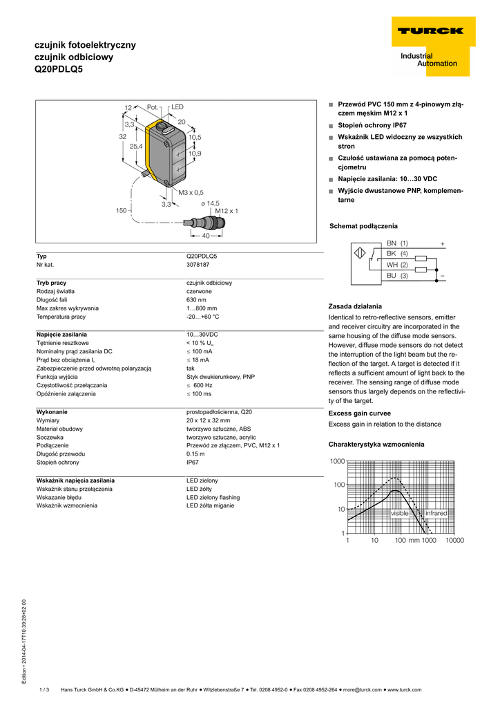 czujnik fotoelektryczny czujnik odbiciowy Q20PDLQ5 ■ ■ ■ ■ ■ ■ Przewód PVC 150 mm z 4-pinowym złączem męskim M12 x 1 Stopień ochrony IP67 Wskaźnik LED widoczny ze wszystkich stron Czułość ustawiana za pomocą potencjometru Napięcie zasilania: 10…30 VDC Wyjście dwustanowe PNP, komplementarne Schemat podłączenia Q20PDLQ5 3078187 Tryb pracy Rodzaj światła Długość fali Max zakres wykrywania Temperatura pracy czujnik odbiciowy czerwone 630 nm 1…800 mm -20…+60 °C Napięcie zasilania Tętnienie resztkowe Nominalny prąd zasilania DC Prąd bez obciążenia I0 Zabezpieczenie przed odwrotną polaryzacją Funkcja wyjścia Częstotliwość przełączania Opóźnienie załączenia 10…30VDC < 10 % Uss ð 100 mA ð 18 mA tak Styk dwukierunkowy, PNP ð 600 Hz ð 100 ms Wykonanie Wymiary Materiał obudowy Soczewka Podłączenie Długość przewodu Stopień ochrony prostopadłościenna, Q20 20 x 12 x 32 mm tworzywo sztuczne, ABS tworzywo sztuczne, acrylic Przewód ze złączem, PVC, M12 x 1 0.15 m IP67 Wskaźnik napięcia zasilania Wskaźnik stanu przełączenia Wskazanie błędu Wskaźnik wzmocnienia LED zielony LED żółty LED zielony flashing LED żółta miganie Zasada działania Identical to retro-reflective sensors, emitter and receiver circuitry are incorporated in the same housing of the diffuse mode sensors. However, diffuse mode sensors do not detect the interruption of the light beam but the reflection of the target. A target is detected if it reflects a sufficient amount of light back to the receiver. The sensing range of diffuse mode sensors thus largely depends on the reflectivity of the target. Excess gain curvee Excess gain in relation to the distance Charakterystyka wzmocnienia Edition • 2014-04-17T10:39:28+02:00 Typ Nr kat. 1/3 Hans Turck GmbH & Co.KG ñ D-45472 Mülheim an der Ruhr ñ Witzlebenstraße 7 ñ Tel. 0208 4952-0 ñ Fax 0208 4952-264 ñ [email protected] ñ www.turck.com czujnik fotoelektryczny czujnik odbiciowy Q20PDLQ5 Akcesoria montażowe Typ Nr kat. SMBQ20H 3079041 Rysunek wymiarowy Uchwyt montażowy, stal nierdzewna, montaż poziomy, dla serii Q20 SMBQ20L 3079040 Uchwyt montażowy, stal nierdzewna, prostopadłościenny, dla serii Q20 SMBQ20LV 3079042 Uchwyt montażowy, stal nierdzewna, prostopadłościenny, dla serii Q20 SMBQ20U 3079043 Obudowa ochronna, stal nierdzewna, dla obudowy Q20 Akcesoria - okablowanie Typ Nr kat. RKC4.4T-2/TEL 6625013 Rysunek wymiarowy Przewód podłączeniowy, złącze żeńskie M12, proste, 4-pinowe, długość: 2 m; materiał otuliny: PVC, czarny; certyfikat cULus; dostępne również inne długości kabli i typy otuliny, Edition • 2014-04-17T10:39:28+02:00 patrz www.turck.com 2/3 Hans Turck GmbH & Co.KG ñ D-45472 Mülheim an der Ruhr ñ Witzlebenstraße 7 ñ Tel. 0208 4952-0 ñ Fax 0208 4952-264 ñ [email protected] ñ www.turck.com czujnik fotoelektryczny czujnik odbiciowy Q20PDLQ5 Akcesoria - okablowanie Typ Nr kat. WKC4.4T-2/TEL 6625025 Rysunek wymiarowy Przewód podłączeniowy, złącze żeńskie M12, kątowe, 4-pinowe, długość: 2 m; materiał otuliny: PVC, czarny; certyfikat cULus; dostępne również inne długości kabli i typy otuliny, Edition • 2014-04-17T10:39:28+02:00 patrz www.turck.com 3/3 Hans Turck GmbH & Co.KG ñ D-45472 Mülheim an der Ruhr ñ Witzlebenstraße 7 ñ Tel. 0208 4952-0 ñ Fax 0208 4952-264 ñ [email protected] ñ www.turck.com