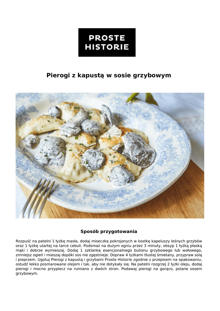 Pierogi z kapustą w sosie grzybowym Sposób przygotowania Rozpuść na patelni 1 łyżkę masła, dodaj miseczkę pokrojonych w kostkę kapeluszy leśnych grzybów oraz 1 łyżkę utartej na tarce cebuli. Podsmaż na dużym ogniu przez 3 minuty, obsyp 1 łyżką płaską mąki i dobrze wymieszaj. Dodaj 1 szklankę esencjonalnego bulionu grzybowego lub wołowego, zmniejsz ogień i mieszaj dopóki sos nie zgęstnieje. Dopraw 4 łyżkami tłustej śmietany, przypraw solą i pieprzem. Ugotuj Pierogi z kapustą i grzybami Proste Historie zgodnie z przepisem na opakowaniu, ostudź lekko posmarowane olejem i tak, aby nie dotykały się. Na patelni rozgrzej 2 łyżki oleju, dodaj pierogi i mocno przypiecz na rumiano z dwóch stron. Podawaj pierogi na gorąco, polane sosem grzybowym. Zastosowany produkt PIEROGI z kapustą i grzybami Powered by TCPDF (www.tcpdf.org)