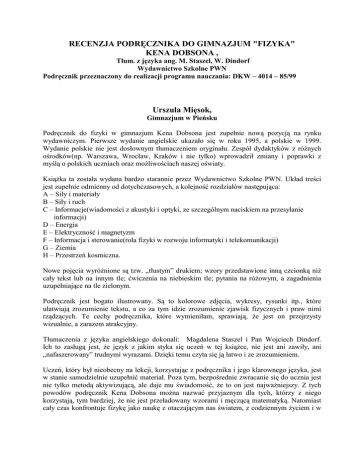 RECENZJA PODRĘCZNIKA DO GIMNAZJUM "FIZYKA" KENA DOBSONA , Tłum. z języka ang. M. Staszel, W. Dindorf Wydawnictwo Szkolne PWN Podręcznik przeznaczony do realizacji programu nauczania: DKW – 4014 – 85/99 Urszula Mięsok, Gimnazjum w Pieńsku Podręcznik do fizyki w gimnazjum Kena Dobsona jest zupełnie nową pozycją na rynku wydawniczym. Pierwsze wydanie angielskie ukazało się w roku 1995, a polskie w 1999. Wydanie polskie nie jest dosłownym tłumaczeniem oryginału. Zespół dydaktyków z różnych ośrodków(np. Warszawa, Wrocław, Kraków i nie tylko) wprowadził zmiany i poprawki z myślą o polskich uczniach oraz możliwościach naszej oświaty. Książka ta została wydana bardzo starannie przez Wydawnictwo Szkolne PWN. Układ treści jest zupełnie odmienny od dotychczasowych, a kolejność rozdziałów następująca: A – Siły i materiały B – Siły i ruch C – Informacje(wiadomości z akustyki i optyki, ze szczególnym naciskiem na przesyłanie informacji) D – Energia E – Elektryczność i magnetyzm F – Informacja i sterowanie(rola fizyki w rozwoju informatyki i telekomunikacji) G – Ziemia H – Przestrzeń kosmiczna. Nowe pojęcia wyróżnione są tzw. „tłustym” drukiem; wzory przedstawione inną czcionką niż cały tekst lub na innym tle; ćwiczenia na niebieskim tle; pytania na różowym, a zagadnienia uzupełniające na tle zielonym. Podręcznik jest bogato ilustrowany. Są to kolorowe zdjęcia, wykresy, rysunki itp., które ułatwiają zrozumienie tekstu, a co za tym idzie zrozumienie zjawisk fizycznych i praw nimi rządzących. Te cechy podręcznika, które wymieniłam, sprawiają, że jest on przejrzysty wizualnie, a zarazem atrakcyjny. Tłumaczenia z języka angielskiego dokonali: Magdalena Staszel i Pan Wojciech Dindorf. Ich to zasługą jest, że język z jakim styka się uczeń w tej książce, nie jest ani zawiły, ani „nafaszerowany” trudnymi wyrazami. Dzięki temu czyta się ją łatwo i ze zrozumieniem. Uczeń, który był nieobecny na lekcji, korzystając z podręcznika i jego klarownego języka, jest w stanie samodzielnie uzupełnić materiał. Poza tym, bezpośrednie zwracanie się do ucznia jest nie tylko metodą aktywizującą, ale daje mu świadomość, że to on jest najważniejszy. Z tych powodów podręcznik Kena Dobsona można nazwać przyjaznym dla tych, którzy z niego korzystają, tym bardziej, że nie jest przeładowany wzorami i męczącą matematyką. Natomiast cały czas konfrontuje fizykę jako naukę z otaczającym nas światem, z codziennym życiem i w ten sposób pobudza do działania, czyli obserwacji zjawisk zachodzących w przyrodzie oraz uczy dostrzegania jej piękna. Cała treść podręcznika mocno związana jest z nowoczesnością i osiągnięciami fizyki współczesnej, a zarazem nie zapomina o historii oraz ludziach, którzy ją tworzyli. Dobson proponuje swemu czytelnikowi porównywanie poglądów i teorii(np. Brown i Einstein, Galileusz i Arystoteles)), zrozumienie sytuacji historycznej jakiegoś odkrycia z dziedziny fizyki oraz wyrażanie własnej opinii na ten temat. Uczeń, korzystając z tych propozycji, ma możliwość samorealizacji, ponieważ może przedstawiać wyszukane przez siebie wiadomości w różnych formach, np. plakat, referat czy inscenizacja. Ale praca z tą książką, to nie tylko „zabawa”. Są w niej ciekawe zadania rachunkowe, problemowe i doświadczenia dostosowane do różnych poziomów intelektualnych uczniów. Różnorodność i bogactwo tych ćwiczeń pobudza ucznia do działania oraz rozwija jego wyobraźnię. A sam Albert Einstein powiedział: „Wyobraźnia jest ważniejsza niż wiedza”. Na końcu podręcznika znajduje się „Dodatek: Jednostki, stałe fizyczne i wzory” oraz „Indeks”. Dla ucznia jest to bardzo wygodne, bo wie, gdzie ma szukać podstawowych informacji. A dzięki pracy z tą książką nauczył się wyszukiwać ich w różnych źródłach, np. w Internecie. Uważam, że jest to podręcznik dla wszystkich uczniów, a przede wszystkim dla tych, którzy nie będą już mieć kontaktu z fizyką. Dzięki pracy z podręcznikiem K.Dobsona będą umieli wykorzystywać fizykę w życiu codziennym i zauważać ją wokół siebie. Podręcznik do fizyki K. Dobsona służy do realizacji programu nauczania „Fizyka w gimnazjum” autorstwa Stanisława Jakubowicza i dr Stanisława Plebańskiego, który jest zgodny z podstawą programową(dopuszczony do użytku szkolnego przez MEN pod numerem DKW4014-85/99). Dwie główne idee programu to: o kształtowanie pojęcia energii i rozumienia praw przemian energetycznych o kształtowanie rozumienia roli informacji we współczesnym świecie i umiejętność stosowania technik informacyjnych. I faktycznie, od momentu kiedy uczniowie po raz pierwszy zetkną się z pojęciem energia czy też informacja, to powraca się do tego zagadnienia podczas całego toku nauki. Można powiedzieć, że energia i informacja cały czas „przewijają się” przez program nauczania i podręcznik. Podejście autorów programu do fizyki i jej nauczania jest wręcz zaskakujące i pociągające. Bo kiedy się mówi o „sygnałach dla duszy”(Hasła programowe: „Instrumenty wytwarzające <sygnały dla duszy>, czyli muzykę”, „Piękno barw, czyli powstawanie w przyrodzie <sygnałów dla duszy>”), to ma się do czynienia ze sztuką, a dzięki Panom: Dobsonowi, Jakubowiczowi i Plebańskiemu, dostrzega się tę sztukę i piękno w fizyce. Każdy blok programowy, oprócz komentarza merytorycznego, metodycznego i celów nauczania omawia ścieżki międzyprzedmiotowe (Edukacja: filozoficzna, prozdrowotna, czytelnicza i medialna oraz obrona cywilna) i treści osiągnięte przez ucznia z innych przedmiotów. Oprócz wspaniałego programu, jego autorzy oferują nauczycielowi pomoc w postaci „Podręcznika dla nauczyciela”. Idea programu oraz „Podręcznika dla nauczyciela” opiera się na inteligencji emocjonalnej.[ Jest to typ int