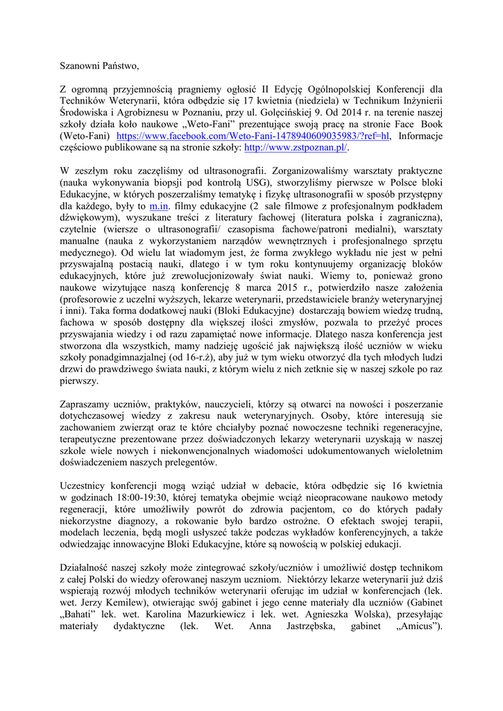 Szanowni Państwo, Z ogromną przyjemnością pragniemy ogłosić II Edycję Ogólnopolskiej Konferencji dla Techników Weterynarii, która odbędzie się 17 kwietnia (niedziela) w Technikum Inżynierii Środowiska i Agrobiznesu w Poznaniu, przy ul. Golęcińskiej 9. Od 2014 r. na terenie naszej szkoły działa koło naukowe „Weto-Fani” prezentujące swoją pracę na stronie Face Book (Weto-Fani) https://www.facebook.com/Weto-Fani-1478940609035983/?ref=hl, Informacje częściowo publikowane są na stronie szkoły: http://www.zstpoznan.pl/. W zeszłym roku zaczęliśmy od ultrasonografii. Zorganizowaliśmy warsztaty praktyczne (nauka wykonywania biopsji pod kontrolą USG), stworzyliśmy pierwsze w Polsce bloki Edukacyjne, w których poszerzaliśmy tematykę i fizykę ultrasonografii w sposób przystępny dla każdego, były to m.in. filmy edukacyjne (2 sale filmowe z profesjonalnym podkładem dźwiękowym), wyszukane treści z literatury fachowej (literatura polska i zagraniczna), czytelnie (wiersze o ultrasonografii/ czasopisma fachowe/patroni medialni), warsztaty manualne (nauka z wykorzystaniem narządów wewnętrznych i profesjonalnego sprzętu medycznego). Od wielu lat wiadomym jest, że forma zwykłego wykładu nie jest w pełni przyswajalną postacią nauki, dlatego i w tym roku kontynuujemy organizację bloków edukacyjnych, które już zrewolucjonizowały świat nauki. Wiemy to, ponieważ grono naukowe wizytujące naszą konferencję 8 marca 2015 r., potwierdziło nasze założenia (profesorowie z uczelni wyższych, lekarze weterynarii, przedstawiciele branży weterynaryjnej i inni). Taka forma dodatkowej nauki (Bloki Edukacyjne) dostarczają bowiem wiedzę trudną, fachowa w sposób dostępny dla większej ilości zmysłów, pozwala to przeżyć proces przyswajania wiedzy i od razu zapamiętać nowe informacje. Dlatego nasza konferencja jest stworzona dla wszystkich, mamy nadzieję ugościć jak największą ilość uczniów w wieku szkoły ponadgimnazjalnej (od 16-r.ż), aby już w tym wieku otworzyć dla tych młodych ludzi drzwi do prawdziwego świata nauki, z którym wielu z nich zetknie się w naszej szkole po raz pierwszy. Zapraszamy uczniów, praktyków, nauczycieli, którzy są otwarci na nowości i poszerzanie dotychczasowej wiedzy z zakresu nauk weterynaryjnych. Osoby, które interesują sie zachowaniem zwierząt oraz te które chciałyby poznać nowoczesne techniki regeneracyjne, terapeutyczne prezentowane przez doświadczonych lekarzy weterynarii uzyskają w naszej szkole wiele nowych i niekonwencjonalnych wiadomości udokumentowanych wieloletnim doświadczeniem naszych prelegentów. Uczestnicy konferencji mogą wziąć udział w debacie, która odbędzie się 16 kwietnia w godzinach 18:00-19:30, której tematyka obejmie wciąż nieopracowane naukowo metody regeneracji, które umożliwiły powrót do zdrowia pacjentom, co do których padały niekorzystne diagnozy, a rokowanie było bardzo ostrożne. O efektach swojej terapii, modelach leczenia, będą mogli usłyszeć także podczas wykładów konferencyjnych, a także odwiedzając innowacyjne Bloki Edukacyjne, które są nowością w polskiej edukacji. Działalność naszej szkoły może zintegrować szkoły/uczniów i umożliwić dostęp technikom z całej Polski do wiedzy oferowanej naszym uczniom. Niektórzy lekarze weterynarii już dziś wspierają rozwój młodych techników weterynarii oferując im udział w konferencjach (lek. wet. Jerzy Kemilew), otwierając swój gabinet i jego cenne materiały dla uczniów (Gabinet „Bahati” lek. wet. Karolina Mazurkiewicz i lek. wet. Agnieszka Wolska), przesyłając materiały dydaktyczne (lek. Wet. Anna Jastrzębska, gabinet „Amicus”). W tym roku tematyką konferencji będzie szereg istotnych kwestii w dobie wciąż rozwijającej się terapii zwierząt, która wymaga ścisłej współpracy lekarza weterynarii, technika weterynarii, behawiorysty i zoofizjoterapeuty. Na terenie naszej szkoły znajdują się zwierzęta gospodarskie, do naszych pracowni prawie codziennie uczęszczają zwierzęta na zajęcia praktyczne. Uczymy się pod okiem specjalistów i rozwijamy swoje pasje i zainteresowania. Temat tegorocznej konferencji: " Behawioryzm, terapie regeneracyjne komplementarne psów, kotów i koni z elementami ultrasonografii ". Oraz zorganizowanie Bloków Edukacyjnych, to kolejne wyzwanie dla potrzeb i wyobraźni Weto-Fanów Naszych prelegentów pragniemy ugościć w hotelach, aby mogli dzień wcześniej wziąć udział w debacie naukowej, o tematyce nowoczesnych metod regeneracyjnych ( w tym mniej konwencjonalnych), chcielibyśmy, aby lekarze, który od lat mają doświadczenie i pozytywne wyniki nietuzinkowych metod medycznych, podzielili się swoją wiedzą z szerszym gronem odbiorców, dlatego cena konferencji dla ucznia technikum, mimo to jest bardzo atrakcyjna i warto skorzystać z takiej oferty. Liczniejsze grupy 5 i 10 osobowe mogą liczyć na rabat dla opiekuna (1/2 wartości wstępu lub bezpłatny wstęp) lub zniżkę. W tym wypadku prosimy o kontakt pod adresem [email protected] Serdecznie zapraszamy do Poznania!