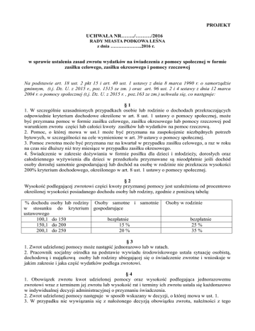 PROJEKT UCHWAŁA NR……../………/2016 RADY MIASTA PODKOWA LEŚNA z dnia ………………..2016 r. w sprawie ustalenia zasad zwrotu wydatków na świadczenia z pomocy społecznej w formie zasiłku celowego, zasiłku okresowego i pomocy rzeczowej Na podstawie art. 18 ust. 2 pkt 15 i art. 40 ust. 1 ustawy z dnia 8 marca 1990 r. o samorządzie gminnym, (t.j. Dz. U. z 2015 r., poz. 1515 ze zm. ) oraz art. 96 ust. 2 i 4 ustawy z dnia 12 marca 2004 r. o pomocy społecznej (t.j. Dz. U. z 2015 r. , poz.163 ze zm.) uchwala się, co następuje: §1 1. W szczególnie uzasadnionych przypadkach osobie lub rodzinie o dochodach przekraczających odpowiednie kryterium dochodowe określone w art. 8 ust. 1 ustawy o pomocy społecznej, może być przyznana pomoc w formie zasiłku celowego, zasiłku okresowego lub pomocy rzeczowej pod warunkiem zwrotu części lub całości kwoty zasiłków lub wydatków na pomoc rzeczową. 2. Pomoc, o której mowa w ust.1 może być przyznana na zaspokojenie niezbędnych potrzeb bytowych, w szczególności na cele wymienione w art. 39 ustawy o pomocy społecznej. 3. Pomoc zwrotna może być przyznana raz na kwartał w przypadku zasiłku celowego, a raz w roku na czas nie dłuższy niż trzy miesiące w przypadku zasiłku okresowego. 4. Świadczenie w zakresie dożywiania w formie posiłku dla dzieci i młodzieży, dorosłych oraz całodziennego wyżywienia dla dzieci w przedszkolu przyznawane są nieodpłatnie jeśli dochód osoby dorosłej samotnie gospodarującej lub dochód na osobę w rodzinie nie przekracza wysokości 200% kryterium dochodowego, określonego w art. 8 ust. 1 ustawy o pomocy społecznej. §2 Wysokość podlegającej zwrotowi części kwoty przyznanej pomocy jest uzależniona od procentowo określonej wysokości posiadanego dochodu osoby lub rodziny, zgodnie z poniższą tabelą: % dochodu osoby lub rodziny Osoby samotne i samotnie w stosunku do kryterium gospodarujące ustawowego 100,1 do 150 bezpłatnie 150,1 do 200 15 % 200,1 do 250 20 % Osoby w rodzinie bezpłatnie 25 % 35 % §3 1. Zwrot udzielonej pomocy może nastąpić jednorazowo lub w ratach. 2. Pracownik socjalny ośrodka na podstawie wywiadu środowiskowego ustala sytuację osobistą, dochodową i majątkową osoby lub rodziny ubiegającej się o świadczenie zwrotne i wnioskuje w jakim zakresie i jaka część wydatków podlega zwrotowi. §4 1. Obowiązek zwrotu kwot udzielonej pomocy oraz wysokość podlegająca jednorazowemu zwrotowi wraz z terminem jej zwrotu lub wysokość rat i terminy ich zwrotu ustala się każdorazowo w indywidualnej decyzji administracyjnej o przyznaniu świadczenia. 2. Zwrot udzielonej pomocy następuje w sposób wskazany w decyzji, o której mowa w ust. 1. 3. W przypadku nie wywiązania się z nałożonego decyzją obowiązku zwrotu, należności z tego tytułu podlegają ściągnięciu w trybie przepisów o postępowaniu egzekucyjnym w administracji. §5 W przypadkach szczególnych, zwłaszcza jeżeli żądanie zwrotu wydatków na udzielone świadczenie w całości lub w części stanowiłoby dla osoby zobowiązanej nadmierne obciążenie lub niweczyłoby skutki udzielonej pomocy, kierownik ośrodka, na wniosek pracownika socjalnego lub zainteresowanej osoby może odstąpić od żądania takiego zwrotu. §6 Możliwości i zakres udzielania pomocy podlegającej zwrotowi uzależnia się od środków finansowych przeznaczonych na ten cel w planie finansowym ośrodka. §7 Traci moc Uchwała Nr 190/XL/2014 Rady Miasta Podkowa Leśna z dnia 3 kwietnia 2014 r. w sprawie zasad zwrotu wydatków za świadczenia z pomocy społecznej będących w zakresie zadań własnych gminy. §8 Uchwała wchodzi w życie po upływie 14 dni od dnia ogłoszenia. Radca prawny /-/ Daniela Tomczak UZASADNIENIE do projektu uchwały w sprawie ustalenia zasad zwrotu wydatków na świadczenia z pomocy społecznej w formie zasiłku celowego, zasiłku okresowego i pomocy rzeczowej Ustawa o pomocy społecznej w art. 96 ust. 2 stanowi, że wydatki na usługi, pomoc rzeczową, zasiłki na ekonomiczne usamodzielnienie, zasiłki okresowe i zasiłki celowe przyznane pod warunkiem zwrotu podlegają zwrotowi w części lub całości, jeżeli dochód na osobę w rodzinie osoby zobowiązanej do zwrotu wydatków przekracza kwotę kryterium dochodowego oraz, że rada gminy określa, w drodze uchwały, zasady zwrotu wydatków za świadczenia z pomocy społecznej, o których mowa w ust. 2, będących w zakresie zadań własnych. Ośrodek proponuje nową uchwałę ponieważ zmiana poprzedniej byłaby mało czytelna z uwagi na ilość wnoszonych zmian. Od 1.10.2015 r. wzrosło ustawowe kryterium dochodowego do kwoty 634 zł dla osoby samotnie gospodarującej i do kwoty 514 zł dla osoby w rodzinie. Dla przejrzystości procentowego zwrotu udzielonej pomocy wprowadza się tabelę zwrotu w stosunku do osiąganego dochodu. Bezzwrotna pomoc jest przy dochodzie do 150 % kryterium ustawowego. Z całkowitego odstąpieniu od zwrotu przyznanego świadczenia mogą podlegać tylko posiłki obiadowe dla: dzieci w szkole, całodzienne wyżywienie dzieci w przedszkolu, posiłki obiadowe dla dorosłych jeśli dochód na osobę w rodzinie lub osobę samotnie gospodarującą nie przekracza 200% kryterium dochodowego określonego w ustawie o pomocy społecznej. Obecnie proponowane zróżnicowanie odpłatności udzielonej pomocy od dochodu powyżej 150 % kryterium nie ograniczy dostępności osób do tej formy pomocy, a nadto nie zwiększy wydatków Ośrodka przeznaczonych w budżecie na ten cel, ponieważ ta forma pomocy jest przyznawana sporadycznie. Kierownik Ośrodka Pomocy Społecznej w Podkowie Leśnej /-/ Ewa Zalewska