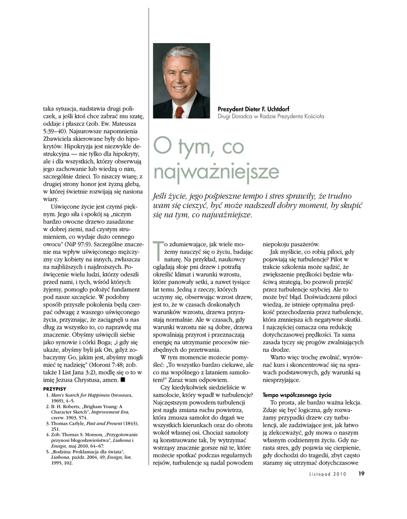 taka sytuacja, nadstawia drugi poli czek, a jeśli ktoś chce zabrać mu szatę, oddaje i płaszcz (zob. Ew. Mateusza 5:39–40). Najsurowsze napomnienia Zbawiciela skierowane były do hipo krytów. Hipokryzja jest niezwykle de strukcyjna — nie tylko dla hipokryty, ale i dla wszystkich, którzy obserwują jego zachowanie lub wiedzą o nim, szczególnie dzieci. To niszczy wiarę; z drugiej strony honor jest żyzną glebą, w której świetnie rozwijają się nasiona wiary. Uświęcone życie jest czymś pięk nym. Jego siła i spokój są „niczym bardzo owocne drzewo zasadzone w dobrej ziemi, nad czystym stru mieniem, co wydaje dużo cennego owocu” (NiP 97:9). Szczególne znacze nie ma wpływ uświęconego mężczy zny czy kobiety na innych, zwłaszcza na najbliższych i najdroższych. Po święcenie wielu ludzi, którzy odeszli przed nami, i tych, wśród których żyjemy, pomogło położyć fundament pod nasze szczęście. W podobny sposób przyszłe pokolenia będą czer pać odwagę z waszego uświęconego życia, przyznając, że zaciągnęli u nas dług za wszystko to, co naprawdę ma znaczenie. Obyśmy uświęcili siebie jako synowie i córki Boga; „i gdy się ukaże, abyśmy byli jak On, gdyż zo baczymy Go, jakim jest, abyśmy mogli mieć tę nadzieję” (Moroni 7:48; zob. także I List Jana 3:2), modlę się o to w imię Jezusa Chrystusa, amen. ◼ Przypisy 1. Man’s Search for Happiness (broszura, 1969), 4–5. 2. B. H. Roberts, „Brigham Young: A Character Sketch”, Improvement Era, czerw. 1903, 574. 3. Thomas Carlyle, Past and Present (1843), 251. 4. Zob. Thomas S. Monson, „Przygotowanie przynosi błogosławieństwa”, Liahona i Ensign, maj 2010, 64–67. 5. „Rodzina: Proklamacja dla świata”, Liahona, paźdz. 2004, 49; E nsign, list. 1995, 102. Prezydent Dieter F. Uchtdorf Drugi Doradca w Radzie Prezydenta Kościoła O tym, co najważniejsze Jeśli życie, jego pośpieszne tempo i stres sprawiły, że trudno wam się cieszyć, być może nadszedł dobry moment, by skupić się na tym, co najważniejsze. T o zdumiewające, jak wiele mo żemy nauczyć się o życiu, badając naturę. Na przykład, naukowcy oglądają słoje pni drzew i potrafią określić klimat i warunki wzrostu, które panowały setki, a nawet tysiące lat temu. Jedną z rzeczy, których uczymy się, obserwując wzrost drzew, jest to, że w czasach doskonałych warunków wzrostu, drzewa przyra stają normalnie. Ale w czasach, gdy warunki wzrostu nie są dobre, drzewa spowalniają przyrost i przeznaczają energię na utrzymanie procesów nie zbędnych do przetrwania. W tym momencie możecie pomy śleć: „To wszystko bardzo ciekawe, ale co ma wspólnego z lataniem samolo tem?” Zaraz wam odpowiem. Czy kiedykolwiek siedzieliście w samolocie, który wpadł w turbulencje? Najczęstszym powodem turbulencji jest nagła zmiana ruchu powietrza, która zmusza samolot do drgań we wszystkich kierunkach oraz do obrotu wokół własnej osi. Chociaż samoloty są konstruowane tak, by wytrzymać wstrząsy znacznie gorsze niż te, które możecie spotkać podczas regularnych rejsów, turbulencje są nadal powodem niepokoju pasażerów. Jak myślicie, co robią piloci, gdy pojawiają się turbulencje? Pilot w trakcie szkolenia może sądzić, że zwiększenie prędkości będzie wła ściwą strategią, bo pozwoli przejść przez turbulencje szybciej. Ale to może być błąd. Doświadczeni piloci wiedzą, że istnieje optymalna pręd kość przechodzenia przez turbulencje, która zmniejsza ich negatywne skutki. I najczęściej oznacza ona redukcję dotychczasowej prędkości. Ta sama zasada tyczy się progów zwalniających na drodze. Warto więc trochę zwolnić, wyrów nać kurs i skoncentrować się na spra wach podstawowych, gdy warunki są niesprzyjające. Tempo współczesnego życia To prosta, ale bardzo ważna lekcja. Zdaje się być logiczna, gdy rozwa żamy przypadki drzew czy turbu lencji, ale zadziwiające jest, jak łatwo ją zlekceważyć, gdy mowa o naszym własnym codziennym życiu. Gdy na rasta stres, gdy pojawia się cierpienie, gdy dochodzi do tragedii, zbyt często staramy się utrzymać dotychczasowe Listopad 2010 19 tempo życia lub nawet je przyspieszyć, bo sądzimy, że im bardziej przyspie szymy, tym lepiej na tym wyjdziemy. Jedną z cech naszego współczes nego życia jest to, że poruszamy się w rosnącym tempie, nie zważając na zawirowania czy przeszkody. Bądźmy uczciwi: raczej łatwo jest być zajętym. Wszyscy możemy wy myślić listę rzeczy, które dociążą nasz grafik. Niektórzy mogą nawet sądzić, że ich wartość zależy od długości listy zadań. Wolne miejsca w swoim grafiku zapełnią spotkaniami i błahostkami — nawet w okresie stresu i zmęczenia. Z powodu niepotrzebnego kompliko wania swego życia, ci ludzie borykają się często z rosnącą frustracją, brakiem radości i zbyt małym poczuciem sensu w życiu. Mówi się, że każda cnota w postaci ekstremalnej może stać się przywarą. Przeciążenie rozkładu dnia jest tego przykładem. Przychodzi moment, gdy „kamienie milowe” zamieniają się w „kamienie młyńskie” u szyi, a ambicje stają się ciężarem na barkach. Jakie jest rozwiązanie? Mądrzy ludzie rozumieją i stosują lekcje „ukryte” w słojach drzew i powietrznych turbulencjach. Opierają się pokusie, by dać się wciągnąć w szalony wir codziennego życia. Oni ufają zasadzie, że „w życiu chodzi o coś więcej niż prędkość” 1. Mówiąc krótko, koncentrują się na tym, co najważniejsze. Starszy Dallin H. Oaks, w czasie jednej z poprzednich konferencji mó wił: „Musimy zrezygnować z pewnych dobrych rzeczy, by móc wybrać inne, które są lepsze lub najlepsze, bo roz wijają wiarę w Pana Jezusa Chrystusa i wzmacniają nasze rodziny” 2. Poszukiwanie tego, co najlepsze, nieuchronnie prowadzi nas do pod stawowych zasad ewangelii Jezusa 20 Liahona Chrystusa — prostych i pięknych prawd, objawi