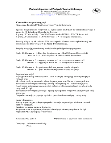Zachodniopomorski Związek Tenisa Stołowego Tel 0943402230, 0943451777, 605351540 Konto: 64 1020 2791 0000 7402 0084 4894 E-mail [email protected] 75-529 Koszalin ul. Piłsudskiego 90 Komunikat organizacyjny! Finałowego Turnieju IV Ligi Mężczyzn w Tenisie Stołowym. Zgodnie z regulaminem rozgrywek IV ligi na sezon 2008/2009 do turnieju finałowego o awans do III ligi zakwalifikowały się drużyny: Z grupy „W” wschodniej: Darz Bór Karnieszewice i KPPD - SSMTS Szczecinek. Z grupy „Z” Zachodniej: II LUKS Gryfice i II ATS Stargard Szczeciński. Zawody odbędą się 18 kwietnia 2009 roku o godz. 10.00 na nowo wybudowanej hali przy Szkole Podstawowej nr 4 ul. Jasna 2 w Szczecinku. Zespoły rozegrają jednodniowy turniej według niżej podanego programu. Godz. 10.00 mecz nr. 1- Darz Bór Karnieszewice – II ATS Stargard Szczeciński mecz nr. 2 –II LUKS Gryfice – KPPD- SSMTS Szczecinek Godz. 12.00 mecz nr.3 – wygrany z meczu nr.1 - z przegranym z meczu nr.2 mecz nr. 4 – wygrany z meczu nr.2 –z przegranym z meczu nr.1 Godz. 15.00 mecz nr. 5 – grają zespoły które jeszcze ze sobą nie grały mecz nr. 6 - grają zespoły które jeszcze ze sobą nie grały Regulamin turnieju! W przypadku meczy remisowych w I serii, w drugiej serii grają ze sobą drużyny z różnych grup. Mecz kończy się w momencie zdobycia przez jeden zespół 6 zwycięstw-punktów. Zawodników obowiązuje ranking klubowy sporządzony po I rundzie rozgrywek. Każdy mecz jest rozgrywany na dwóch stołach, według oryginalnych protokołów dla rozgrywek III ligi! Zawodników obowiązują licencje i zgodny z przepisami rozgrywek drużynowych strój sportowy. Gospodarz turnieju przygotuje zgodnie z przepisami warunki gry i cztery stoły. Sprawy finansowe. Koszty organizacyjne pokrywa gospodarz turnieju, zapewniając minimum czterech sędziów liczących. Sędziego głównego zapewni Związek . W sprawach nie uregulowanych wyżej obowiązują aktualny regulamin IV ligi, regulamin PZTS i przepisy sędziowskie. Koszalin 29.03.2008 r. Otrzymują: Zainteresowane kluby Prasa Opracowanie V-ce prezes Piotr Bochnacki Ranking klubowy po I rundzie IV ligi grupa wschodnia „W” (tylko za gry pojedyncze) Sezon 2008/2009 Ranking klubowy po I rundzie IV ligi grupa wschodnia „W” (tylko za gry pojedyncze) mce 1 2 Nazwy drużyny Darz Bór Karnieszewice KPPDSTMTS Szczecinek Wykaz zawodników 28.09. 2008 12.10. 2008 09.11. 2008. 07.12. 2008. Ilość gier Pkt. Świerszczek Andrzej Kuszlewicz Zbigniew Dziewiarski Roman Denaszewski Stanisław Wdowiak Michał Denaszewski Jan Krawczyk Andrzej Mysłowski Andrzej Krawczyk Marcin Radziński Mariusz Kwiatkowski Grzegorz Roszkowiak Andrzej Iżycki Jarosław Kaczała Grzegorz Roszkowiak Mateusz 3,-,3,-,3,0,2 2,2,-,3 3,3,3,3 2,0,2,2 3,3,3,3 -,-, -,2,2,3,3 3,3,2,2 -,-, -,2,2,2,0 3,0,3,3 -,-, -,-,-, -,-,-, -,-,-, -,2,2,2,0 -,-, -,2,2,2,2 0,0,0,0 3,3, 3,2,2, 2,0 0,0, -,3 -,-, 2,2 0,2,3,0 -,-,-,0,0,-,2,0,3,3 -,-,-,0,0, -,-,-3,0 -,-2,0 0,2,2,2 -,-,-,-,-,-, 3,3 0,-,3 2,2 2,2 -,3,0 -,-,2,2 -,-,0,3 2,2 -,- 11 8 11 12 10 4 12 8 4 8 2 6 6 6 4 33 11 23 30 15 6 19 20 10 12 3 8 9 12 0 2,2,0,3 3,3,3,3 3,3,2,2 2,2,2,2 miejsce w rankingu I V III II IV VI II I V IV VIII VII VI III Ranking klubowy po I rundzie IV ligi grupa zachodnia „Z” (tylko za gry pojedyncze) Nazwy drużyny I LUKS Nasiennik Gryfice II ATS Stargard Szczeciński Wykaz zawodników 28.09. 2008 12.10. 2008 09.11. 2008. 07.12 2008. Ilość gier Pkt Grabowski Stanisław Powroźnik Krzysztof Berski Karol Kapela Wojciech Major Wojciech Wegner Kinga 3,-,3,3, 3,-,3,-, 2,2,2,2, 2,2,2,2 -,3,-,0 -,3,-,- 3,3,0,3 3,-,3,0, 2,2,2,2, 2,0,2,-,0,-,0 -,-, -,- 3,3,3,3 3,3,3,3 2,2,2,-, 0,-,0,2 -,2, -,0 3,3,3,3 3,-,3,2,0,2,0 2,2,2,2 -,3,,-,0 15 11 15 14 6 1 42 30 26 22 8 3 miejsce w rankingu I II III IV V VI Pawłasek Michał Szczurowski Sylwester Wojtaś Jan Kłys Krzysztof Kłys Marcin Wacławczyk Henryk Kopczyński Piotr Zubel Agnieszka 3,3,3,3 3,3,3,3 0,-,-,2, 2,2,2,-,2,2,2 -,-,-,0,3,3,3 0,0,0,2, 0,0,3,3 0,2,2,0 -,-, -,3,3,3,3 -,-, -, 2,-,2,2 2,2,0,0, -,0,3,0,3,-,0 3,3,3,3 3,3,3,3 -,-, -,-,-, 2,2 2,2,0,2 -,-, -,-,-, -,2,2,-,- 8 16 6 12 15 2 3 2 24 45 4 22 18 3 3 4 II I V III IV VII VIII VI