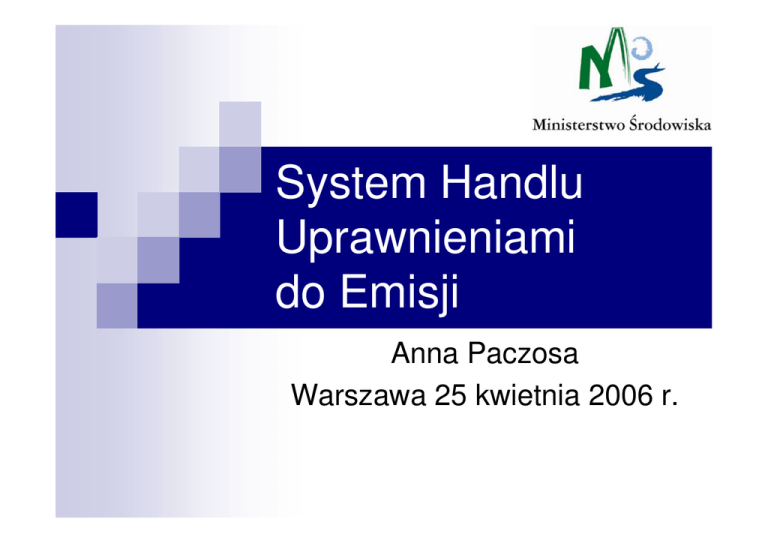 System Handlu Uprawnieniami do Emisji Anna Paczosa Warszawa 25 kwietnia 2006 r. Akty prawne Dz. U. Nr 281 poz. 2784 ustawa z dnia 22 grudnia 2004 r. o handlu uprawnieniami do emisji do powietrza gazów cieplarnianych i innych substancji. Rozporz dzenia Rozporz dzenie Ministra rodowiska z dnia 31.03.2006 r. w sprawie rodzajów instalacji obj tych wspólnotowym systemem handlu uprawnieniami do emisji Rozporz dzenie Ministra rodowiska z dnia 13.09.2005 r. w sprawie wyznaczenia Krajowego Administratora Systemu Handlu Uprawnieniami do Emisji Rozporz dzenie Ministra rodowiska z dnia 12.01.2006 r. w sprawie sposobu monitorowania wielko ci emisji substancji obj tych wspólnotowym systemem handlu uprawnieniami do emisji Rozporz dzenia Rozporz dzenie Ministra rodowiska z dnia 6 lutego 2006 r. w sprawie okre lenia wymaga dla audytorów uprawnionych do weryfikacji rocznych raportów Rozporz dzenie Ministra rodowiska z dnia 7 marca 2006 w sprawie informacji wymaganych do opracowania krajowego planu rozdziału uprawnie do emisji Rozporz dzenie Ministra rodowiska z dnia 10 kwietnia 2006 r. w sprawie warunków i sposobu ustalania kosztów weryfikacji rocznych raportów RRM z 27.12. 2005 r. w sprawie KPRU (Dz. U. Nr 264, poz. 2206) Rozporz dzenie Rady Ministrów z dnia 27 grudnia 2005 r. w sprawie Krajowego Planu Rozdziału Uprawnie do emisji dwutlenku w gla oraz wykazu instalacji wykluczonych z systemu w okresie od 1 stycznia 2005 do 31 grudnia 2007 r. System obejmuje 876 instalacji aktywnie uczestnicz cych w systemie oraz 212 instalacji czasowo wykluczonych w okresie 2005-2007. Wymagania dotycz ce rejestru Niniejsze rozporz dzenie wi e w cało ci i jest bezpo rednio stosowane we wszystkich Pa stwach Członkowskich Zezwolenia na uczestnictwo Trwa proces wydawania zezwole na uczestnictwo w systemie handlu uprawnieniami do emisji Dotychczas zostało wydanych ok. 500 zezwole Roczne Raporty Prowadz cy instalacj , któremu przyznano uprawnienia do emisji, jest obowi zany do monitorowania wielko ci emisji i rozliczania uprawnie . Zweryfikowany roczny raport powinien zosta przedło ony do 31 marca ka dego roku. Roczne Raporty Dotychczas wpłyn ło do Krajowego Administratora ok.120 zweryfikowanych rocznych raportów. Rejestr uprawnie Zakupiono oprogramowanie rejestru SERINGAS z Francji System został zainstalowany w dniach 1112 kwietnia br. Obecnie trwaj testy i czekamy na akredytacj systemu przez Komisj Europejsk w dniach 4-5 maja br. Krajowy Plan Rozdziału Uprawnie 2008-2012 Krajowy Administrator prowadzi prace zwi zane z przygotowaniem Krajowego Planu Rozdziału Uprawnie na lata 20082012 Do 30 czerwca 2006 r. dokument powinien zosta przekazany do notyfikacji Komisji Europejskiej