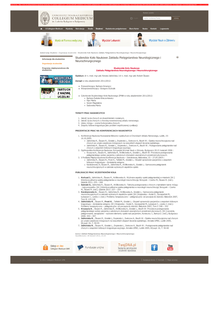Zrzut strony: http://www.cm.umk.pl/studenci/organizacje-studenckie/70-wydzialy/wydzial-nauk-o-zdrowiu/jednostki-wydzialowe-wnoz/katedra-pielegniarstwa-i-poloznictwa/zaklad-pielegniarstwa-neurologicznego-i-neurochirurgicznego/568-studenckie-kolo-naukowe-zakladu-pielegniarstwa-neurologicznego-i-neurochirurgicznego.html <--kliknij na adresie Rozmiar czcionki: Większy Normalny Mniejszy English O Collegium Medicum Wydziały Rekrutacja Studia Studenci Kształcenie podyplomowe Biuro Karier wpisz szukaną frazę Nauka Kontakt Logowanie Jesteś tutaj: Studenci - Organizacje studenckie - Studenckie Koło Naukow e Zakładu Pielęgniarstw a Neurologicznego i Neurochirurgicznego Informacje dla studentów Studenckie Koło Naukowe Zakładu Pielęgniarstwa Neurologicznego i Neurochirurgicznego Organizacje studenckie Studenckie Koło Naukowe Zakładu Pielęgniarstwa Neurologicznego i Neurochirurgicznego Programy międzynarodowe dla studentów Opiekun: dr n. med. mgr piel. Renata Jabłońska / dr n. med. mgr piel. Robert Ślusarz Zarząd w roku akademickim 2011/2012: Przewodnicząca: Barbara Smarszcz Wiceprzewodniczący: Grzegorz Dybciak Członkowie Studenckiego Koła Naukowego ZPNiN w roku akademickim 2011/2012: Barbara Świtała-Wieczorkiewicz Pijor Marta Szram Magdalena Sadowska Marta TEMATY PRAC BADAWCZYCH 1. 2. 3. 4. Jakość życia chorych ze stwardnieniem rozsianym. Jakość życia chorych z chorobą nowotworową układu nerwowego. Udary mózgu – ocena funkcjonalna chorych. Zespoły bólowe kręgosłupa jako problem współczesnej cywilizacji. PREZENTACJE PRAC NA KONFERENCJACH NAUKOWYCH 1. Konferencja Naukowa Rozważania Kliniczne i opiekuńcze w Chorobach Układu Nerwowego, Lublin, 1516.10.2005: Jabłońska R., Ślusarz R., Grzelak L, Dopierała L., Swincow A., Beuth W.: Opieka neurochirurgiczna nad chorym po urazie czaszkowo-mózgowym na wszystkich etapach leczenia szpitalnego. Jabłońska R., Ślusarz R., Grzelak L., Dopierała L., Swincow A., Beuth W.: Postępowanie pielęgniarskie nad chorym z zespołem bólowym kręgosłupa szyjnego. 2. Ogólnopolska Konferencja Naukowa: Europejski Wymiar Nauk o Zdrowiu, Bydgoszcz 20-21 kwiecień 2006 : Kruszyna K., Ślusarz R., Jabłońska R., Królikowska A., Grzelak L., Beuth W: Procedura postępowania pielęgniarskiego wobec pacjenta z założonym drenażem zewnętrznym przestrzeni płynowych. 3. V Podlaska Międzynarodowa Konferencja Naukowo – Szkoleniowa, Białowieża, 23 – 27.05.2007r.: Jabłońska R., Ślusarz R., Frost K., Tafelski M., Grzelak L.: Stopień sprawności pacjentów z zespołem bólowym kręgosłupa – doniesienia wstępne. Karabanowicz A, Ślusarz R., Jabłońska R., Królikowska A., Grzelak L.: Samoocena pielęgniarek neurochirurgicznych w zakresie wybranych aspektów opieki. PUBLIKACJE PRAC UCZESTNIKÓW KOŁA 1. Kończal J., Jabłońska R., Ślusarz R., Królikowska A.: Wybrane aspekty opieki pielęgniarskiej w miastenii. [W:] Interdyscyplinarna opieka pielęgniarska w neurologii i neurochirurgii, Skrzypek – Czerko M., Ślusarz R. (red.). Gdańsk 2011: 255 – 268 2. Dybciak G., Jabłońska R., Ślusarz R., Królikowska A.: Taktyka postępowania z chorym z tętniakiem tętnic mózgu - opis przypadku. [W:] Interdyscyplinarna opieka pielęgniarska w neurologii i neurochirurgii, Skrzypek – Czerko M., Ślusarz R. (red.). Gdańsk 2011: 237 – 254 3. Karabanowicz A. , Ślusarz R., Jabłońska R., Królikowska A., Grzelak L.: Samoocena pielęgniarek neurochirurgicznych w zakresie wybranych aspektów opieki. [W:] Krajewska – Kułak E., Szczepański M., Łukaszuk C., Lewko J. (red.): Problemy terapeutyczno – pielęgnacyjne: od poczęcia do starości. Białystok 2007, Tom II: 123-128 4. Jabłońska R. , Ślusarz R., Frost K. , Tafelski M., Grzelak L.: Stopień sprawności pacjentów z zespołem bólowym kręgosłupa – doniesienia wstępne. [W:] Krajewska – Kułak E., Szczepański M., Łukaszuk C., Lewko J. (red.): Problemy terapeutyczno – pielęgnacyjne: od poczęcia do starości. Białystok 2007, Tom I: 348 – 353 5. Kruszyna K. , Ślusarz R., Jabłońska R., Królikowska A., Grzelak L., Beuth W: Procedura postępowania pielęgniarskiego wobec pacjenta z założonym drenażem zewnętrznym przestrzeni płynowych. [W:] Leczenie, pielęgnowanie, zarządzanie – wybrane elementy opieki nad pacjentem, Konieczny J., Bartuzi Z. (red.), Bydgoszcz 2006: 443 – 447 6. Jabłońska R. , Ślusarz R., Grzelak L, Dopierała L., Swincow A., Beuth W.: Opieka neurochirurgiczna nad chorym po urazie czaszkowo-mózgowym na wszystkich etapach leczenia szpitalnego. Annales UMSC, Lublin 2005, 60,supl. 16, 7: 50-55 7. Jabłońska R. , Ślusarz R., Grzelak L., Dopierała L., Swincow A., Beuth W.: Postępowanie pielęgniarskie nad chorym z zespołem bólowym kręgosłupa szyjnego. Annales UMSC, Lublin 2005, 60,supl. 16, 7: 56-60 Autor: Zakład Pielęgniarstwa Neurologicznego i Neurochirurgicznego Opublikow ano: 28 styczeń 2012, 21:25 © 2011 Collegium Medicum UMK Redakcja strony Kontakt Mapa serw isu