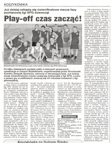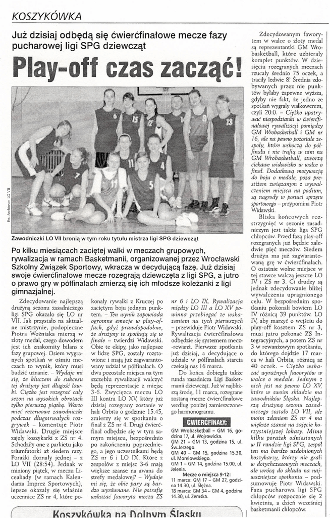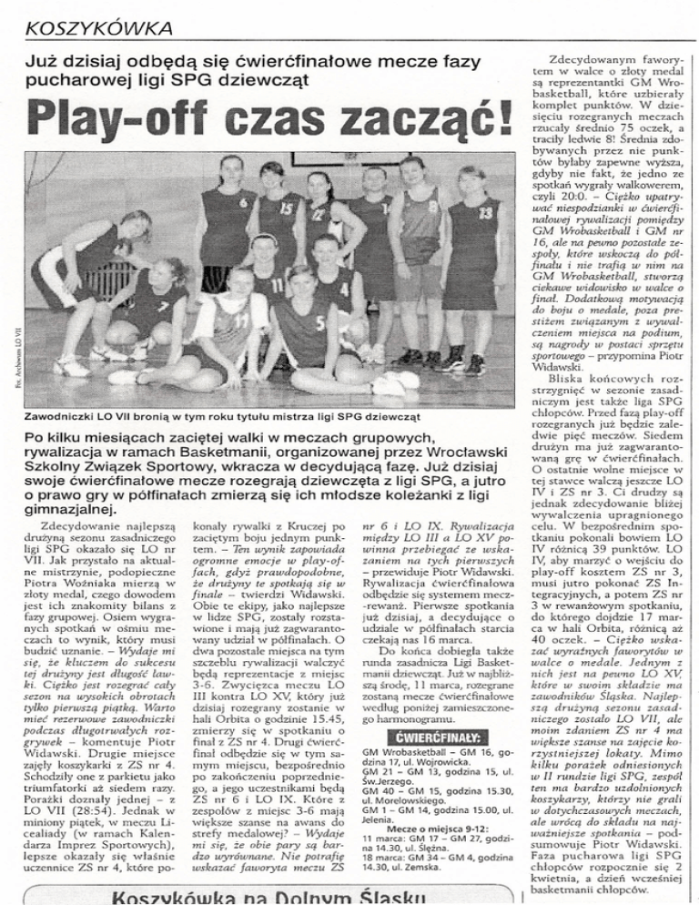 KOSZYKÓWKA Już dzisiaj odbędą się ćwierćfinałowe mecze fazy pucharowej ligi SPG dziewcząt Play-off czas zacząć! Zawodniczki LO VII bronią w tym roku tytułu mistrza ligi SPG dziewcząt Po kilku miesiącach zaciętej walki w meczach grupowych, rywalizacja w ramach Basketmanii, organizowanej przez Wrocławski Szkolny Związek Sportowy, wkracza w decydującą fazę, Już dzisiaj swoje ćwierćfinałowe mecze rozegrają dziewczęta z ligi SPG, a jutro o prawo gry w półfinałach zmierzą się ich młodsze koleżanki z ligi gimnazjalnej, Zdecydowanie najlepszą drużyną sezonu zasadniczego ligi SPG okazało się LO nr VII. Jak przystało na aktualne mistrzyniej podopieczne Protra Woźniaka mierzą w złoty medal, czego dowodem jest ich znakomity bilans z fazy grupowej. Osiem wygranych spotkań w ośmiu meczach to wynik, który musi budzić uznanie. - Wydaje mi się, że kluczem do sukcesu tej dnlżyny jest długość lawki. Ciężko jest rozegrać cały sezon na wysokich obrotach tylko pierwszą piątką. Warto mieć rezerwowe zawodniczki podczas długotrwałych rozgrywek - komentuje Pictr Widawski. Drugie miejsce zajęły koszykarki z ZS nr 4. Schodziły one z parkietu jako triumfatorki aż siedem razy. Porażki doznały jednej - z LO VII (28:54). Jednak w miniony piątek, w meczu Licealiady (w ramach Kalendarza Imprez Sportowych), lepsze okazały się właśnie uczennice ZS nr 4, które po- ( konały rywalki z Kruczej po zaciętym boju jednym punktem. - Ten wynik zapowiada ogromne emocje w play-ojfach, gdyż prawdopodobne, że drużyny te spotkajq się w finale - twierdzi Widawski. Obie te ekipy, jako najlepsze w lidze SPG, zostały rozstawiane i mają już zagwarantowany udział w półfinałach. O dwa pozostałe miejsca na tym szczeblu rywalizacji walczyć będą reprezentacje z miejsc 3-6. Zwycięzca meczu LO 1II kontra LO który już dzisiaj rozegrany zostanie w hali Orbita o godzinie l5.45, zmierzy się w spotkaniu o finał z ZS nr 4. Drugi ćwierćfinał odbędzie się w tym samym miejscu, bezpośrednio po zakończeniu poprzedniego, a jego uczestnikami będą ZS nr 6 i LO łX. Które z zespołów z miejsc 3-6 mają większe szanse na awans do strefy medalowej? - Wydaje mi się, że obie pary sq bardzo wyrównane. Nie potrafię wskazać faworyta meczu ZS xv. 6 i LO IX. Rywalnacja między LO ITI a LO XV powinna przebiegać ze wskazaniem na tych pierwszych - przewiduje Piotr Widawski. Rywalizacja ćwierćfinałowa odbędzie się systemem mecz-rewanż. Pierwsze spotkania już dzisiaj. a decydujące o udziale w półfinałach starcia czekają nas 16 marca. Do końca dobiegła także runda zasadnicza ligi Basketmanii dziewcząt. Już w najbliższą środę, II marca, rozegrane zostaną mecze ćwierćfinałowe według poniżej zamieszczonego harmonogramu. tir fjl l,15it3iiit!1!"1 l GM Wrobasketball- GM 16, godzina 17, ul. Wojrowicka. GM 21 - GM B, godzina 15, ul. Św.Jerzego. GM 40 - GM 15, godzina 15.30, ul. Morelowskiego. GM 1 - GM 14, godzina 15.00, ul. Jelenia. Mecze o miejsca 9-12: 11 marca: GM 17 - GM 27, godzina 14.30, ul. Ślężna. 18 marca: GM 34 - GM 4, godzina 14.30, ul. Zemska. Kn~7Vkńwk::l n::l I)nlnvm ~r::ldm Zdecydowanym faworytem \II walce o złoty medal są reprezentantki G M Wrobasketball, które uzbierały komplet punktów. W dziesięciu rozegranych meczach rzucały średnio 75 oczek, a traciły ledwie 8' Średnia zdobywanych przez nie punktów byłaby zapewne wyższa gdyby nie fakt, że jedno ze spotkań wygrały walkowerem, czyli 20:0. - Ciężko upatrywać niespodzianki w ćwierćfinałowej rywalizacji pomiędzy GM Wrobasketball i GM nr ] 6, ale na pewno pozostałe zespoły, które uiskoczq do pólfinału i nie trafią w ,Iim na GM Wrobasketball, stworzą ciekawe widowisko w walce o finał. Dodatkową motywacją do boju o medale, poza prestiżem związanym z wywalczeniem miejsca na podium, sq nagrody w postaci sprzętu sportowego - przypomina Piotr Widawski. Bliska końcowych rozstrzygnięć w sezonie zasadniczym jest także liga SPG chłopców. Przed fazą play-off rozegranych już będzie zaledwie pięć meczów. Siedem drużyn ma już zagwarantowaną grę w ćwierćfinałach. O ostatnie wolne miejsce w tej stawce walczą jeszcze LO IV i ZS nr 3. Ci drudzy są jednak zdecydowanie bliżej wywalczenia upragnionego celu. W bezpośrednim spotkaniu pokonał i bowiem LO IV różnicą 39 punktów. LO IV, aby marzyć O wejściu do play-off kosztem ZS nr 3, musi jutro pokonać ZS Integracyjnych, a potem ZS nr 3 w rewanżowym spotkaniu, do którego dojdzie 17 marca w hali Orbita, różnicą aż 40 oczek. - Ciężko wskazać wyraźnych faworytów tV walce o medale. Jednym z nich jest na pewno LO Xv, które w swoim składzie ma zawodników Śląska. Najlepszą drużyną sezonu zasadniczego zostało LO Vll, ale moim zdaniem ZS nr 4 ma UJiększeszanse na zajęcie korzystniejszej lokaty. Mimo kilku porażek odniesionych w II rundzie ligi SPG, zespół ten ma bardzo uzdolnionych koszykarzy, którzy nie grali UJ dotychczasowych meczach, ale wrócq do składu na najważniejsze spotkania - podsumowuje Piotr Widawski. Faza pucharowa łigi SPG chłopców rozpocznie się 2 kwietnia, a dzień wcześniej basketmanii chłopców.