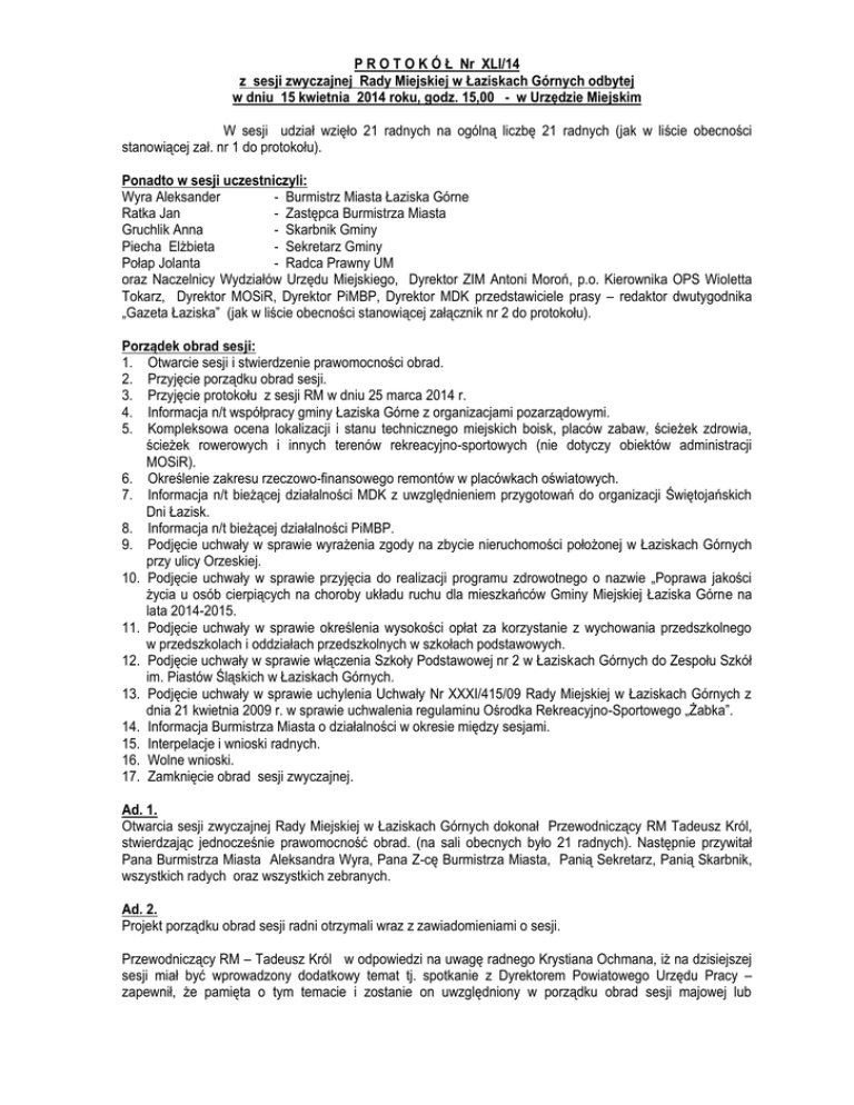 P R O T O K Ó Ł Nr XLI/14 z sesji zwyczajnej Rady Miejskiej w Łaziskach Górnych odbytej w dniu 15 kwietnia 2014 roku, godz. 15,00 - w Urzędzie Miejskim W sesji udział wzięło 21 radnych na ogólną liczbę 21 radnych (jak w liście obecności stanowiącej zał. nr 1 do protokołu). Ponadto w sesji uczestniczyli: Wyra Aleksander - Burmistrz Miasta Łaziska Górne Ratka Jan - Zastępca Burmistrza Miasta Gruchlik Anna - Skarbnik Gminy Piecha Elżbieta - Sekretarz Gminy Połap Jolanta - Radca Prawny UM oraz Naczelnicy Wydziałów Urzędu Miejskiego, Dyrektor ZIM Antoni Moroń, p.o. Kierownika OPS Wioletta Tokarz, Dyrektor MOSiR, Dyrektor PiMBP, Dyrektor MDK przedstawiciele prasy – redaktor dwutygodnika „Gazeta Łaziska” (jak w liście obecności stanowiącej załącznik nr 2 do protokołu). Porządek obrad sesji: 1. Otwarcie sesji i stwierdzenie prawomocności obrad. 2. Przyjęcie porządku obrad sesji. 3. Przyjęcie protokołu z sesji RM w dniu 25 marca 2014 r. 4. Informacja n/t współpracy gminy Łaziska Górne z organizacjami pozarządowymi. 5. Kompleksowa ocena lokalizacji i stanu technicznego miejskich boisk, placów zabaw, ścieżek zdrowia, ścieżek rowerowych i innych terenów rekreacyjno-sportowych (nie dotyczy obiektów administracji MOSiR). 6. Określenie zakresu rzeczowo-finansowego remontów w placówkach oświatowych. 7. Informacja n/t bieżącej działalności MDK z uwzględnieniem przygotowań do organizacji Świętojańskich Dni Łazisk. 8. Informacja n/t bieżącej działalności PiMBP. 9. Podjęcie uchwały w sprawie wyrażenia zgody na zbycie nieruchomości położonej w Łaziskach Górnych przy ulicy Orzeskiej. 10. Podjęcie uchwały w sprawie przyjęcia do realizacji programu zdrowotnego o nazwie „Poprawa jakości życia u osób cierpiących na choroby układu ruchu dla mieszkańców Gminy Miejskiej Łaziska Górne na lata 2014-2015. 11. Podjęcie uchwały w sprawie określenia wysokości opłat za korzystanie z wychowania przedszkolnego w przedszkolach i oddziałach przedszkolnych w szkołach podstawowych. 12. Podjęcie uchwały w sprawie włączenia Szkoły Podstawowej nr 2 w Łaziskach Górnych do Zespołu Szkół im. Piastów Śląskich w Łaziskach Górnych. 13. Podjęcie uchwały w sprawie uchylenia Uchwały Nr XXXI/415/09 Rady Miejskiej w Łaziskach Górnych z dnia 21 kwietnia 2009 r. w sprawie uchwalenia regulaminu Ośrodka Rekreacyjno-Sportowego „Żabka”. 14. Informacja Burmistrza Miasta o działalności w okresie między sesjami. 15. Interpelacje i wnioski radnych. 16. Wolne wnioski. 17. Zamknięcie obrad sesji zwyczajnej. Ad. 1. Otwarcia sesji zwyczajnej Rady Miejskiej w Łaziskach Górnych dokonał Przewodniczący RM Tadeusz Król, stwierdzając jednocześnie prawomocność obrad. (na sali obecnych było 21 radnych). Następnie przywitał Pana Burmistrza Miasta Aleksandra Wyra, Pana Z-cę Burmistrza Miasta, Panią Sekretarz, Panią Skarbnik, wszystkich radych oraz wszystkich zebranych. Ad. 2. Projekt porządku obrad sesji radni otrzymali wraz z zawiadomieniami o sesji. Przewodniczący RM – Tadeusz Król w odpowiedzi na uwagę radnego Krystiana Ochmana, iż na dzisiejszej sesji miał być wprowadzony dodatkowy temat tj. spotkanie z Dyrektorem Powiatowego Urzędu Pracy – zapewnił, że pamięta o tym temacie i zostanie on uwzględniony w porządku obrad sesji majowej lub czerwcowej. Następnie w związku z brakiem uwag i pytań poddał pod głosowanie wniosek kto jest za przyjęciem porządku obrad dzisiejszej sesji w wersji jak w materiałach. (na Sali obecnych było 21 radnych) Rada Miejska przy 21 głosach „za”, 0 głosach „przeciw” oraz 0 głosach „wstrzymujących się” przyjęła porządek obrad dzisiejszej sesji bez zmian. Ad. 3. Rada Miejska 19 głosami „za”, przy 0 głosach „przeciw” oraz 2 głosach „wstrzymujących się” przyjęła Protokół Nr XL/14 z dnia 25 marca 2014 r. (na sali obecnych było 21 radnych) Ad. 4. Opinie stałych Komisji do tematu „Informacja n/t współpracy gminy Łaziska Górne z organizacjami pozarządowymi przedstawili przewodniczący tych Komisji RM: - Radny Bogusław Żurek – Komisja Samorządu, Porządku i Bezpieczeństwa Publicznego przyjęła do wiadomości informacje; - Radna Jolanta Kornatowska – Komisja Pomocy Społecznej i Ochrony Zdrowia przyjęła do wiadomości powyższą informację; - Radna Małgorzata Szuła – Komisja Oświaty, Kultury i Sportu przyjęła do wiadomości informację; - Radny Mirosław Jarek – Komisja Ochrony Środowiska, Gospodarki Przestrzennej, Rozwoju i Restrukturyzacji wypracowanie opinii pozostawiła w gestii komisji branżowej; - Radny Łukasz Stencel - Komisja Budżetu i Finansów przyjęła do wiadomości informację. Uwag i pytań do tematu nie zgłoszono. Ad. 5. Opinie stałych Komisji do tematu „Kompleksowa ocena lokalizacji i stanu technicznego miejskich boisk, placów zabaw, ścieżek zdrowia, ścieżek rowerowych i innych terenów rekreacyjno-sportowych (nie dotyczy obiektów administracji MOSiR) przedstawili przewodniczący tych Komisji RM: - Radny Bogusław Żurek – Komisja Samorządu, Porządku i Bezpieczeństwa Publicznego wypracowanie opinii pozostawiła w gestii komisji branżowej; - Radna Jolanta Kornatowska – Komisja Pomocy Społecznej i Ochrony Zdrowia wypracowanie opinii pozostawiła w gestii branżowej Komisji; - Radna Małgorzata Szuła – Komisja Oświaty, Kultury i Sportu przyjęła do wiadomości informacje; - Radny Mirosław Jarek – Komisja Ochrony Środowiska, Gospodarki Przestrzennej, Rozwoju i Restrukturyzacji przyjęła informację do wiadomości; - Radny Łukasz Stencel - Komisja Budżetu i Finansów przyjęła informację do wiadomości. Burmistrz Miasta Łaziska Górne Aleksander Wyra zabierając głos poinformował, że zdaje sobie sprawę z faktu, że jest spore zainteresowanie budową i doposażeniem placów zabaw. W 70% jest wykonany plac zabaw na ul. Zwałowej, który będzie również og
