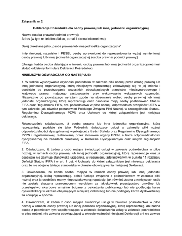 Załącznik nr 2 Deklaracja Pośrednika dla osoby prawnej lub innej jednostki organizacyjnej Nazwa (osoba prawna/podmiot prawny): Adres (w tym nr telefonu/faksu, e-mail i strona internetowa): Dalej określana jako „osoba prawna lub inna jednostka organizacyjna” Imię (imiona), nazwisko i PESEL osoby uprawnionej do reprezentowania wyżej wymienionej osoby prawnej lub innej jednostki organizacyjnej (osoba prawna/ podmiot prawny) (Uwaga: każda osoba działająca w imieniu osoby prawnej lub innej jednostki organizacyjnej musi złożyć oddzielny formularz Deklaracji Pośrednika): NINIEJSZYM OŚWIADCZAM CO NASTĘPUJE: 1. W trakcie wykonywania czynności pośrednika w zakresie piłki nożnej przez osobę prawną lub inną jednostkę organizacyjną, którą niniejszym reprezentuję zobowiązuję się w jej imieniu i osobiście do przestrzegania wszystkich obowiązujących przepisów międzynarodowego i krajowego prawa, mającego zastosowanie przy wykonywaniu wskazanych czynności. Niezależnie od powyższego wyrażam zgodę na stosowanie wobec osoby prawnej lub innej jednostki organizacyjnej, którą reprezentuję oraz osobiście mojej osoby postanowień Statutu FIFA oraz Regulaminu FIFA, dot. pośrednictwa w piłce nożnej, odpowiednich przepisów UEFA w tym zakresie, jak również postanowień Polskiego Związku Piłki Nożnej, w szczególności Statutu, Regulaminu Dyscyplinarnego PZPN oraz Uchwały do której załącznikiem jest niniejsza deklaracja. Równocześnie oświadczam, iż osoba prawna lub inna jednostka organizacyjna, którą reprezentuję, poddaje się jako Pośrednik świadczący usługi w zakresie piłki nożnej odpowiedzialności dyscyplinarnej wynikającej z treści Statutu oraz Regulaminu Dyscyplinarnego PZPN i regulaminowej, realizowanej przez stosowne organy PZPN, a także odpowiedzialności dyscyplinarnej na zasadach określonej w Kodeksie Dyscyplinarnym oraz innych regulacjach FIFA. 2. Oświadczam, iż żadna z osób mająca świadczyć usługi w zakresie pośrednictwa w piłce nożnej, w ramach osoby prawnej lub innej jednostki organizacyjnej, którą reprezentuję oraz ja osobiście nie zajmuję stanowiska urzędnika, w rozumieniu zdefiniowanym w punktu 11 rozdziału Definicji Statutu FIFA i w art. 1 ust. 4 Uchwały do której załącznikiem jest niniejsza deklaracja oraz że nie obejmę takiego stanowiska w okresie obowiązywania niniejszej Deklaracji. 3. Oświadczam, że każda osoba, mająca w ramach osoby prawnej lub innej jednostki organizacyjnej, którą reprezentuję, pełnić funkcje związane z pośrednictwem w zakresie piłki nożnej oraz ja osobiście mamy nieposzlakowaną reputację, jak również żadna z niniejszych osób nie została skazana prawomocnym wyrokiem za jakiekolwiek przestępstwo umyślne lub przestępstwo skarbowe umyślne ścigane z oskarżenia publicznego lub nie podlegają karze dyskwalifikacji w okresie obejmującym niniejszą deklarację lub nie podlegały karze dyskwalifikacji za korupcję w sporcie. 4. Oświadczam, iż żadna z osób mająca świadczyć usługi w zakresie pośrednictwa w piłce nożnej w ramach osoby prawnej lub innej jednostki organizacyjnej, którą reprezentuję, ani żadna osobą z podmiotem tym współpracująca w zakresie świadczenia usług w zakresie pośrednictwa w piłce nożnej, nie zawarła obowiązującej w okresie ważności niniejszej Deklaracji ani nie zawrze w tym okresie umowy cywilnoprawnej z Zawodnikiem zarejestrowanym w systemie Extranet PZPN lub jego przedstawicielami ustawowymi, innej niż Umowy pośrednictwa, o której mowa w Uchwale do której załącznikiem jest niniejsza deklaracja, na podstawie której będzie uprawniona do reprezentowania interesów takiego Zawodnika lub jego przedstawicieli ustawowych w odniesieniu do negocjowania i zawierania umów transferowych lub kontraktów w rozumieniu wskazanej powyżej Uchwały Zarządu PZPN. 5. Oświadczam, że ani osoba prawna lub inna jednostka organizacyjna, którą reprezentuję, ani żadna z osób, które w jej ramach będzie zajmować się pośrednictwem w zakresie piłki nożnej, ani ja osobiście nie mamy żadnych powiązań kontraktowych z FIFA, konfederacjami kontynentalnymi, narodowymi lub regionalnymi federacjami piłkarskim, względnie ligami zawodowymi, które mogłyby stwarzać potencjalny konflikt interesów. Równocześnie deklaruję, iż w przypadku powstania jakichkolwiek wątpliwości osoba prawna lub inna jednostka organizacyjna, którą reprezentuję, osoby w niej zatrudnione w zakresie pośrednictwa w sferze piłki nożnej oraz ja osobiście, ujawnimy niezwłocznie każdą umowę, łączącą nas z ww. podmiotami. Równocześnie oświadczam, iż osoba prawna lub inna jednostka organizacyjna, którą reprezentuję, osoby w niej zatrudnione w sferze pośrednictwa w piłce nożnej oraz ja osobiście nie będziemy dążyli do nawiązania jakichkolwiek relacji kontraktowych z FIFA, konfederacjami kontynentalnymi, narodowymi lub regionalnymi federacjami piłkarskim, względnie ligami zawodowymi. 6. Oświadczam, iż zgodnie z treścią artykułu 7 § 4 Regulaminu FIFA dot. pracy z Pośrednikami, że ani osoba prawna lub inna jednostka organizacyjna, którą reprezentuję, ani żadna z osób, które świadczy w jej ramach usługi pośrednictwa, ani też ja osobiście nie będziemy przyjmować żadnych płatności uiszczanych przez jeden Klub na rzecz drugiego Klubu w związku ze zmianą przynależności klubowej Zawodnika, w szczególności jakichkolwiek sum transferowych, Ekwiwalentu z tytułu wkładu solidarnościowego oraz jakichkolwiek rekompensat za wyszkolenie Zawodnika. 7. Oświadczam, iż zgodnie z artykułem 7 § 9 Regulaminu FIFA dot. pracy z Pośrednikiem, ani osoba prawna lub inna jednostka organizacyjna, którą reprezentuję, ani żadna z osób zajmująca się w niej pośrednictwem w piłce nożnej, ani ja osobiście, nie będziemy przyjmowali żadnych płatności od którejkolwiek ze stron, jeżeli zmiana przynal