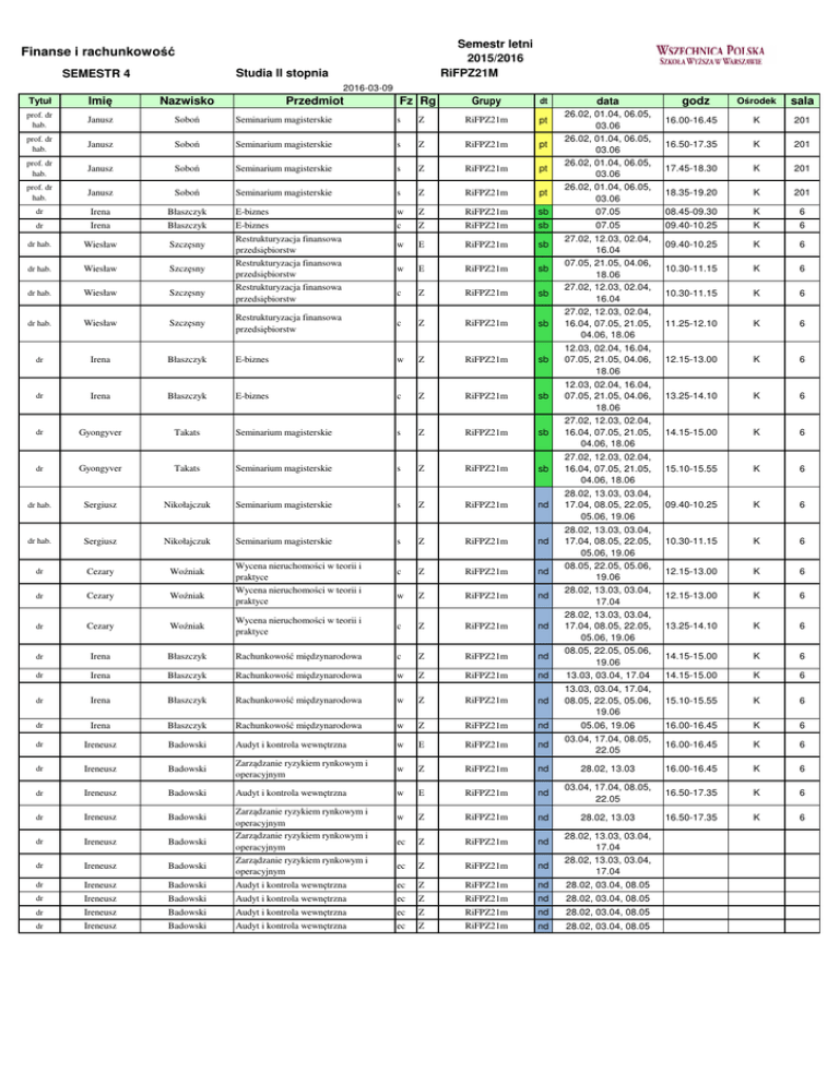 Semestr letni 2015/2016 RiFPZ21M Finanse i rachunkowość Studia II stopnia SEMESTR 4 2016-03-09 Przedmiot Fz Rg Tytuł Imię Nazwisko Grupy dt prof. dr hab. Janusz Soboń Seminarium magisterskie s Z RiFPZ21m pt prof. dr hab. Janusz Soboń Seminarium magisterskie s Z RiFPZ21m pt prof. dr hab. Janusz Soboń Seminarium magisterskie s Z RiFPZ21m pt prof. dr hab. Janusz Soboń Seminarium magisterskie s Z RiFPZ21m pt dr Irena Błaszczyk E-biznes w Z RiFPZ21m sb 07.05 dr Irena Błaszczyk E-biznes c Z RiFPZ21m sb 07.05 Restrukturyzacja finansowa przedsiębiorstw Restrukturyzacja finansowa przedsiębiorstw Restrukturyzacja finansowa przedsiębiorstw data 26.02, 01.04, 06.05, 03.06 26.02, 01.04, 06.05, 03.06 26.02, 01.04, 06.05, 03.06 26.02, 01.04, 06.05, 03.06 27.02, 12.03, 02.04, 16.04 07.05, 21.05, 04.06, 18.06 27.02, 12.03, 02.04, 16.04 27.02, 12.03, 02.04, 16.04, 07.05, 21.05, 04.06, 18.06 Ośrodek sala 16.00-16.45 godz K 201 16.50-17.35 K 201 17.45-18.30 K 201 18.35-19.20 K 201 08.45-09.30 K 6 09.40-10.25 K 6 09.40-10.25 K 6 10.30-11.15 K 6 10.30-11.15 K 6 11.25-12.10 K 6 w E RiFPZ21m sb w E RiFPZ21m sb c Z RiFPZ21m sb Restrukturyzacja finansowa przedsiębiorstw c Z RiFPZ21m sb Błaszczyk E-biznes w Z RiFPZ21m sb 12.03, 02.04, 16.04, 07.05, 21.05, 04.06, 18.06 12.15-13.00 K 6 Irena Błaszczyk E-biznes c Z RiFPZ21m sb 12.03, 02.04, 16.04, 07.05, 21.05, 04.06, 18.06 13.25-14.10 K 6 dr Gyongyver Takats Seminarium magisterskie s Z RiFPZ21m sb 27.02, 12.03, 02.04, 16.04, 07.05, 21.05, 04.06, 18.06 14.15-15.00 K 6 dr Gyongyver Takats Seminarium magisterskie s Z RiFPZ21m sb 27.02, 12.03, 02.04, 16.04, 07.05, 21.05, 04.06, 18.06 15.10-15.55 K 6 dr hab. Sergiusz Nikołajczuk Seminarium magisterskie s Z RiFPZ21m nd 28.02, 13.03, 03.04, 17.04, 08.05, 22.05, 05.06, 19.06 09.40-10.25 K 6 dr hab. Sergiusz Nikołajczuk Seminarium magisterskie s Z RiFPZ21m nd 10.30-11.15 K 6 dr Cezary Woźniak c Z RiFPZ21m nd 12.15-13.00 K 6 dr Cezary Woźniak w Z RiFPZ21m nd 12.15-13.00 K 6 dr Cezary Woźniak Wycena nieruchomości w teorii i praktyce c Z RiFPZ21m nd 13.25-14.10 K 6 dr Irena Błaszczyk Rachunkowość międzynarodowa c Z RiFPZ21m nd 14.15-15.00 K 6 dr Irena Błaszczyk Rachunkowość międzynarodowa w Z RiFPZ21m nd 13.03, 03.04, 17.04 14.15-15.00 K 6 dr Irena Błaszczyk Rachunkowość międzynarodowa w Z RiFPZ21m nd 13.03, 03.04, 17.04, 08.05, 22.05, 05.06, 19.06 15.10-15.55 K 6 dr Irena Błaszczyk Rachunkowość międzynarodowa w Z RiFPZ21m nd 05.06, 19.06 16.00-16.45 K 6 16.00-16.45 K 6 dr hab. Wiesław Szczęsny dr hab. Wiesław Szczęsny dr hab. Wiesław Szczęsny dr hab. Wiesław Szczęsny dr Irena dr dr Ireneusz Wycena nieruchomości w teorii i praktyce Wycena nieruchomości w teorii i praktyce 28.02, 13.03, 03.04, 17.04, 08.05, 22.05, 05.06, 19.06 08.05, 22.05, 05.06, 19.06 28.02, 13.03, 03.04, 17.04 28.02, 13.03, 03.04, 17.04, 08.05, 22.05, 05.06, 19.06 08.05, 22.05, 05.06, 19.06 Badowski Audyt i kontrola wewnętrzna w E RiFPZ21m nd 03.04, 17.04, 08.05, 22.05 w Z RiFPZ21m nd 28.02, 13.03 16.00-16.45 K 6 w E RiFPZ21m nd 03.04, 17.04, 08.05, 22.05 16.50-17.35 K 6 w Z RiFPZ21m nd 28.02, 13.03 16.50-17.35 K 6 dr Ireneusz Badowski Zarządzanie ryzykiem rynkowym i operacyjnym dr Ireneusz Badowski Audyt i kontrola wewnętrzna dr Ireneusz Badowski Zarządzanie ryzykiem rynkowym i operacyjnym Zarządzanie ryzykiem rynkowym i operacyjnym Zarządzanie ryzykiem rynkowym i operacyjnym 28.02, 13.03, 03.04, 17.04 28.02, 13.03, 03.04, 17.04 ec Z RiFPZ21m nd ec Z RiFPZ21m nd Audyt i kontrola wewnętrzna ec Z RiFPZ21m nd 28.02, 03.04, 08.05 Audyt i kontrola wewnętrzna ec Z RiFPZ21m nd 28.02, 03.04, 08.05 Badowski Audyt i kontrola wewnętrzna ec Z RiFPZ21m nd 28.02, 03.04, 08.05 Badowski Audyt i kontrola wewnętrzna ec Z RiFPZ21m nd 28.02, 03.04, 08.05 dr Ireneusz Badowski dr Ireneusz Badowski dr Ireneusz Badowski dr Ireneusz Badowski dr Ireneusz dr Ireneusz
