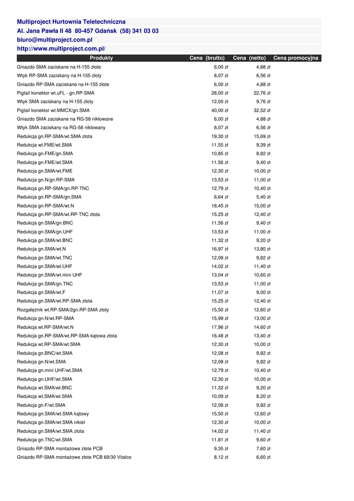 Multiproject Hurtownia Teletechniczna Al. Jana Pawła II 48 80-457 Gdańsk (58) 341 03 03 [email protected] http://www.multiproject.com.pl/ Produkty Cena (brutto) Cena (netto) Gniazdo SMA zaciskane na H-155 złote 6,00 zł 4,88 zł Wtyk RP-SMA zaciskany na H-155 złoty 8,07 zł 6,56 zł Gniazdo RP-SMA zaciskane na H-155 złote 6,00 zł 4,88 zł Pigtail konektor wt.uFL - gn.RP-SMA 28,00 zł 22,76 zł Wtyk SMA zaciskany na H-155 złoty 12,00 zł 9,76 zł Pigtail konektor wt.MMCX/gn.SMA 40,00 zł 32,52 zł 6,00 zł 4,88 zł Gniazdo SMA zaciskane na RG-58 niklowane Wtyk SMA zaciskany na RG-58 niklowany 8,07 zł 6,56 zł Redukcja gn.RP-SMA/wt.SMA złota 19,30 zł 15,69 zł Redukcja wt.FME/wt.SMA 11,55 zł 9,39 zł Redukcja gn.FME/gn.SMA 10,85 zł 8,82 zł Redukcja gn.FME/wt.SMA 11,56 zł 9,40 zł Redukcja gn.SMA/wt.FME 12,30 zł 10,00 zł Redukcja gn.N/gn.RP-SMA 13,53 zł 11,00 zł Redukcja gn.RP-SMA/gn.RP-TNC 12,79 zł 10,40 zł 6,64 zł 5,40 zł Redukcja gn.RP-SMA/wt.N 18,45 zł 15,00 zł Redukcja gn.RP-SMA/wt.RP-TNC złota 15,25 zł 12,40 zł Redukcja gn.SMA/gn.BNC 11,56 zł 9,40 zł Redukcja gn.SMA/gn.UHF 13,53 zł 11,00 zł Redukcja gn.SMA/wt.BNC 11,32 zł 9,20 zł Redukcja gn.SMA/wt.N 16,97 zł 13,80 zł Redukcja gn.SMA/wt.TNC 12,08 zł 9,82 zł Redukcja gn.SMA/wt.UHF 14,02 zł 11,40 zł Redukcja gn.SMA/wt.mini UHF 13,04 zł 10,60 zł Redukcja gn.SMA/gn.TNC 13,53 zł 11,00 zł Redukcja gn.SMA/wt.F 11,07 zł 9,00 zł Redukcja gn.SMA/wt.RP-SMA złota 15,25 zł 12,40 zł Rozgałęźnik wt.RP-SMA/2gn.RP-SMA złoty 15,50 zł 12,60 zł Redukcja gn.N/wt.RP-SMA 15,99 zł 13,00 zł Redukcja wt.RP-SMA/wt.N 17,96 zł 14,60 zł Redukcja gn.RP-SMA/wt.RP-SMA kątowa złota 16,48 zł 13,40 zł Redukcja wt.RP-SMA/wt.SMA 12,30 zł 10,00 zł Redukcja gn.BNC/wt.SMA 12,08 zł 9,82 zł Redukcja gn.N/wt.SMA 12,08 zł 9,82 zł Redukcja gn.mini UHF/wt.SMA 12,79 zł 10,40 zł Redukcja gn.UHF/wt.SMA 12,30 zł 10,00 zł Redukcja wt.SMA/wt.BNC 11,32 zł 9,20 zł Redukcja wt.SMA/wt.SMA 10,09 zł 8,20 zł Redukcja gn.F/wt.SMA 12,08 zł 9,82 zł Redukcja gn.SMA/wt.SMA kątowy 15,50 zł 12,60 zł Redukcja gn.SMA/wt.SMA nikiel 12,30 zł 10,00 zł Redukcja gn.SMA/wt.SMA złota 14,02 zł 11,40 zł Redukcja gn.TNC/wt.SMA 11,81 zł 9,60 zł Gniazdo RP-SMA montażowe złote PCB 9,35 zł 7,60 zł Gniazdo RP-SMA montażowe złote PCB 69/30 Vitalco 8,12 zł 6,60 zł Redukcja gn.RP-SMA/gn.SMA Cena promocyjna Gniazdo RP-SMA montażowe złote na kabel 7,87 zł 6,40 zł Gniazdo RP-SMA zaciskane na H-1000 5,17 zł 4,20 zł Gniazdo RP-SMA zaciskane na H-155 nikiel 5,66 zł 4,60 zł Gniazdo RP-SMA zaciskane na RG-174 5,66 zł 4,60 zł Gniazdo RP-SMA skręcane na RG-174 8,12 zł 6,60 zł Gniazdo RP-SMA skręcane na RG-58 8,12 zł 6,60 zł Gniazdo RP-SMA zaciskane na RG-58 nikiel 5,66 zł 4,60 zł Gniazdo SMA montażowe do obudowy 7,63 zł 6,20 zł Gniazdo SMA montażowe nikiel 7,01 zł 5,70 zł Gniazdo SMA montażowe złote do druku 10,33 zł 8,40 zł Gniazdo SMA zaciskane na H-155 nikiel 4,92 zł 4,00 zł Gniazdo SMA zaciskane na RG-174 nikiel 5,29 zł 4,30 zł Gniazdo SMA podwójne 6,64 zł 5,40 zł Wtyk RP-SMA zaciskany na H-1000 złoty 7,87 zł 6,40 zł Wtyk RP-SMA zaciskany na H-1000 nikiel 5,44 zł 4,42 zł 10,58 zł 8,60 zł Wtyk RP-SMA zaciskany na H-155 nikiel 5,29 zł 4,30 zł Wtyk RP-SMA zaciskany na RG-174 5,44 zł 4,42 zł Wtyk RP-SMA zaciskany na RG-174 złoty 6,15 zł 5,00 zł Wtyk RP-SMA zaciskany na RG-58 5,44 zł 4,42 zł Wtyk RP-SMA podwójny 9,72 zł 7,90 zł Wtyk RP-SMA zaciskany na RG-58 złoty 6,15 zł 5,00 zł Wtyk RP-SMA skręcany na H-155 Wtyk SMA skręcany na RG-58 Wtyk SMA skręcany na RG-58 złoty Wtyk SMA zaciskany na H-155 Wtyk SMA zaciskany na H-155 kątowy 7,38 zł 6,00 zł 10,58 zł 8,60 zł 5,66 zł 4,60 zł 11,07 zł 9,00 zł Wtyk SMA zaciskany na RG-174 5,44 zł 4,42 zł Terminator SMA rezystor zakończeniowy 4,80 zł 3,90 zł Redukcja gn.SMA/wt.SMB złota 17,22 zł 14,00 zł Redukcja wt.SMA/wt.UHF 16,73 zł 13,60 zł Redukcja gn.RP-BNC/wt.SMA 16,73 zł 13,60 zł Redukcja wt.SMA/2xgn.SMA 20,91 zł 17,00 zł Redukcja wt.SMA/wt.TNC 20,91 zł 17,00 zł Redukcja wt.SMA/wt.N Vitalco 20,91 zł 17,00 zł Gniazdo SMA potrójne 22,14 zł 18,00 zł Redukcja gn.SMA/gn.BNC 11,07 zł 9,00 zł Redukcja gn.SMA/gn.BNC 12,30 zł 10,00 zł Redukcja wt.MCX/gn.SMA 21,65 zł 17,60 zł