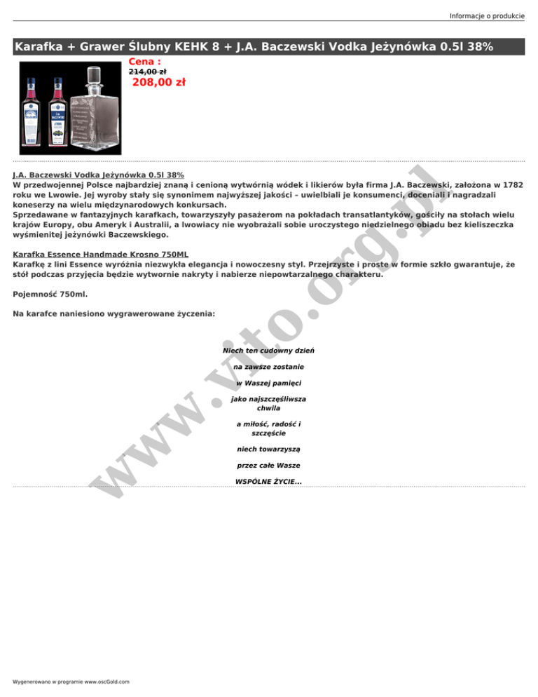 Informacje o produkcie Karafka + Grawer Ślubny KEHK 8 + J.A. Baczewski Vodka Jeżynówka 0.5l 38% Cena : 214,00 zł 208,00 zł or g. pl J.A. Baczewski Vodka Jeżynówka 0.5l 38% W przedwojennej Polsce najbardziej znaną i cenioną wytwórnią wódek i likierów była firma J.A. Baczewski, założona w 1782 roku we Lwowie. Jej wyroby stały się synonimem najwyższej jakości – uwielbiali je konsumenci, doceniali i nagradzali koneserzy na wielu międzynarodowych konkursach. Sprzedawane w fantazyjnych karafkach, towarzyszyły pasażerom na pokładach transatlantyków, gościły na stołach wielu krajów Europy, obu Ameryk i Australii, a lwowiacy nie wyobrażali sobie uroczystego niedzielnego obiadu bez kieliszeczka wyśmienitej jeżynówki Baczewskiego. Karafka Essence Handmade Krosno 750ML Karafkę z lini Essence wyróżnia niezwykła elegancja i nowoczesny styl. Przejrzyste i proste w formie szkło gwarantuje, że stół podczas przyjęcia będzie wytwornie nakryty i nabierze niepowtarzalnego charakteru. Na karafce naniesiono wygrawerowane życzenia: o. Pojemność 750ml. it Niech ten cudowny dzień w .v na zawsze zostanie w Waszej pamięci jako najszczęśliwsza chwila w w a miłość, radość i szczęście Wygenerowano w programie www.oscGold.com niech towarzyszą przez całe Wasze WSPÓLNE ŻYCIE...