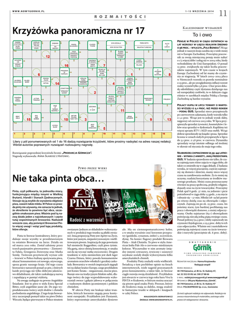 W W W.NOW YGORNIK.PL 1–15 W R Z E Ś N I A 2 014 R O Z M A I T O Ś C I Krzyżówka panoramiczna nr 17 11 Kalejdoskop wydarzeń To i owo Pensje w Polsce w ciągu ostatnich 10 lat wzrosły w ujęciu realnym średnio o 36 proc. – wyliczył „Puls Biznesu”. Wciąż jednak w naszym kraju zarabia się o wiele mniej niż w Europie Zachodniej. Przeciętny pracownik za swoją miesięczną pensję może nabyć o 1/3 więcej dóbr i usług niż w 2004 roku, kiedy wchodziliśmy do Unii Europejskiej. O ponad 13 proc. zwiększyła się także liczba pracowników najemnych. W tym czasie w krajach Europy Zachodniej od lat mamy do czynienia ze stagnacją. W latach 2004–2014 płaca w Niemczech wzrosła co prawda nominalnie o 23 proc., ale po uwzględnieniu inflacji wzrost realny wyniósł tylko 3,8 proc. Choć przez dekadę odrobiliśmy część dystansu dzielącego nas od europejskiej czołówki, to w dalszym ciągu różnice w zarobkach między Polską a Europą Zachodnią są bardzo wyraźne. Polacy kupili w lipcu towary o wartości wyższej o 2,1 proc. niż przed rokiem – podał GUS. Sprzedaż nieco przyspieszyła po czerwcowym załamaniu, kiedy wzrosła tylko o 1,2 proc. Wciąż jest to jednak wynik słaby, najgorszy od czerwca 2013 roku. W lipcu przyspieszyła sprzedaż żywności, kosmetyków i leków oraz sprzedaż w dyskontach. Kupiliśmy też więcej sprzętu RTV i AGD oraz mebli. Wciąż dobrze sprzedawały się książki i prasa. Sprzedaż liczona w cenach stałych przyspieszyła w lipcu do 3,1 proc. z 1,8 proc. w czerwcu. Dynamika sprzedaży wciąż istotnie odbiega od średniej w okresie od stycznia do maja tego roku. Rozwiązanie poprzedniej krzyżówki brzmi: „Produkcja Górnicza”. Nagrodę wylosowała: Anna Słabosz z Katowic. Piwo przez wieki Pinta, czyli półkwarta, to jednostka miary, funkcjonująca między innymi w Wielkiej Brytanii, Irlandii i Stanach Zjednoczonych. Stosuje się ją zwykle do wyrażenia objętości piwa, czasem także mleka. W Polsce co prawda pinty nie używamy, nie oznacza to jednak, że określenie to powinno być obce, szczególnie smakoszom piwa. Właśnie pod tą nazwą działa jeden z najciekawszych i często tutaj wspominanych browarów. Nadszedł wreszcie czas, aby poświęcić Browarowi Pinta więcej uwagi i wziąć pod lupę produkty, które oferuje. Pinta to browar kontraktowy, który produkuje swoje wyroby w przedstawionym tu ostatnio Browarze na Jurze. Działa on od marca 2011 roku. Został założony przez trzech pasjonatów piwowarstwa – Ziemowita Fałata, Grzegorza Zwierzynę oraz Marka Semlę. Twórcom przyświecały wyższe cele – krzewić w Polsce kulturę spożywania piwa, ukazać konsumentom coś nowego, ożywczego, spoza granic naszego kraju. Od tego czasu browarnicy nawarzyli ponad 30 piw, z których każde przyciąga nie tylko dobrymi jakościowo składnikami, ale także zaskakującą nazwą i zapadającą w pamięć etykietą. Na uwagę zasługuje na pewno Angielskie Śniadanie. Jest to piwo w stylu Extra Special Bitter, czyli angielskie jasne ale. Do jego wyprodukowania twórcy użyli słodów i chmielu pochodzenia angielskiego. Z tego kraju browarnicy zaczerpnęli pomysł także na piwo Dobry Wieczór, będące pierwszym w Polsce stoutem ARCHIWUM Nie taka pinta obca… owsianym (jednym ze składników wykorzystanych w produkcji tego trunku są płatki owsiane). Inną propozycją Pinty jest Apetyt na Życie, które jest jasnym, niepasteryzowanym i niefiltrowanym piwem. Inspiracją do jego powstania był niemiecki Roggenbier, czyli piwo żytnie. Ma gęstą, nieco oleistą konsystencję, w smaku zaś da się wyczuć nutkę owocowości. Drugim trunkiem w stylu niemieckim jest dark lager Czarna Dziura, który powala konsumentów aromatem orzechów włoskich i gorzkiej czekolady. Browarnicy w swoich inspiracjach sięgnęli też na dalsze krańce Europy, czego przykładem jest Koniec Świata – niegazowane, mocne piwo. Bazuje ono na tradycyjnym fińskim sahti, dlatego twórcy do jego wyprodukowania wykorzystali owoce i gałęzie jałowca w połączeniu z wędzonym słodem jęczmiennym i polskim chmielem. W ofercie Pinty nie brakuje także trunków, których korzenie sięgają poza kontynent europejski. Przykładem jest Dyniamit, który reprezentuje amerykańskie dyniowe ale. Ma on ciemnopomarańczowy kolor, a w smaku wyraźnie czuć korzenne przyprawy (goździki, cynamon, imbir) i, oczywiście, dynię. Na koniec flagowy produkt Browaru Pinta – Atak Chmielu. To piwo w stylu American India Pale Ale o czerwono-miedzianym kolorze. Wyczuwalne w nim aromaty (między innymi cytrusowy, żywiczny i sosnowy) uzyskane zostały dzięki wykorzystaniu kilku amerykańskich chmieli. Produkty Pinty znalazły wielu wielbicieli. Świadczą o tym pochlebne opinie na forach internetowych, wiele nagród przyznanych przez konsumentów, a także fakt, że browar ciągle rozwija swoją działalność. Przykładem jest otwarcie w czerwcu tego roku baru Viva la PINTA w Krakowie, w którym można uraczyć się piwem spod znaku Pinty. Piwosze, którzy do Krakowa mają za daleko, mogą znaleźć te fantazyjne trunki w sklepach i knajpach w całej Polsce. MAŁGORZATA BERNATOWICZ ŹRÓDŁO: WWW.BROWARPINTA.PL Najbardziej zapracowani są 35–44-latkowie – wynika z ankiety, jaką przedstawił GUS. W badaniu sprawdzono nie tylko, ile czasu zajmują nam różne zajęcia w ciągu doby, ale także co zmieniło się w ciągu dekady. Z badania wynika, że więcej pracujemy, częściej zajmujemy się domem i dziećmi, mamy nieco więcej czasu na zamiłowania osobiste. Za to mniej się uczymy, rzadziej korzystamy ze środków masowego przekazu. Mniej czasu przeznaczamy również na pracę społeczną, praktyki religijne, dojazdy oraz na życie towarzyskie. Przeciętny Polak spał 8 godz. 37 min, na jedzenie i picie potrzebował w ciągu doby 1,5 godz., a na mycie i ubranie się – 57 min. Młodzi (18–19 lat) prawie po równo dzielą czas na obowiązki i odpo