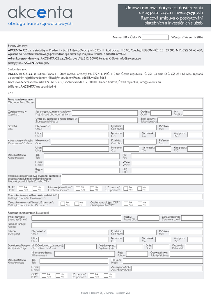 Umowa ramowa dotycząca dostarczania usług płatniczych i inwestycyjnych Rámcová smlouva o poskytování platebních a investičních služeb Numer UR / Číslo RS: Wersja / Verze: 1/2016 Strony Umowy: AKCENTA CZ a.s. z siedzibą w Pradze 1 - Staré Město, Ovocný trh 572/11, kod poczt. 110 00, Czechy, REGON (IČ): 251 63 680, NIP: CZ2 51 63 680, wpisana do Rejestru Handlowego prowadzonego przez Sąd Miejski w Pradze, oddział B, nr 9662 Adres korespondencyjny: AKCENTA CZ a.s.,Gočárova třída 312, 500 02 Hradec Králové, [email protected] (dalej tylko „AKCENTA“) między Smluvní strany: AKCENTA CZ a.s. se sídlem Praha 1 - Staré město, Ovocný trh 572/11, PSČ 110 00, Česká republika, IČ 251 63 680, DIČ CZ 251 63 680, zapsaná v obchodním rejstříku vedeném Městským soudem v Praze, oddíl B, vložka 9662 Korespondenční adresa: AKCENTA CZ a.s., Gočárova třída 312, 500 02 Hradec Králové, Česká republika, [email protected] (dále jen „AKCENTA“) na straně jedné i/a Firma handlowa / Imię: Obchodní rma/Název: Zarejestrowany w Zapsána u Siedziba Sídlo Sąd okręgowy, rejestr handlowy: Krajský soud, obchodní rejstřík v: Oddział: Oddíl: Urząd ds. działalności gospodarczej w: Živnostenský úřad v: Znak sprawy: Spisová značka: Miejscowość: Obec: Dzielnica: Část obce: Ulica: Ulice: Nr domu: Č.p: Adres korespondencyjny Miejscowość: Korespondenční adresa Obec: Nr mieszk.: Č.o: Nr mieszk.: Č.o: Tel.: Tel.: Fax: Fax: E-mail: E-mail: Www: Www: Tak Ano Nie Ne Kod poczt.: PSČ: Państwo: Stát: Nr domu: Č.p: Regon: IČ: Przedmiot działalności (wg ewidencji działalności gospodarczej lub rejestru handlowego): Předmět podnikání (dle ŽL nebo OR): EMIR 1): EMIR 1): Państwo: Stát: Dzielnica: Část obce: Ulica: Ulice: Dane kontaktowe Kontaktní údaje Nr: Vložka: Kod poczt.: PSČ: NIP: DIČ: Informacja handlowa2): Obchodní sdělení 2): Tak Ano U.S. person 3): U.S. person 3): Tak Ano Nie Ne Osoba kontrolująca OEP 6): Ovládající osoba PEP 6): Tak Ano Nie Ne Nie Ne Osoba kontrolująca/Rzeczywisty właściciel 4): Ovládající osoba/Skutečný majitel 4): Osoba kontrolująca Klienta U.S. person 5): Ovládající osoba Klienta U.S. person 5): Tak Ano Nie Ne Reprezentowana przez / Zastoupená Imię i nazwisko: Jméno a příjmení: PESEL: Rodné číslo: Data urodzenia: Datum narození: Pełniona funkcja: Funkce: Pobyt w Trvalý pobyt Miejscowość: Obec: Dzielnica: Část obce: Ulica: Ulice: Nr domu: Č.p: Wydany przez: Vystavený kým: Dane identykacyjne Nr DO (dowód tożsamości): Identifikační údaje Číslo průkazu totožnosti: Miejsce urodzenia: Místo narození: Dane kontaktowe Kontaktní údaje Płeć: Pohlaví: Tel. kom.: Mobil: E-mail: E-mail: Autoryzacja SMS: Autentizační SMS: Tak Ano Nie Ne U.S. person 8): U.S. person 8): Tak Ano Nr mieszk.: Č.o: Dnia: Dne: Tel.: Tel.: OEP 7): PEP 7): Państwo: Stát: Nie Ne Strana 1 (razem 25) / Strana 1 (celkem 25) Obywatelstwo: Státní příslušnost: Kod poczt.: PSČ: Ważny do: Platnost do: Reprezentowana przez / Zastoupená Imię i nazwisko: Jméno a příjmení: PESEL: Rodné číslo: Data urodzenia: Datum narození: Pełniona funkcja: Funkce: Pobyt w Trvalý pobyt Miejscowość: Obec: Dzielnica: Část obce: Ulica: Ulice: Nr domu: Č.p: Nr mieszk.: Č.o: Wydany przez: Vystavený kým: Dane identykacyjne Nr DO (dowód tożsamości): Identifikační údaje Číslo průkazu totožnosti: Miejsce urodzenia: Místo narození: Dane kontaktowe Kontaktní údaje Państwo: Stát: Dnia: Dne: Płeć: Pohlaví: Tel.: Tel.: Tel. kom.: Mobil: E-mail: E-mail: Autoryzacja SMS: Autentizační SMS: OEP 7): PEP 7): Tak Ano Nie Ne U.S. person 8): U.S. person 8): Tak Ano Kod poczt.: PSČ: Ważny do: Platnost do: Obywatelstwo: Státní příslušnost: Nie Ne Reprezentowana przez / Zastoupená Imię i nazwisko: Jméno a příjmení: PESEL: Rodné číslo: Data urodzenia: Datum narození: Pełniona funkcja: Funkce: Pobyt w Trvalý pobyt Miejscowość: Obec: Dzielnica: Část obce: Ulica: Ulice: Nr domu: Č.p: Wydany przez: Vystavený kým: Dane identykacyjne Nr DO (dowód tożsamości): Identifikační údaje Číslo průkazu totožnosti: Miejsce urodzenia: Místo narození: Dane kontaktowe Kontaktní údaje Płeć: Pohlaví: Tel. kom.: Mobil: E-mail: E-mail: Autoryzacja SMS: Autentizační SMS: Tak Ano Nie Ne U.S. person 8): U.S. person 8): Tak Ano Nr mieszk.: Č.o: Dnia: Dne: Tel.: Tel.: OEP 7): PEP 7): Państwo: Stát: Kod poczt.: PSČ: Ważny do: Platnost do: Obywatelstwo: Státní příslušnost: Nie Ne (zwana dalej „Klient“) z drugiej strony / (dále jen „Klient”) na straně druhé Strony umowy zawarły w niżej podanym dniu, miesiącu i roku na podstawie § 1746 ust. 2 ustawy nr 89/2012 Sb., Kodeks cywilny, z pózn. zm. (zwanym dalej „Kodeks cywilny“), oraz zgodnie z § 74 ust. 1 i nast. ustawy nr 284/2009 Sb., o usługach płatniczych, z pózn. zm. (zwana dalej „ZPS”) oraz w rozumieniu § 15 i następnych ustawy nr 256/2004 Sb. o prowadzeniu działalności gospodarczej na rynku kapitałowym, z pózn. zm., (zwaną dalej „ZPKT”) niniejszą Umowę Ramową dotyczącą wykonywania transakcji terminowych w walutach obcych (zwaną dalej „Umową“): Smluvní strany uzavřely níže uvedeného dne, měsíce a roku v souladu s ustanovením § 1746 odst. 2 zákona č. 89/2012 Sb., občanský zákoník, v platném znění (dále jen „Občanský zákoník“), a ve smyslu ustanovení § 74 odst. 1 a násl. zákona č. 284/2009 Sb., o platebním styku, v platném znění (dále jen „ZPS”) tuto Rámcovou smlouvu o provádění obchodů s cizími měnami a platebních službách (dále jen „Smlouva“): Artykuł I. Definicja Dla celów niniejszej Umowy lub któregokolwiek z jej załączników zawarte w niej terminy i denicje wyjaśnione są w art. I. punkt 1 Ogólnych Warunków Handlowych (zwanych dalej „OWH“), które stanowią nieodłączną część niniejszej Umowy