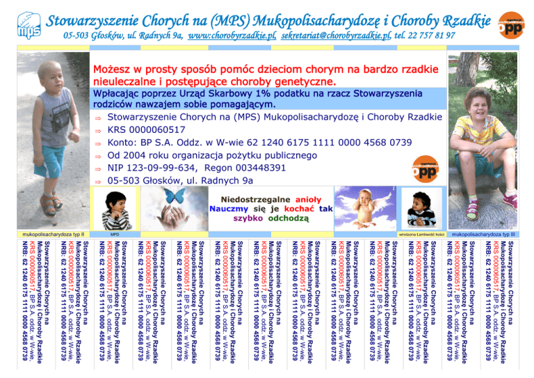 Stowarzyszenie Chorych na (MPS) Mukopolisacharydozę i Choroby Rzadkie 05-503 Głosków, ul. Radnych 9a, www:chorobyrzadkie.pl, [email protected], tel. 22 757 81 97 Możesz w prosty sposób pomóc dzieciom chorym na bardzo rzadkie nieuleczalne i postępujące choroby genetyczne. Wpłacając poprzez Urząd Skarbowy 1% podatku na rzacz Stowarzyszenia rodziców nawzajem sobie pomagającym. Stowarzyszenie Chorych na (MPS) Mukopolisacharydozę i Choroby Rzadkie KRS 0000060517 Konto: BP S.A. Oddz. w W-wie 62 1240 6175 1111 0000 4568 0739 Od 2004 roku organizacja pożytku publicznego NIP 123-09-99-634, Regon 003448391 05-503 Głosków, ul. Radnych 9a Niedostrzegalne anioły Nauczmy się je kochać tak szybko odchodzą mukopolisacharydoza typ III wrodzona Łamliwość kości MPD mukopolisacharydoza typ II Stowarzyszenie Chorych na Mukopolisacharydozę i Choroby Rzadkie KRS 0000060517, BP S.A. oddz. w W-wie, NRB: 62 1240 6175 1111 0000 4568 0739 Stowarzyszenie Chorych na Mukopolisacharydozę i Choroby Rzadkie KRS 0000060517, BP S.A. oddz. w W-wie, NRB: 62 1240 6175 1111 0000 4568 0739 Stowarzyszenie Chorych na Mukopolisacharydozę i Choroby Rzadkie KRS 0000060517, BP S.A. oddz. w W-wie, NRB: 62 1240 6175 1111 0000 4568 0739 Stowarzyszenie Chorych na Mukopolisacharydozę i Choroby Rzadkie KRS 0000060517, BP S.A. oddz. w W-wie, NRB: 62 1240 6175 1111 0000 4568 0739 Stowarzyszenie Chorych na Mukopolisacharydozę i Choroby Rzadkie KRS 0000060517, BP S.A. oddz. w W-wie, NRB: 62 1240 6175 1111 0000 4568 0739 Stowarzyszenie Chorych na Mukopolisacharydozę i Choroby Rzadkie KRS 0000060517, BP S.A. oddz. w W-wie, NRB: 62 1240 6175 1111 0000 4568 0739 Stowarzyszenie Chorych na Mukopolisacharydozę i Choroby Rzadkie KRS 0000060517, BP S.A. oddz. w W-wie, NRB: 62 1240 6175 1111 0000 4568 0739 Stowarzyszenie Chorych na Mukopolisacharydozę i Choroby Rzadkie KRS 0000060517, BP S.A. oddz. w W-wie, NRB: 62 1240 6175 1111 0000 4568 0739 Stowarzyszenie Chorych na Mukopolisacharydozę i Choroby Rzadkie KRS 0000060517, BP S.A. oddz. w W-wie, NRB: 62 1240 6175 1111 0000 4568 0739 Stowarzyszenie Chorych na Mukopolisacharydozę i Choroby Rzadkie KRS 0000060517, BP S.A. oddz. w W-wie, NRB: 62 1240 6175 1111 0000 4568 0739 Stowarzyszenie Chorych na Mukopolisacharydozę i Choroby Rzadkie KRS 0000060517, BP S.A. oddz. w W-wie, NRB: 62 1240 6175 1111 0000 4568 0739 Stowarzyszenie Chorych na Mukopolisacharydozę i Choroby Rzadkie KRS 0000060517, BP S.A. oddz. w W-wie, NRB: 62 1240 6175 1111 0000 4568 0739 Stowarzyszenie Chorych na Mukopolisacharydozę i Choroby Rzadkie KRS 0000060517, BP S.A. oddz. w W-wie, NRB: 62 1240 6175 1111 0000 4568 0739
