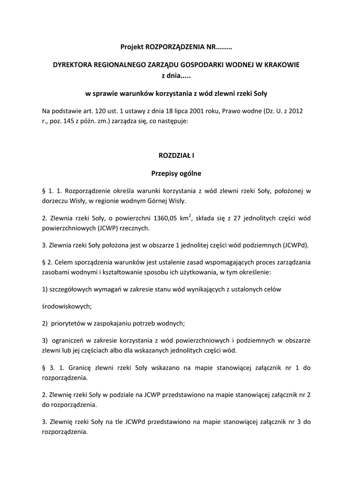 Y KT G L G UG S z dnia..... w sp awi wa un ów K W JWK K W zys ania z wód zl wni z i S ły Na podstawie art. 120 ust. 1 ustawy z dnia 18 lipca 2001 roku, Prawo wodne (Dz. U. z 2012 r., poz. 145 z późn. zm.) zarządza się, co następuje: Ł z pisy góln 1. 1. ozporządzenie o re a arun i orz stania z dorzeczu Wisł , regionie odn m Górnej Wisł . ód z e ni rzeki Soł , położonej w 2. Z e nia rze i Soł , o po ierzchni 1360,05 km2, s łada się z 27 jedno it ch czę ci powierzchniowych (JCWP) rzecznych. 3. Z e nia rze i Soł położona jest ód o szarze 1 jedno itej czę ci ód podziemnych (JCWPd). 2. e em sporządzenia arun ó jest usta enie zasad spomagając ch proces zarządzania zaso ami odn mi i ształto anie sposo u ich uż t o ania, t m o re enie: 1) szczegóło ch rodo is o ch 2) prior tetó magao za resie stanu ód zaspo ajaniu potrze ni ając ch z usta on ch ce ó odn ch 3) ograniczeo za resie orz stania z ód po ierzchnio ch i podziemn ch z e ni u jej czę ciach a o d a s azan ch jedno it ch czę ci ód. o szarze 3. 1. Granicę z e ni rze i Soł rozporządzenia. nr 1 do 2. Z e nię rze i Soł do rozporządzenia. podzia e na 3. Z e nię rze i Soł na t e rozporządzenia. s azano na mapie stano iącej załączni W przedsta iono na mapie stano iącej załączni nr 2 W d przedsta iono na mapie stano iącej załączni nr 3 do ROZ Szcz gół w wymagania w za Ł si s anu wód, wyni a ąc z us al nych c lów ś dowiskowych 4. 1. D a osiągnięcia ce u, o tór m mo a art. 38d ust. 1 usta Prawo wodne wymaga się, stan żadnego z e ementó ja o ci o re on ch rozporządzeniu wydanym na podstawie art. 38a ust. 3 w/w ustawy nie u egał pogorszeniu, stopniu po odując m przeklasyfikowanie s aźni ó ja o ci ód do arto ci odpo iadając ch asie gorszej niż wskazana w aktualnej ocenie stanu. A tua ną ocenę stanu jedno it ch czę ci ód powierzchniowych niewyznaczonych jako sztuczne lub silnie zmienione wskazano w załączni u nr 4 do rozporządzenia. 2. D a osiągnięcia ce u, o tór m mo a art. 38d ust. 2 ustawy Prawo wodne maga się, by stan żadnego z e ementó ja o ci o re on ch rozporządzeniu dan m na podsta ie art. 38a ust. 3 w/w usta nie u egał pogorszeniu, stopniu po odując m prze as fi o anie s aźni ó ja o ci ód do arto ci odpo iadając ch asie gorszej niż wskazana w aktualnej ocenie stanu. A tua ną ocenę stanu jedno it ch czę ci ód po ierzchnio ch znaczon ch ja o sztuczne u si nie zmienione s azano załączni u nr 4 do rozporządzenia. 5. 1. W ce u osiągnięcia lub zachowania dobrego stanu u potencjału jedno it ch czę ci ód po ierzchnio ch p ano ane orz stanie z ód nie może po odo ać marnotrawstwa wody. 2. W maga się, pro adzanie do ód u do ziemi ód opado ch u roztopo ch ło poprzedzone przepro adzeniem ana iz moż i o ci prz jęcia t ch ód, prz założeniu przepł u od iorni u o pra dopodo ieost ie stąpienia ident czn m z pra dopodo ieost em, na jaki liczony jest wylot. 3. W maga się, dla powierzchni dróg i par ingó o na ierzchni szcze nej położon ch miastach o gęsto ci za udnienia prze raczającej 1 300 osó / m2, z tór ch są pro adzane do ód u do ziemi od opado e u roztopo e, ujęte ot arte u zam nięte s stem kanalizacyjne przewidziane został roz iązania retencjonujące te wody. 6. 1. W ce u osiągnięcia u zacho ania do rego stanu jedno it ch czę ci ód po ierzchnio ch, o o iąz i niez ędne ze zg ędu na ochronę zaso ó rodo is a o re one poz o eniu odnopra n m o ejmują s azanie częstot i o ci rejestro ania: 1) i o ci po ran ch o ejn ch miesiącach ód powierzchniowych, od począt u ażdego ro u a endarzo ego z częstot i o cią raz 2) i o ci pobranych o ejn ch miesiącach roku kalendarzowego z częstot i o cią raz miesiącu. ód podziemn ch, od począt u ażdego miesiącu. 3) i o ci cie ó odpro adzan ch o ejn ch miesiącach, od począt u ażdego ro u kalendarzo ego, do ód i do ziemi, z tór ch mo a łączeniem ód opado art. 9 ust. 1 p t 14 it. c usta ch i roztopo ch , o Prawo wodne z częstot i o cią raz miesiącu. 2. Informacja niez ędna do prowadzenia katastru wodnego o re ona w pozwoleniu wodnoprawnym obejmuje ró nież wskazanie, 1) dan ch o piętrach szczegó no ci: odono n ch, z tór ch rea izo an i chara ter st i pro adzon ch z nich po oró jest po ór z oznaczeniem od spółrzędn ch geograficzn ch ujęć, miejsco o ci oraz numeru e idenc jnego dział i 2) oznaczenia naz cie u u z iorni a, naz W i spółrzędn ch geograficzn ch 3) oznaczenia nazwy cieku lub zbiorni a, naz W i spółrzędn ch geograficzn ch ujęcia, zrzutu. 3. W pozwoleniu wodnoprawnym, na eż usta ić o o iąze prze az ania dan ch niez ędn ch do pro adzenia katastru odnego zgodnie z ustępem 1 oraz ich przekazywania do katastru wodnego jeden raz do ro u, za ro poprzedni, ROZ terminie do ooca marca. Ł Priorytety w zaspokajaniu potrzeb wodnych 7. W zakresie zaspokajania potrzeb wodnych w zlewni rzeki Soł stosuje się prior tet ustano ione ozporządzeniu D re tora egiona nego Zarządu Gospodar i Wodnej Kra o ie spra ie arun ó orz stania z ód regionu odnego Górnej Wisł . ROZ g anicz nia w za 8. W z e ni rze i Soł Ł V si zys ania z wód pro adza się następujące ograniczenie: W onanie udo i piętrzącej or cie cie ó chodząc ch s ład WP: Sopotnia, Krz żó a, ięcin a, Ża niczan a, Sa amon a, Nickulina, Woda Ujsolska, Soła do Wody Ujsolskiej, Le nian a i B stra, Soła od z iorni a zaniec do uj cia - maga posażenia tej budowli wodnej w urządzenia odne zape niające migrację rzan i, gło acza i minoga strumienio ego (ch a, że onstru cja udo i zape nia prz przepł ie rednim nis im (SNQ) utrzymanie takiej migracji). W magania zg ędem ta ich urządzeo s azano załączni u nr 5 do rozporządzenia. Lo a izację cie ó , o tór ch mo a odniesieniu do granic z e ni rze i Soł s azano na mapie stano iącej załączni nr 6 do rozporządzenia. RO Postanowienia ŁV oc w 9. Warun i orz stania z ód z e ni nie naruszają mogó arun ó orz stania z ó