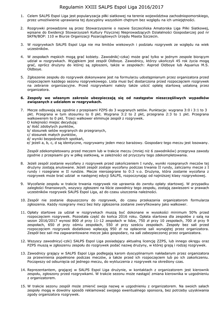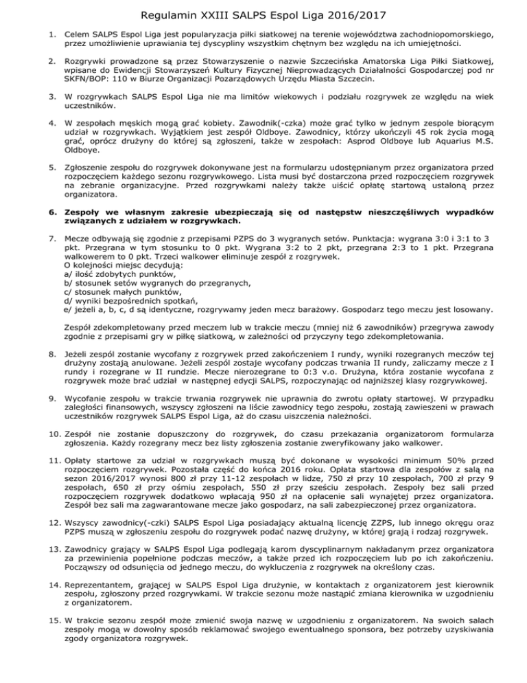 Regulamin XXIII SALPS Espol Liga 2016/2017 1. Celem SALPS Espol Liga jest popularyzacja piłki siatkowej na terenie województwa zachodniopomorskiego, przez umożliwienie uprawiania tej dyscypliny wszystkim chętnym bez względu na ich umiejętności. 2. Rozgrywki prowadzone są przez Stowarzyszenie o nazwie Szczecińska Amatorska Liga Piłki Siatkowej, wpisane do Ewidencji Stowarzyszeń Kultury Fizycznej Nieprowadzących Działalności Gospodarczej pod nr SKFN/BOP: 110 w Biurze Organizacji Pozarządowych Urzędu Miasta Szczecin. 3. W rozgrywkach SALPS Espol Liga nie ma limitów wiekowych i podziału rozgrywek ze względu na wiek uczestników. 4. W zespołach męskich mogą grać kobiety. Zawodnik(-czka) może grać tylko w jednym zespole biorącym udział w rozgrywkach. Wyjątkiem jest zespół Oldboye. Zawodnicy, którzy ukończyli 45 rok życia mogą grać, oprócz drużyny do której są zgłoszeni, także w zespołach: Asprod Oldboye lub Aquarius M.S. Oldboye. 5. Zgłoszenie zespołu do rozgrywek dokonywane jest na formularzu udostępnianym przez organizatora przed rozpoczęciem każdego sezonu rozgrywkowego. Lista musi być dostarczona przed rozpoczęciem rozgrywek na zebranie organizacyjne. Przed rozgrywkami należy także uiścić opłatę startową ustaloną przez organizatora. 6. Zespoły we własnym zakresie ubezpieczają się od następstw nieszczęśliwych wypadków związanych z udziałem w rozgrywkach. 7. Mecze odbywają się zgodnie z przepisami PZPS do 3 wygranych setów. Punktacja: wygrana 3:0 i 3:1 to 3 pkt. Przegrana w tym stosunku to 0 pkt. Wygrana 3:2 to 2 pkt, przegrana 2:3 to 1 pkt. Przegrana walkowerem to 0 pkt. Trzeci walkower eliminuje zespół z rozgrywek. O kolejności miejsc decydują: a/ ilość zdobytych punktów, b/ stosunek setów wygranych do przegranych, c/ stosunek małych punktów, d/ wyniki bezpośrednich spotkań, e/ jeżeli a, b, c, d są identyczne, rozgrywamy jeden mecz barażowy. Gospodarz tego meczu jest losowany. Zespół zdekompletowany przed meczem lub w trakcie meczu (mniej niż 6 zawodników) przegrywa zawody zgodnie z przepisami gry w piłkę siatkową, w zależności od przyczyny tego zdekompletowania. 8. Jeżeli zespól zostanie wycofany z rozgrywek przed zakończeniem I rundy, wyniki rozegranych meczów tej drużyny zostają anulowane. Jeżeli zespól zostaje wycofany podczas trwania II rundy, zaliczamy mecze z I rundy i rozegrane w II rundzie. Mecze nierozegrane to 0:3 v.o. Drużyna, która zostanie wycofana z rozgrywek może brać udział w następnej edycji SALPS, rozpoczynając od najniższej klasy rozgrywkowej. 9. Wycofanie zespołu w trakcie trwania rozgrywek nie uprawnia do zwrotu opłaty startowej. W przypadku zaległości finansowych, wszyscy zgłoszeni na liście zawodnicy tego zespołu, zostają zawieszeni w prawach uczestników rozgrywek SALPS Espol Liga, aż do czasu uiszczenia należności. 10. Zespół nie zostanie dopuszczony do rozgrywek, do czasu przekazania organizatorom formularza zgłoszenia. Każdy rozegrany mecz bez listy zgłoszenia zostanie zweryfikowany jako walkower. 11. Opłaty startowe za udział w rozgrywkach muszą być dokonane w wysokości minimum 50% przed rozpoczęciem rozgrywek. Pozostała część do końca 2016 roku. Opłata startowa dla zespołów z salą na sezon 2016/2017 wynosi 800 zł przy 11-12 zespołach w lidze, 750 zł przy 10 zespołach, 700 zł przy 9 zespołach, 650 zł przy ośmiu zespołach, 550 zł przy sześciu zespołach. Zespoły bez sali przed rozpoczęciem rozgrywek dodatkowo wpłacają 950 zł na opłacenie sali wynajętej przez organizatora. Zespół bez sali ma zagwarantowane mecze jako gospodarz, na sali zabezpieczonej przez organizatora. 12. Wszyscy zawodnicy(-czki) SALPS Espol Liga posiadający aktualną licencję ZZPS, lub innego okręgu oraz PZPS muszą w zgłoszeniu zespołu do rozgrywek podać nazwę drużyny, w której grają i rodzaj rozgrywek. 13. Zawodnicy grający w SALPS Espol Liga podlegają karom dyscyplinarnym nakładanym przez organizatora za przewinienia popełnione podczas meczów, a także przed ich rozpoczęciem lub po ich zakończeniu. Począwszy od odsunięcia od jednego meczu, do wykluczenia z rozgrywek na określony czas. 14. Reprezentantem, grającej w SALPS Espol Liga drużynie, w kontaktach z organizatorem jest kierownik zespołu, zgłoszony przed rozgrywkami. W trakcie sezonu może nastąpić zmiana kierownika w uzgodnieniu z organizatorem. 15. W trakcie sezonu zespół może zmienić swoja nazwę w uzgodnieniu z organizatorem. Na swoich salach zespoły mogą w dowolny sposób reklamować swojego ewentualnego sponsora, bez potrzeby uzyskiwania zgody organizatora rozgrywek. 16. Przed każdym meczem sędzia ma prawo do sprawdzania tożsamości wpisanych do protokołu zawodników. Brak dokumentu umożliwiającego stwierdzenie tożsamości powoduje zakaz jego gry w meczu. Jeżeli ten zawodnik w meczu zagra, drużyna przegrywa walkowerem. 17. Na liście zgłoszenia zespołu do rozgrywek w trakcie sezonu mogą być dokonywane zmiany. Z listy można zawodników skreślać lub dopisywać. Nowych zawodników, którzy nie zagrali w tych rozgrywkach w żadnym zespole, można dopisywać do 31.03.2017. Każdy zawodnik może także w trakcie rozgrywek jeden raz zmienić zespól, ale tylko i wyłącznie w okresie transferowym od 01. do 31.12.2016. 18. Zawodnicy zgłaszani do gry w trakcie sezonu nabywają uprawnienia do gry, jeżeli ich nazwiska zostaną przez organizatora wpisane w składzie zespołu umieszczonego na stronie www.espolsalps.pl Wpis następuje po dostarczeniu do kierownika ligi formularza zgłoszenia potwierdzonego podpisem zawodnika. 19. Jeżeli na zawody nie dojedzie wyznaczony sędzia, kapitanowie obu drużyn wyznaczają osobę, która pełnić będzie obowiązki sędziego. O zaistniałej sytuacji i wyniku tego meczu powiadamia organizatora kierownik zespołu gospodarzy, jeżeli był na meczu, a jeżeli był nieobecny, to kapitan drużyny go