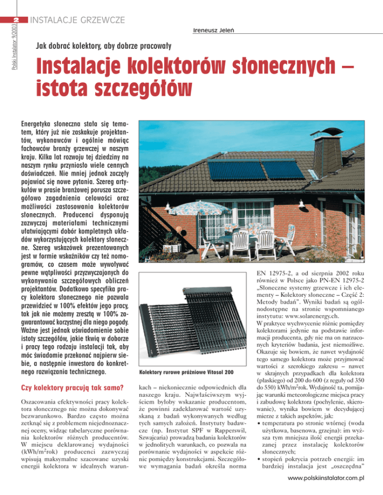 Polski Instalator 9/2003 2 INSTALACJE GRZEWCZE Ireneusz Jeleñ Jak dobraæ kolektory, aby dobrze pracowa³y Instalacje kolektorów s³onecznych – istota szczegó³ów Energetyka s³oneczna sta³a siê tematem, który ju¿ nie zaskakuje projektantów, wykonawców i ogólnie mówi¹c fachowców bran¿y grzewczej w naszym kraju. Kilka lat rozwoju tej dziedziny na naszym rynku przynios³o wiele cennych doœwiadczeñ. Nie mniej jednak zaczê³y pojawiaæ siê nowe pytania. Szereg artyku³ów w prasie bran¿owej porusza szczegó³owo zagadnienia celowoœci oraz mo¿liwoœci zastosowania kolektorów s³onecznych. Producenci dysponuj¹ zazwyczaj materia³ami technicznymi u³atwiaj¹cymi dobór kompletnych uk³adów wykorzystuj¹cych kolektory s³oneczne. Szereg wskazówek prezentowanych jest w formie wskaŸników czy te¿ nomogramów, co czasem mo¿e wywo³ywaæ pewne w¹tpliwoœci przyzwyczajonych do wykonywania szczegó³owych obliczeñ projektantów. Dodatkowo specyfika pracy kolektora s³onecznego nie pozwala przewidzieæ w 100% efektów jego pracy, tak jak nie mo¿emy zreszt¹ w 100% zagwarantowaæ korzystnej dla niego pogody. Wa¿ne jest jednak uœwiadomienie sobie istoty szczegó³ów, jakie tkwi¹ w doborze i pracy tego rodzaju instalacji tak, aby móc œwiadomie przekonaæ najpierw siebie, a nastêpnie inwestora do konkretnego rozwi¹zania technicznego. Czy kolektory pracuj¹ tak samo? Oszacowania efektywnoœci pracy kolektora s³onecznego nie mo¿na dokonywaæ bezwarunkowo. Bardzo czêsto mo¿na zetkn¹æ siê z problemem niejednoznacznej oceny, widz¹c tabelaryczne porównania kolektorów ró¿nych producentów. W miejscu deklarowanej wydajnoœci (kWh/m2rok) producenci zazwyczaj wpisuj¹ maksymalne szacowane uzyski energii kolektora w idealnych warun- Kolektory rurowe pró¿niowe Vitosol 200 kach – niekoniecznie odpowiednich dla naszego kraju. Najw³aœciwszym wyjœciem by³oby wskazanie producentom, ¿e powinni zadeklarowaæ wartoœæ uzyskan¹ z badañ wykonywanych wed³ug tych samych za³o¿eñ. Instytuty badawcze (np. Instytut SPF w Rapperswil, Szwajcaria) prowadz¹ badania kolektorów w jednolitych warunkach, co pozwala na porównanie wydajnoœci w aspekcie ró¿nic pomiêdzy konstrukcjami. Szczegó³owe wymagania badañ okreœla norma EN 12975-2, a od sierpnia 2002 roku równie¿ w Polsce jako PN-EN 12975-2 „S³oneczne systemy grzewcze i ich elementy – Kolektory s³oneczne – Czêœæ 2: Metody badañ”. Wyniki badañ s¹ ogólnodostêpne na stronie wspomnianego instytutu: www.solarenergy.ch. W praktyce wychwycenie ró¿nic pomiêdzy kolektorami jedynie na podstawie informacji producenta, gdy nie ma on narzuconych kryteriów badania, jest niemo¿liwe. Okazuje siê bowiem, ¿e nawet wydajnoœæ tego samego kolektora mo¿e przyjmowaæ wartoœci z szerokiego zakresu – nawet w skrajnych przypadkach dla kolektora (p³askiego) od 200 do 600 (z regu³y od 350 do 550) kWh/m2rok. Wydajnoœæ ta, pomijaj¹c warunki meteorologiczne miejsca pracy i zabudowê kolektora (pochylenie, skierowanie), wynika bowiem w decyduj¹cej mierze z takich aspektów, jak: • temperatura po stronie wtórnej (woda u¿ytkowa, basenowa, grzejna): im wy¿sza tym mniejsza iloœæ energii przekazanej przez instalacjê kolektorów s³onecznych; • stopieñ pokrycia potrzeb energii: im bardziej instalacja jest „oszczêdna” www.polskiinstalator.com.pl Wykres 1 Zale¿noœæ stopnia pokrycia potrzeb energii i sprawnoœci instalacji kolektorów s³onecznych od zastosowanej powierzchni kolektorów (dla przyk³adowej instalacji podgrzewu c.w.u. i niezmienionej pojemnoœci podgrzewacza) Wykres 2 Porównanie miesiêcznych stopni pokrycia potrzeb energii dla podgrzewu c.w.u. w iloœci 300 dm3/d, dla tych samych warunków – dla dwóch rodzajów kolektora Wykres 3 Wp³yw pojemnoœci podgrzewacza pojemnoœciowego na uzysk energii i sprawnoœæ ca³oroczn¹ przyk³adowej instalacji p³askich kolektorów s³onecznych o powierzchni 20 m2 Wykres 4 Maksymalna temperatura dzienna dla uk³adu 20 m2 kolektora p³askiego – wspó³praca z podgrzewaczem 200 dm3 (10 dm3/m2) Jaki typ kolektora? Zastosowanie typu kolektora powinno wi¹zaæ siê œciœle z jego przeznaczeniem. To proste stwierdzenie oznacza, ¿e je¿eli mamy do czynienia z prac¹ np. basenu otwartego pracuj¹cego w okresie letnim, to „wa¿niejsza” jest odpowiednia powierzchnia absorberów, a nie izolacyjnoœæ obudowy kolektora. Potwierdzaj¹ zreszt¹ tê regu³ê wytyczne projektowe producentów zalecaj¹ce dobór dla basenu otwartego takiej samej lub porównywalnej powierzchni kolektora s³onecznego niezale¿nie od jego rodzaju. Wynika to ze zmniejszonych strat ciep³a w warunkach wysokiej temperatury zewnêtrznej [email protected] i mniejszego wtedy znaczenia izolacyjnoœci obudowy kolektora. W przypadku ca³orocznej pracy kolektora ró¿nice w efektach ich pracy s¹ ju¿ zauwa¿alne. Tabela 1 przedstawia porównanie dla instalacji podgrzewu wody u¿ytkowej wyposa¿onej w kolektory p³askie lub pró¿niowe. Porównanie wykazuje, jak¹ powierzchniê kolektorów nale¿y zastosowaæ, zak³adaj¹c, ¿e zapewniæ chcemy jednakowy w obydwu przypadkach stopieñ pokrycia rocznych potrzeb energii (tu w przyk³adzie: ~ 50%). Z uwagi na wy¿sz¹ sprawnoœæ ca³oroczn¹ instalacji z kolektorami pró¿niowymi (tu w przyk³adzie: +45%) mo¿liwe jest zastosowanie mniejszej powierzchni kolektora pró¿niowego. Symulacjê z tabeli 1 wykonano dla œredniej wielkoœci instalacji, dla pe³niejszego wykazania ró¿nic pomiêdzy efektami pracy kolektorów. Podobne analogie dotycz¹ ma³ych instalacji, gdzie np. 5 m2 kolektora p³askiego mo¿na zast¹piæ 3 m2 kolektora rurowego pró¿niowego (wykres 2). Pojemnoœæ podgrzewacza Wytyczne projektowe dla instalacji z kolektorami s³onecznymi zazwyczaj przedstawiaj¹ jednoznaczne wskazówki dla doboru pojemnoœci podgrzewacza. Im wiêksza jest pojemnoœæ jednostkowa podgrzewacza wody u¿ytkowej tym „wiêksza jest przest