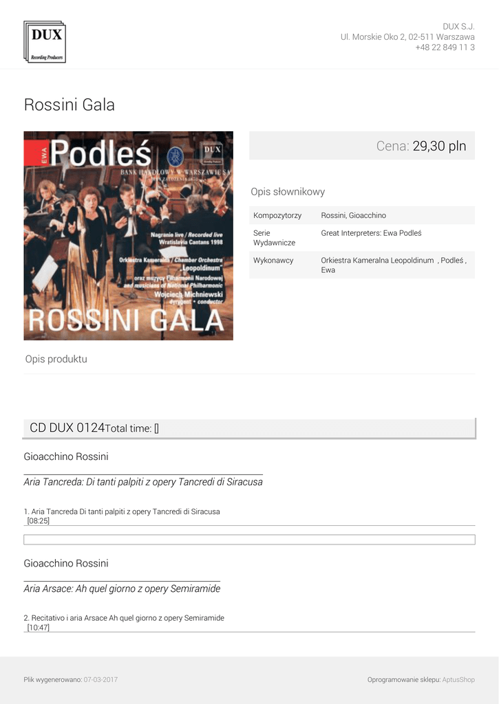 DUX S.J. Ul. Morskie Oko 2, 02-511 Warszawa +48 22 849 11 3 Rossini Gala Cena: 29,30 pln Opis słownikowy Kompozytorzy Rossini, Gioacchino ∎ Serie Wydawnicze Great Interpreters: Ewa Podleś Wykonawcy Orkiestra Kameralna Leopoldinum ∎, Podleś , Ewa ∎ Opis produktu CD DUX 0124Total time: [] Gioacchino Rossini Aria Tancreda: Di tanti palpiti z opery Tancredi di Siracusa 1. Aria Tancreda Di tanti palpiti z opery Tancredi di Siracusa [08:25] Gioacchino Rossini Aria Arsace: Ah quel giorno z opery Semiramide 2. Recitativo i aria Arsace Ah quel giorno z opery Semiramide [10:47] Plik wygenerowano: 07-03-2017 Oprogramowanie sklepu: AptusShop DUX S.J. Ul. Morskie Oko 2, 02-511 Warszawa +48 22 849 11 3 Gioacchino Rossini Aria Calbo: Non temer z opery Maometto II 3. Aria Calbo Non temer d`un basso afetto z opery Maometto II [07:47] Gioacchino Rossini Aria Malcolma: Mura felici z opery La donna del lago 4. Aria Malcoma Mura felici z opery La donna del lago [09:49] Gioacchino Rossini Uwertura z opery Il barbiere di Seviglia 5. Uwertura Il barbieri di Seviglia [07:25] Gioacchino Rossini Aria Rosiny: Una voce poco z opery Il barbiere di Siviglia 6. Aria Rosiny Una voce poco fa z opery Il barbieri di Seviglia [05:58] Gioacchino Rossini Aria Isabeli: Pensa alla Patria z opery L’Italiana in Algeri 7. Aria Isabelli Pensa alla Patria z opery L`Italiana in Algeri [06:27] Plik wygenerowano: 07-03-2017 Oprogramowanie sklepu: AptusShop DUX S.J. Ul. Morskie Oko 2, 02-511 Warszawa +48 22 849 11 3 Gioacchino Rossini Aria Isabelli: Cruda sorte z opery L’Italiana in Algeri 8. Aria Isabelli Cruda sorte z opery L`Italiana in Algeri [04:12] Wykonawcy: Orkiestra Kameralna Leopoldinum Ewa Podleś /kontralt/ Wojciech Michniewski /dyrygent/ Plik wygenerowano: 07-03-2017 Powered by TCPDF (www.tcpdf.org) Oprogramowanie sklepu: AptusShop