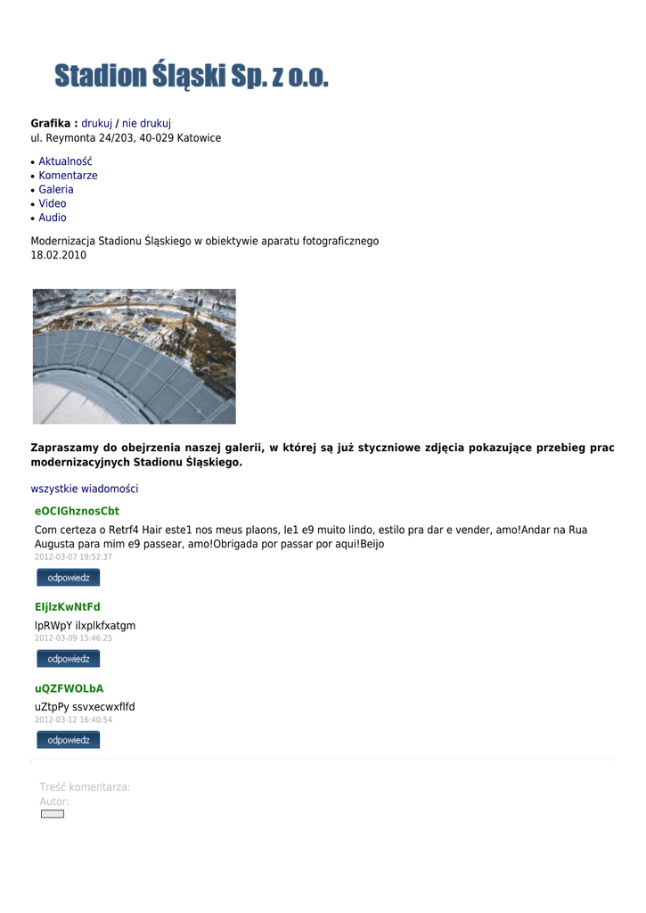 Grafika : drukuj / nie drukuj ul. Reymonta 24/203, 40-029 Katowice ● ● ● ● ● Aktualność Komentarze Galeria Video Audio Modernizacja Stadionu Śląskiego w obiektywie aparatu fotograficznego 18.02.2010 Zapraszamy do obejrzenia naszej galerii, w której są już styczniowe zdjęcia pokazujące przebieg prac modernizacyjnych Stadionu Śląskiego. wszystkie wiadomości eOCIGhznosCbt Com certeza o Retrf4 Hair este1 nos meus plaons, le1 e9 muito lindo, estilo pra dar e vender, amo!Andar na Rua Augusta para mim e9 passear, amo!Obrigada por passar por aqui!Beijo 2012-03-07 19:52:37 EIjlzKwNtFd lpRWpY ilxplkfxatgm 2012-03-09 15:46:25 uQZFWOLbA uZtpPy ssvxecwxflfd 2012-03-12 16:40:54 Treść komentarza: Autor: Przepisz token jeżeli chcesz wysłać powyższy komentarz to NIE ZAZNACZAJ tego pola dodaj komentarz