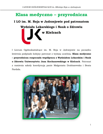I LICEUM OGÓLNOKSZTAŁCĄCE im. Mikołaja Reja w Jędrzejowie Klasa medyczno – przyrodnicza I LO im. M. Reja w Jędrzejowie pod patronatem Wydziału Lekarskiego i Nauk o Zdrowiu w Kielcach I Liceum Ogólnokształcące im. M. Reja w Jędrzejowie na początku kwietnia podpisało kolejny patronat z wyższą uczelnią. Klasa medyczno – przyrodnicza rozpoczęła współpracę z Wydziałem Lekarskim i Nauk o Zdrowiu Uniwersytetu Jana Kochanowskiego w Kielcach. Patronat z ramienia szkoły koordynują panie Małgorzata Drabiszewska i Beata Pardała. 1 I LICEUM OGÓLNOKSZTAŁCĄCE im. Mikołaja Reja w Jędrzejowie Już 7 kwietnia uczniowie tej klasy zostali zaproszeni na obchody Światowego Dnia Zdrowia. Licealiści mogli posłuchać ciekawych wykładów na temat przyczyn i profilaktyki cukrzycy, czy nowej piramidy żywienia. Uczestniczyli w zajęciach w prosektorium, pracowni multimedialnej, pracowni symulacji medycznej. Uczniowie mieli również możliwość zapoznać się ze strukturą Wydziału, który tworzą 4 Instytuty: Nauk Medycznych, Fizjoterapii, Pielęgniarstwa i Położnictwa oraz Zdrowia Publicznego. Szczególnym zainteresowaniem cieszyła się medycyna uruchomiona od października 2015 r. Władze uczelni podkreślały, że o jedno miejsce na kierunku lekarskim walczyło ponad 40 chętnych, co pozwoliło uzyskać bardzo wysoki próg punktowy ( 90% z matury rozszerzonej z biologii i chemii) i gwarantowało przyjecie najlepszych absolwentów liceów z całej Polski. 2 I LICEUM OGÓLNOKSZTAŁCĄCE im. Mikołaja Reja w Jędrzejowie Patronat Wydziału Lekarskiego i Nauk o Zdrowiu UJK to wielki prestiż i wyróżnienie dla naszego liceum oraz znakomita promocja klasy medyczno – przyrodniczej, która funkcjonuje dopiero od tego roku. 3 I LICEUM OGÓLNOKSZTAŁCĄCE im. Mikołaja Reja w Jędrzejowie W ofercie kształcenia I LO na rok 2016/17 znajdują się dwa kierunki przyrodnicze: klasa matematyczno – przyrodnicza (rozszerzona matematyka, biologia i chemia) i klasa medyczno – przyrodnicza (rozszerzona biologia i chemia, przedmioty uzupełniające: elementy ratownictwa medycznego, fizyka w medycynie, łacina medyczna). Propozycja tych klas i dobór rozszerzeń podyktowany jest rekrutacją na kierunki lekarskie w naszym kraju. Większość uczelni medycznych punktuje dwa przedmioty : biologię i chemię lub fizykę, a 4 uniwersytety: Jagielloński, Warszawski, Wrocławski i Warmińsko - Mazurski trzy przedmioty: biologię, chemię lub fizykę i matematykę. Uczniowie klas I B i I C uczestniczący w wyjeździe byli bardzo zadowoleni z zajęć na uczelni. Duże wrażenie zrobiły na nich pracownie naukowo – dydaktyczne wyposażone w sprzęt i symulatory medyczne najnowszej 4 I LICEUM OGÓLNOKSZTAŁCĄCE im. Mikołaja Reja w Jędrzejowie generacji. Taka sala ratownictwa medycznego byłaby potrzebna w naszej szkole. O pozyskanie funduszy na ten cel będzie się starało Stowarzyszenie Przyjaciół Liceum Reja w Jędrzejowie. 5