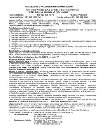 OGŁOSZENIE O PRZETARGU NIEOGRANICZONYM Koksownia Przyjaźń S.A. z siedzibą w Dąbrowie Górniczej 42-523 Dąbrowa Górnicza, ul. Koksownicza 1 KRS 0000445684 NIP 629-225-65-76 Kapitał zakładowy 831 698 500,00 zł REGON 278093210 Kapitał wpłacony 831 698 500,00 zł ogłasza przetarg nieograniczony jednostopniowy prowadzony w oparciu o Instrukcję w sprawie zasad i trybu zamawiania dostaw, robót i usług oraz zatwierdzania cen w Koksowni Przyjaźń S.A. na: „Ubezpieczenie Mienia, Ubezpieczenie NNW Pracowników Służby Zabezpieczenia oraz Ubezpieczenie Odpowiedzialności Cywilnej Koksowni Przyjaźń S.A.”. Przedmiotem zamówienia jest: ubezpieczenie mienia, ubezpieczenie NNW Pracowników Służby Zabezpieczenia oraz ubezpieczenie Odpowiedzialności Cywilnej Spółki na następujące zakresy ubezpieczenia: 1. ubezpieczenie mienia od ognia i innych zdarzeń losowych, 2. ubezpieczenie maszyn i urządzeń od awarii, 3. ubezpieczenie maszyn i urządzeń od szkód elektrycznych, 4. ubezpieczenie sprzętu elektronicznego, 5. ubezpieczenie odpowiedzialności cywilnej z tytułu prowadzenia działalności gospodarczej lub użytkowania mienia, 6. ubezpieczenie wartości pieniężnych od kradzieży z włamaniem i rabunku, 7. ubezpieczenie następstw nieszczęśliwych wypadków pracowników Służby Zabezpieczenia Koksowni Przyjaźń S.A. Termin (okres) realizacji zamówienia: Spółka wymaga, aby umowa generalna została zawarta na okres od 1 lipca 2013 roku do 30 czerwca 2016 roku. Umowy ubezpieczenia objęte umową generalną, zawierane będą na roczne okresy ubezpieczenia 00 Termin składania ofert upływa dnia: 03.06.2013 r. o godz. 9 Wysokość wadium: 50 000 PLN Miejsce składania ofert: zamkniętą kopertę zawierającą ofertę należy złożyć w siedzibie Spółki – pokój nr 021 w Kancelarii Ogólnej budynku Zarządu Koksowni Przyjaźń S.A., ul. Koksownicza 1, 42-523 Dąbrowa Górnicza z dopiskiem „Dla Działu Przetargów”. Koperta powinna być oznaczona: „Ubezpieczenie Mienia, Ubezpieczenie NNW Pracowników Służby Zabezpieczenia oraz Ubezpieczenie Odpowiedzialności Cywilnej Koksowni Przyjaźń S.A.”. Termin i miejsce otwarcia ofert: Komisyjne otwarcie ofert nastąpi na posiedzeniu jawnym Komisji 05 ds. Przetargów w dniu 03.06.2013 r. o godzinie 9 w Koksowni Przyjaźń Sp. z o.o., 42-523 Dąbrowa Górnicza, ul. Koksownicza 1 w budynku „STOŁÓWKA” (znajdującym się za bramą główną Koksowni), sala konferencyjna na I-szym piętrze. Warunkiem udziału w postępowaniu o udzielenie zamówienia jest zaakceptowanie Zasad obowiązujących oferentów uczestniczących w przetargach na dostawy, roboty i usługi w Koksowni Przyjaźń S.A. oraz wniesienie wadium w formie i terminie wskazanym w Specyfikacji Istotnych Warunków Zamówienia. Materiały przetargowe zawierające Specyfikację Istotnych Warunków Zamówienia wraz z Zestawem dokumentów wymaganych od oferentów oraz informacją o Zasadach obowiązujących oferentów uczestniczących w przetargach na dostawy, roboty i usługi w Koksowni Przyjaźń S.A. można odebrać osobiście w Koksowni Przyjaźń S.A. w Dąbrowie Górniczej, 42-523 Dąbrowa Górnicza, ul. Koksownicza 1, w Dziale Przetargów, budynek Wodnik, pokój nr 212. Materiały przetargowe mogą być również przesłane oferentom drogą pocztową lub drogą elektroniczną w formacie PDF, po uprzednim przedłożeniu ogłaszającemu potwierdzenia dokonania wpłaty. Cena materiałów przetargowych wynosi 100 PLN + 23% podatek VAT – płatna w kasie Spółki lub na konto PKO BP S.A. Oddział w Sosnowcu nr rachunku: 71 1020 2498 0000 8202 0019 1205 Wizja lokalna: Na wniosek oferentów Zamawiający zorganizuje wizję lokalną w zakresie objętym przedmiotem zamówienia, w terminie uzgodnionym z ogłaszającym, jednakże nie później niż na 6 (sześć) dni kalendarzowych przed terminem składania ofert (nie wlicza się dnia składania ofert). Warunkiem uczestnictwa w wizji lokalnej jest wykupienie Specyfikacji Istotnych Warunków Zamówienia. Upoważnionymi do kontaktów z oferentami w zakresie procedury przetargowej są: Janusz Osmólski Kierownik Działu Przetargów tel. 32/757-56-54, fax. 32/757-50-43, e-mail: [email protected] Beata Janas-Kubala Specjalista ds. Przetargów tel. 32/757-56-59, fax. 32/757-50-43, e-mail: [email protected]