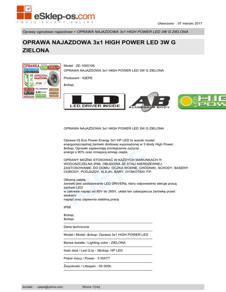 Utworzono : 07 marzec 2017 Oprawy ogrodowe najazdowe > OPRAWA NAJAZDOWA 3x1 HIGH POWER LED 3W G ZIELONA OPRAWA NAJAZDOWA 3x1 HIGH POWER LED 3W G ZIELONA Model : ZE-1000106 OPRAWA NAJAZDOWA 3x1 HIGH POWER LED 3W G ZIELONA Producent : IQEPE OPRAWA NAJAZDOWA 3x1 HIGH POWER LED 3W G ZIELONA Oprawa IQ Eco Power Energy 3x1 HP LED to wysoki model energooszczędnej żarówki diodowej wyposażonej w 3 diody High Power.. Oprawki zapewniają zmniejszenie zużycia energii o 90% oraz mniejszą emisję ciepła. E P E Q OPRAWY MOŻNA STOSOWAĆ W KAŻDYCH WARUNKACH !!! WODOSZCZELNA IP68. OBUDOWA ZE STALI NIERDZEWNEJ. ZASTOSOWANIE..DO DOMU, OCZKA WODNE, CHODNIKI, SCHODY, BASENY OGRODY, PODJAZDY, ALEJKI, BARY, DYSKOTEKI ITP. Główną zaletą żarówki jest zastosowanie LED DRIVERa, który odpowiednio steruje pracą żarówki LED w zakresie napięć od 85V do 265V, układ ten zabezpiecza żarówkę przed skokami napięć oraz zapewnia stabilną pracę IP68 I -----------------------------------------------------------------------------Dane techniczne -----------------------------------------------------------------------------Model / Model - Oprawa 3x1 HIGH POWER LED -----------------------------------------------------------------------------Barwa światła / Lighting color - ZIELONA -----------------------------------------------------------------------------Ilość diod / Led Q.ty - 3 HP LED -----------------------------------------------------------------------------Pobór mocy / Power - 3 WATT -----------------------------------------------------------------------------Żwyotność / Lifespan - 50 000h. ------------------------------------------------------------------------------ kontakt : - [email protected] Strona 1/{nb} Utworzono : 07 marzec 2017 Oprawy ogrodowe najazdowe > OPRAWA NAJAZDOWA 3x1 HIGH POWER LED 3W G ZIELONA OPRAWA NAJAZDOWA 3x1 HIGH POWER LED 3W G ZIELONA Zasilanie / Voltage - 85V-265V -----------------------------------------------------------------------------Wydajność / Efficiency - 280Lm -----------------------------------------------------------------------------Kąt świecenia / Viewing angle - 60-90 stopni -----------------------------------------------------------------------------Wymiary /Size - 100 / 85 mm ----------------------------------------------------------------------------- Średnica /Diameter - 70mm -----------------------------------------------------------------------------Układ stabilizujacy - CCD LED DRIVER ----------------------------------------------------------------------------- E P E Q Cena : 49,99 zł Brutto ( 40,64 zł Netto) I Dostępność: Produkt dostępny w naszym sklepie od 25 lipiec 2013 kontakt : - [email protected] Strona 2/{nb}