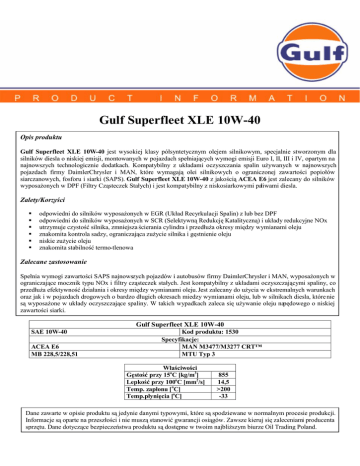 Gulf Superfleet XLE 10W-40 Opis produktu Gulf Superfleet XLE 10W-40 jest wysokiej klasy półsyntetycznym olejem silnikowym, specjalnie stworzonym dla silników diesla o niskiej emisji, montowanych w pojazdach spełniających wymogi emisji Euro I, II, III i IV, opartym na najnowszych technologicznie dodatkach. Kompatybilny z układami oczyszczania spalin używanych w najnowszych pojazdach firmy DaimlerChrysler i MAN, które wymagają olei silnikowych o ograniczonej zawartości popiołów siarczanowych, fosforu i siarki (SAPS). Gulf Superfleet XLE 10W-40 z jakością ACEA E6 jest zalecany do silników wyposażonych w DPF (Filtry Cząsteczek Stałych) i jest kompatybilny z niskosiarkowymi paliwami diesla. Zalety/Korzyści odpowiedni do silników wyposażonych w EGR (Układ Recyrkulacji Spalin) z lub bez DPF odpowiedni do silników wyposażonych w SCR (Selektywną Redukcję Katalityczną) i układy redukcyjne NOx utrzymuje czystość silnika, zmniejsza ścierania cylindra i przedłuża okresy między wymianami oleju znakomita kontrola sadzy, ograniczająca zużycie silnika i gęstnienie oleju niskie zużycie oleju znakomita stabilność termo-tlenowa Zalecane zastosowanie Spełnia wymogi zawartości SAPS najnowszych pojazdów i autobusów firmy DaimlerChrysler i MAN, wyposażonych w ograniczające mocznik typu NOx i filtry cząsteczek stałych. Jest kompatybilny z układami oczyszczającymi spaliny, co przedłuża efektywność działania i okresy między wymianami oleju. Jest zalecany do użycia w ekstremalnych warunkach oraz jak i w pojazdach drogowych o bardzo długich okresach miedzy wymianami oleju, lub w silnikach diesla, które nie są wyposażone w układy oczyszczające spaliny. W takich wypadkach zaleca się używanie oleju napędowego o niskiej zawartości siarki. Gulf Superfleet XLE 10W-40 SAE 10W-40 ACEA E6 MB 228,5/228,51 Kod produktu: 1530 Specyfikacje: MAN M3477/M3277 CRT™ MTU Typ 3 Właściwości Gęstość przy 15oC [kg/m3] Lepkość przy 100oC [mm2/s] Temp. zapłonu [oC] Temp.płynięcia [oC] 855 14,5 >200 -33 Dane zawarte w opisie produktu są jedynie danymi typowymi, które są spodziewane w normalnym procesie produkcji. Informacje są oparte na przeszłości i nie muszą stanowić gwarancji osiągów. Zawsze kieruj się zaleceniami producenta sprzętu. Dane dotyczące bezpieczeństwa produktu są dostępne w twoim najbliższym biurze Oil Trading Poland.