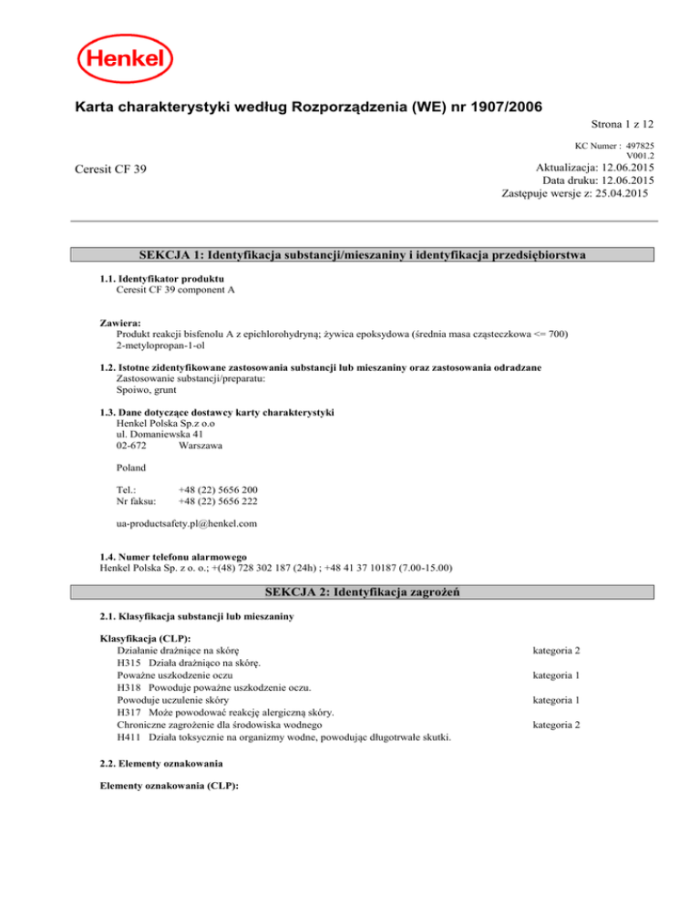 Karta charakterystyki według Rozporządzenia (WE) nr 1907/2006 Strona 1 z 12 KC Numer : 497825 V001.2 Aktualizacja: 12.06.2015 Data druku: 12.06.2015 Zastępuje wersje z: 25.04.2015 Ceresit CF 39 SEKCJA 1: Identyfikacja substancji/mieszaniny i identyfikacja przedsiębiorstwa 1.1. Identyfikator produktu Ceresit CF 39 component A Zawiera: Produkt reakcji bisfenolu A z epichlorohydryną; żywica epoksydowa (średnia masa cząsteczkowa <= 700) 2-metylopropan-1-ol 1.2. Istotne zidentyfikowane zastosowania substancji lub mieszaniny oraz zastosowania odradzane Zastosowanie substancji/preparatu: Spoiwo, grunt 1.3. Dane dotyczące dostawcy karty charakterystyki Henkel Polska Sp.z o.o ul. Domaniewska 41 02-672 Warszawa Poland Tel.: Nr faksu: +48 (22) 5656 200 +48 (22) 5656 222 [email protected] 1.4. Numer telefonu alarmowego Henkel Polska Sp. z o. o.; +(48) 728 302 187 (24h) ; +48 41 37 10187 (7.00-15.00) SEKCJA 2: Identyfikacja zagrożeń 2.1. Klasyfikacja substancji lub mieszaniny Klasyfikacja (CLP): Działanie drażniące na skórę H315 Działa drażniąco na skórę. Poważne uszkodzenie oczu H318 Powoduje poważne uszkodzenie oczu. Powoduje uczulenie skóry H317 Może powodować reakcję alergiczną skóry. Chroniczne zagrożenie dla środowiska wodnego H411 Działa toksycznie na organizmy wodne, powodując długotrwałe skutki. 2.2. Elementy oznakowania Elementy oznakowania (CLP): kategoria 2 kategoria 1 kategoria 1 kategoria 2 KC Numer: 497825 V001.2 Ceresit CF 39 Strona 2 z 12 Piktogram określający rodzaj zagrożenia: Hasło ostrzegawcze: Niebezpieczeństwo Zwrot określający zagrożenie: H315 Działa drażniąco na skórę. H317 Może powodować reakcję alergiczną skóry. H318 Powoduje poważne uszkodzenie oczu. H411 Działa toksycznie na organizmy wodne, powodując długotrwałe skutki. Zwrot określający środki ostrożności: P102 Chronić przed dziećmi. P261 Unikać wdychania par. P273 Unikać uwolnienia do środowiska. P280 Stosować rękawice ochronne/ ochronę oczu. P302+P352 W PRZYPADKU KONTAKTU ZE SKÓRĄ: Umyć dużą ilością wody. P305+P351+P338 W PRZYPADKU DOSTANIA SIĘ DO OCZU: Ostrożnie płukać wodą przez kilka minut. Wyjąć soczewki kontaktowe, jeżeli są i można je łatwo usunąć. P405 Przechowywać pod zamknięciem. P501 Zawartość/pojemnik usuwać zgodnie z krajowymi przepisami. 2.3. Inne zagrożenia Osoby, które są uczulone na epoksydy, powinny unikać kontaktu z tym produktem SEKCJA 3: Skład/informacja o składnikach 3.2. Mieszaniny Ogólna charakterystyka chemiczna: podkład, grunt, spoiwo Podstawowe składniki preparatu: kombinacja żywiczno- epoksydowa KC Numer: 497825 V001.2 Ceresit CF 39 Strona 3 z 12 Informacje o składnikach według Rozporządzenia WE Nr 1272/2008: Niebezpieczne składniki Nr CAS Numer WE Nr rejestracyjny REACH 500-033-5 500-033-5 01-2119456619-26 Zawartość Klasyfikacja 40- < 60 % Skin Irrit. 2 H315 Skin Sens. 1 H317 Eye Irrit. 2 H319 Aquatic Chronic 2 H411 Ksylen-mieszanna izomerow 1330-20-7 215-535-7 01-2119488216-32 5- < 20 % Asp. Tox. 1 H304 Acute Tox. 4; Wdychanie H332 Acute Tox. 4; Przenikanie przez skórę H312 Skin Irrit. 2 H315 Flam. Liq. 3 H226 2-metylopropan-1-ol 78-83-1 201-148-0 01-2119484609-23 5- < 10 % Flam. Liq. 3 H226 STOT SE 3 H335 Skin Irrit. 2 H315 Eye Dam. 1 H318 STOT SE 3 H336 Produkt reakcji bisfenolu A z epichlorohydryną; żywica epoksydowa (średnia masa cząsteczkowa <= 700) 25068-38-6 Pełne brzmienie zwrotów H wymienione jest w sekcji 16 ' Inne informacje". Substancje nie sklasyfikowane, dla których określono najwyższe dopuszczalne stężenia w środowisku pracy. SEKCJA 4: Środki pierwszej pomocy 4.1. Opis środków pierwszej pomocy Wskazówki ogólne: W przypadku dolegliwości zdrowotnych skonsultować się z lekarzem. Przedostanie się do dróg oddechowych: Zapewnić poszkodowanemu oddychanie świeżym powietrzem, w przypadku utrzymywania się dolegliwości skonsultować się z lekarzem. Kontakt ze skórą: Przepłukać pod bieżącą wodą z mydlem. Zastosować krem pielęgnacyjny. Ściągnąć zabrudzone ubrania. Kontakt z oczami Natychmiast przepłukać łagodnym strumieniem wody lub roztworem do płukania oczu (przez min. 5 minut). Jeśli oczy bolą w dalszym ciągu (silne, bóle, wrażliwość na światło, upośledzenie widzenia), płukać w dalszym ciągu i udać się do lekarza lub szpitala. Połknięcie Przepłukać jamę ustną, wypić 1-2 szklanki wody, skonsultować się z lekarzem. 4.2. Najważniejsze ostre i opóźnione objawy oraz skutki narażenia Oczy: podrażnienie, zapalenie spojówek. Skóra: zaczerwienienie, podrażnienie. Może powodować reakcję alergiczną skóry. KC Numer: 497825 V001.2 Ceresit CF 39 Strona 4 z 12 4.3. Wskazania dotyczące wszelkiej natychmiastowej pomocy lekarskiej i szczególnego postępowania z poszkodowanym Patrz sekcja: Opis środków pierwszej pomocy SEKCJA 5: Postępowanie w przypadku pożaru 5.1. Środki gaśnicze Odpowiednie środki gaśnicze: dwutlenek węgla, piana, proszek, rozpylony strumień wody pod ciśnieniem Środki gaśnicze, które nie mogą być używane ze względów bezpieczeństwa: strumień wody pod wysokim ciśnieniem 5.2. Szczególne zagrożenia związane z substancją lub mieszaniną Podczas pożaru wyzwalają się tlenki węgla(CO) i dwutlenki węgla ( CO2) 5.3. Informacje dla straży pożarnej Stosować indywidualne wyposażenie ochronne. Stosować aparaty oddechowe z niezależnym obiegiem powietrza. SEKCJA 6: Postępowanie w przypadku niezamierzonego uwolnienia do środowiska 6.1. Indywidualne środki ostrożności, wyposażenie ochronne i procedury w sytuacjach awaryjnych Stosować środki ochrony indywidualnej. Zapewnić należytą wentylację. Unikać kontaktu z oczami i skórą. Unikać poślizgnięcia się na rozlanym produkcie. 6.2. Środki ostrożności w zakresie ochrony środowiska Nie dopuścić do przedostania się do kanalizacji / wód powierzchniowych / gruntowych. 6.3. Metody i materiały zapobiegaj