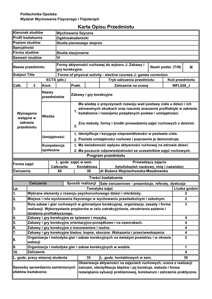 Politechnika Opolska Wydział Wychowania Fizycznego i Fizjoterapii Karta Opisu Przedmiotu Kierunek studiów Profil kształcenia Poziom studiów Specjalność Forma studiów Semestr studiów Wychowanie fizyczne Ogólnoakademicki Studia pierwszego stopnia Studia stacjonarne VI Formy aktywności ruchowej do wyboru J: Zabawy i gry korekcyjne. Nazwa przedmiotu Subject Title Całk. 3 Wymagania wstępne w zakresie przedmiotu Nauki podst. (T/N) N Forms of physical activity - elective courses J: games correction ECTS (pkt.) Tryb zaliczenia przedmiotu Kod przedmiotu Zaliczenie na ocenę Kont. Prakt. Nazwy przedmiotów Zabawy i gry korekcyjne WFL026_J Ma wiedzę o przyczynach rozwoju wad postawy ciała u dzieci i ich zdrowotnych skutkach oraz rozumie znaczenie profilaktyki w zakresie 1. kształcenia i rozwijania pożądanych postaw i umiejętności. Wiedza 2. Zna metody, formy i środki prowadzenia zajęć ruchowych z dziećmi. Umiejętności 1. Identyfikuje i koryguje nieprawidłowości w postawie ciała. 2. Posiada umiejętności ruchowe i poprawnie je demonstruje. Kompetencje społeczne 1. Ma świadomość wpływu aktywności ruchowej na zdrowie dzieci. 2. Ma poczucie odpowiedzialności za uczestników zajęć ruchowych. Program przedmiotu Forma zajęć Ćwiczenia L. godz. zajęć w sem. Prowadzący zajęcia Całkowita Kontaktowa (tytuł/stopień naukowy, imię i nazwisko) 65 30 dr Bożena Wojciechowska-Maszkowska | Treści kształcenia Ćwiczenia Sposób realizacji Lp. 1. Sale ćwiczeniowe - prezentacje, referaty, dyskusja Tematyka zajęć Liczba godzin Wybrane elementy z rozwoju psychoruchowego dzieci i młodzieży. 2 2. Miejsce i rola wychowania fizycznego w wychowaniu przedszkolnym i szkolnym. 2 Rola zabaw i gier ruchowych w gimnastyce korekcyjnej, organizacja, zasady i forma realizacji. Wykorzystanie przyborów w celu uatrakcyjnienia, utrudnienia zadania i działania profilaktycznego. Zabawy i gry korekcyjne ze śpiewem i muzyką. Zabawy i gry korekcyjne orientacyjno-porządkowe i na czworakach. Zabawy i gry korekcyjne z mocowaniem i rzutne. Zabawy i gry korekcyjne bieżne, kopne, skoczne. Wskazania i przeciwwskazania. Organizacja i metodyka gier i zabaw korekcyjnych na świeżym powietrzu i w okresie wakacji Organizacja i metodyka gier i zabaw korekcyjnych w wodzie Zaliczenie 3 3. 4. 5. 6. 7. 8. 9. 10. L. godz. pracy własnej studenta 4 4 4 4 2 1 4 35 L. godz. kontaktowych w sem. 30 Obserwacja aktywności na zajęciach ruchowych, ocena z realizacji Sposoby sprawdzenia zamierzonych ćwiczeń, identyfikacja błędów i jej korekcja, metoda i forma efektów kształcenia rozwiązania sytuacji problemowej, kolokwium i zaliczenie praktyczne. Zna zasady planowania i cele gier i zabaw korekcyjnych oraz 1. ma wiedzę o metodach i formach ich prowadzenia. Wiedza Umiejętności Efekty kształcenia dla przedmiotu - po zakończonym cyklu kształcenia Zna zasady organizacyjne i uczestnictwa dzieci w grach i 2. zabawach korekcyjnych z uwzględnieniem wady postawy ciała i celu profilaktycznego. Identyfikuje i koryguje nieprawidłowości postawy ciała w toku 1. realizacji gier i zabaw korekcyjnych. Potrafi dobrać i zastosować przybory w grach i zabawach 2. korekcyjnych. Objaśnia ćwiczenia i zadania ruchowe zgodnie z terminologią nauk o kulturze fizycznej. Potrafi wykorzystać muzykę i 3. ćwiczenia rytmiczne w celu uatrakcyjnienia zajęć ruchowych. Posiada umiejętności ruchowe i poprawnie je demonstruje 4. adekwatnie do celu zajęć i wieku uczestników. 1. Kompetencje społeczne W grupie komunikuje się w sposób zrozumiały. Identyfikuje się z grupą i wykazuje troskę o współćwiczących. Ma świadomość prowadzenie zindywidualizowanego programu gier i zabaw korekcyjnych w zależności od wieku, 2. umiejętności i sprawności fizycznej, doświadczeń oraz zróżnicowania wad postawy ciała. Ma poczucie odpowiedzialności za uczestników zajęć i 3. akcentuje pozytywne uwagi i dowartościowuje uczestników. Jest świadomy znaczenia wysokiego poziomu sprawności 4. fizycznej w działalności zawodowej oraz rozwija systematyczność, odwagę i samodyscyplinę. Metody dydaktyczne: Problemowa: aktywizujaca - dyskusja, praktyczna: pokaz, ćwiczenia, problemowa - identyfikacja błędów, rozwiązywanie problemów Forma i warunki zaliczenia przedmiotu: Zaliczenie praktyczne (elementy oceny: przygotowanie i przeprowadzenie zabaw i gier korekcyjnych, praca głosem, organizacja i komunikacja, zastosowanie przyborów i przyrządów, bezpieczeństwo, atrakcyjne i efektywne formy i treści prezentacji programu ćwiczeń, aktywność, samoocena). Literatura podstawowa: GÓRNIAK K., ARASYMOWICZ S.: Korektywa w przedszkolu. Konferencja metodyczna 28-29 maj 1996 r. [1] Biblioteka Polska Towarzystwa Naukowego Kultury Fizycznej, t. V, Warszawa 1996. OWCZAREK S., BONDAROWICZ M.: Zabawy i gry ruchowe w gimnastyce korekcyjnej, Wyd. Szkolne I [2] Pedagogiczne Spółka Akcyjna, Warszawa 1997. SAWCZYN S., KARNIEWICZ J., KOCHANOWICZ K., DROBNIK A., SZEWC W.: Gimnastyka korekcyjna w [3] szkole, wyd. Sport, Bydgoszcz, cz. 1 1998, cz.2 1999 Literatura uzupełniająca: OWCZAREK S.; Korekcja wad postawy. Pływanie i ćwiczenia w wodzie, Sport i Zdrowie, Wyd. Szkolne I [1] Pedagogiczne Spółka Akcyjna, Warszawa 1999. ZWIERZCHOWSKA A., GAWLIK K.: Korektywa dzieci i młodzieży z dysfunkcjami wzroku i słuchu, AWF [2] w Katowicach, Katowice 2006. ______________ * niewłaściwe przekreślić ………………………………………………….. (kierownik jednostki organizacyjnej/bezpośredni przełożony: pieczęć/podpis ………………………………………………………. (Dziekan Wydziału pieczęć/podpis)