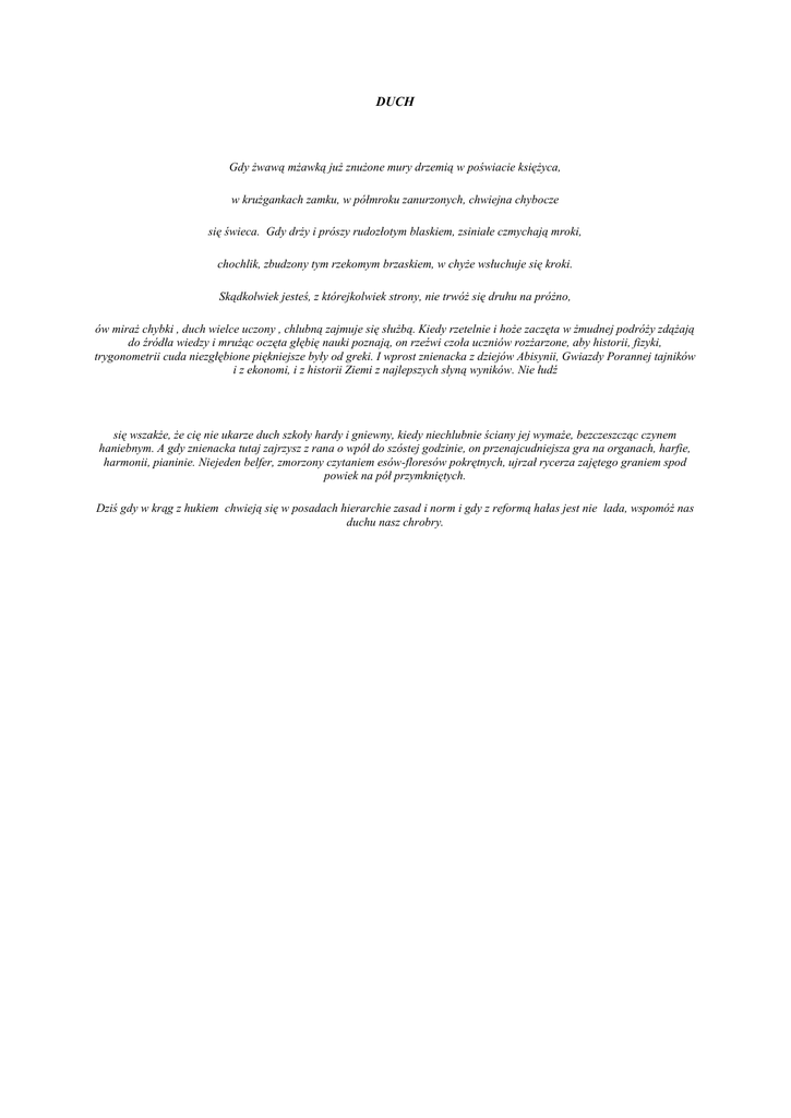 DUCH Gdy żwawą mżawką już znużone mury drzemią w poświacie księżyca, w krużgankach zamku, w półmroku zanurzonych, chwiejna chybocze się świeca. Gdy drży i prószy rudozłotym blaskiem, zsiniałe czmychają mroki, chochlik, zbudzony tym rzekomym brzaskiem, w chyże wsłuchuje się kroki. Skądkolwiek jesteś, z którejkolwiek strony, nie trwóż się druhu na próżno, ów miraż chybki , duch wielce uczony , chlubną zajmuje się służbą. Kiedy rzetelnie i hoże zaczęta w żmudnej podróży zdążają do źródła wiedzy i mrużąc oczęta głębię nauki poznają, on rzeźwi czoła uczniów rozżarzone, aby historii, fizyki, trygonometrii cuda niezgłębione piękniejsze były od greki. I wprost znienacka z dziejów Abisynii, Gwiazdy Porannej tajników i z ekonomi, i z historii Ziemi z najlepszych słyną wyników. Nie łudź się wszakże, że cię nie ukarze duch szkoły hardy i gniewny, kiedy niechlubnie ściany jej wymaże, bezczeszcząc czynem haniebnym. A gdy znienacka tutaj zajrzysz z rana o wpół do szóstej godzinie, on przenajcudniejsza gra na organach, harfie, harmonii, pianinie. Niejeden belfer, zmorzony czytaniem esów-floresów pokrętnych, ujrzał rycerza zajętego graniem spod powiek na pół przymkniętych. Dziś gdy w krąg z hukiem chwieją się w posadach hierarchie zasad i norm i gdy z reformą hałas jest nie lada, wspomóż nas duchu nasz chrobry.